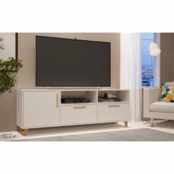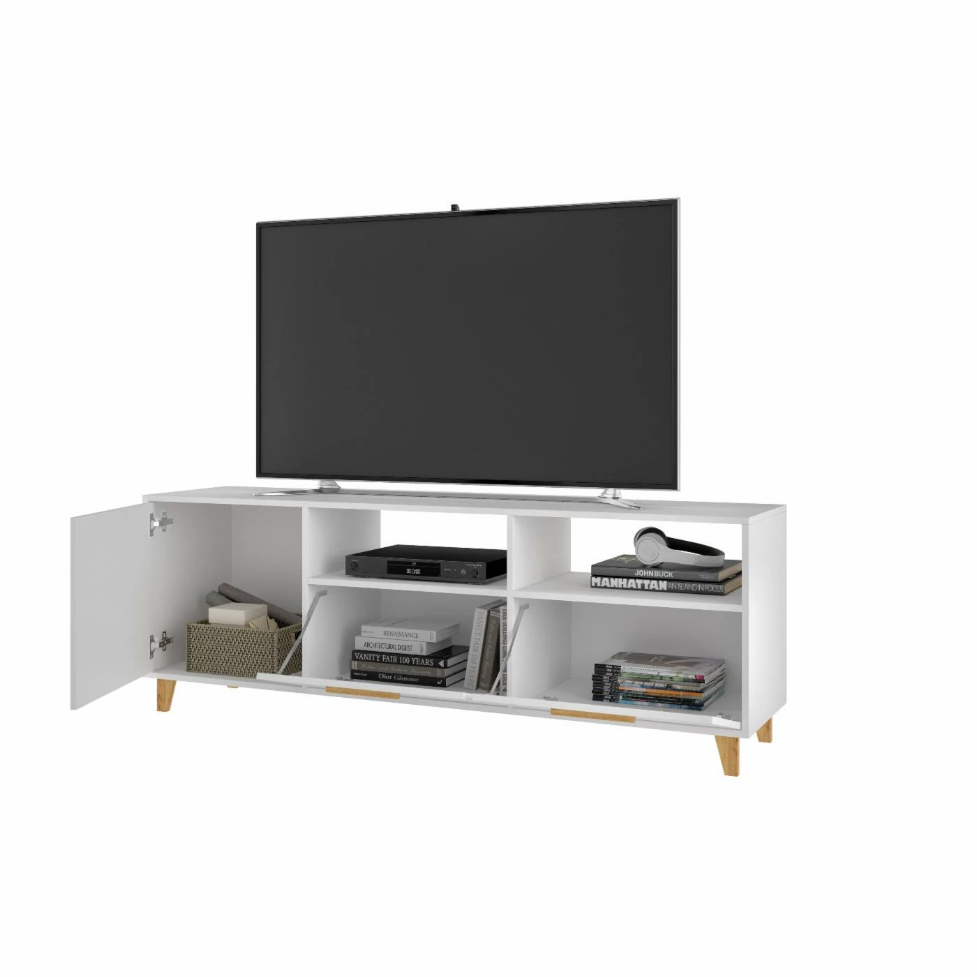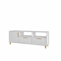 Complete your living room with the Manhattan Comfort Herald Mid-Century/Modern TV Stand – White. This mid-century TV stand has plenty of storage space for all your needs. With two open spaces, this piece will allow for easy access to your electronics. The three hidden compartments give you space to store anything you would prefer to be hidden away.