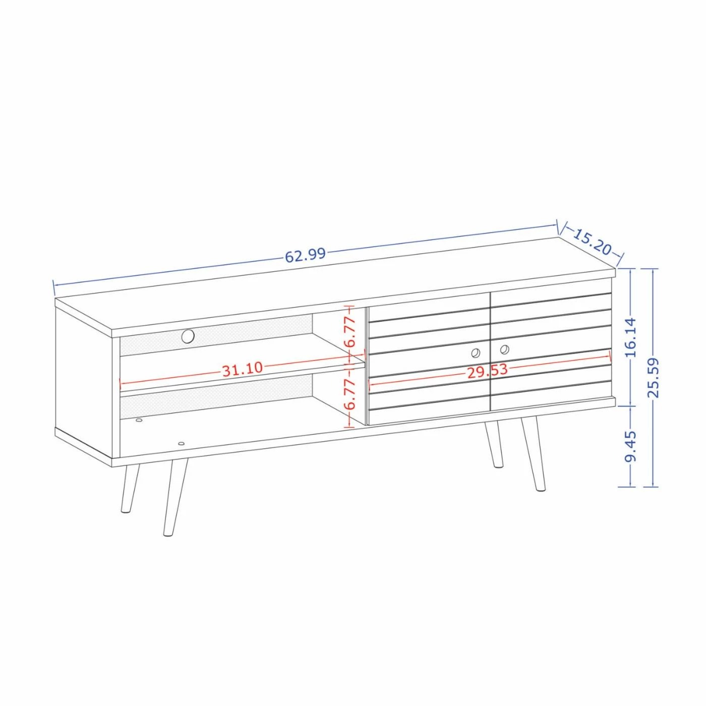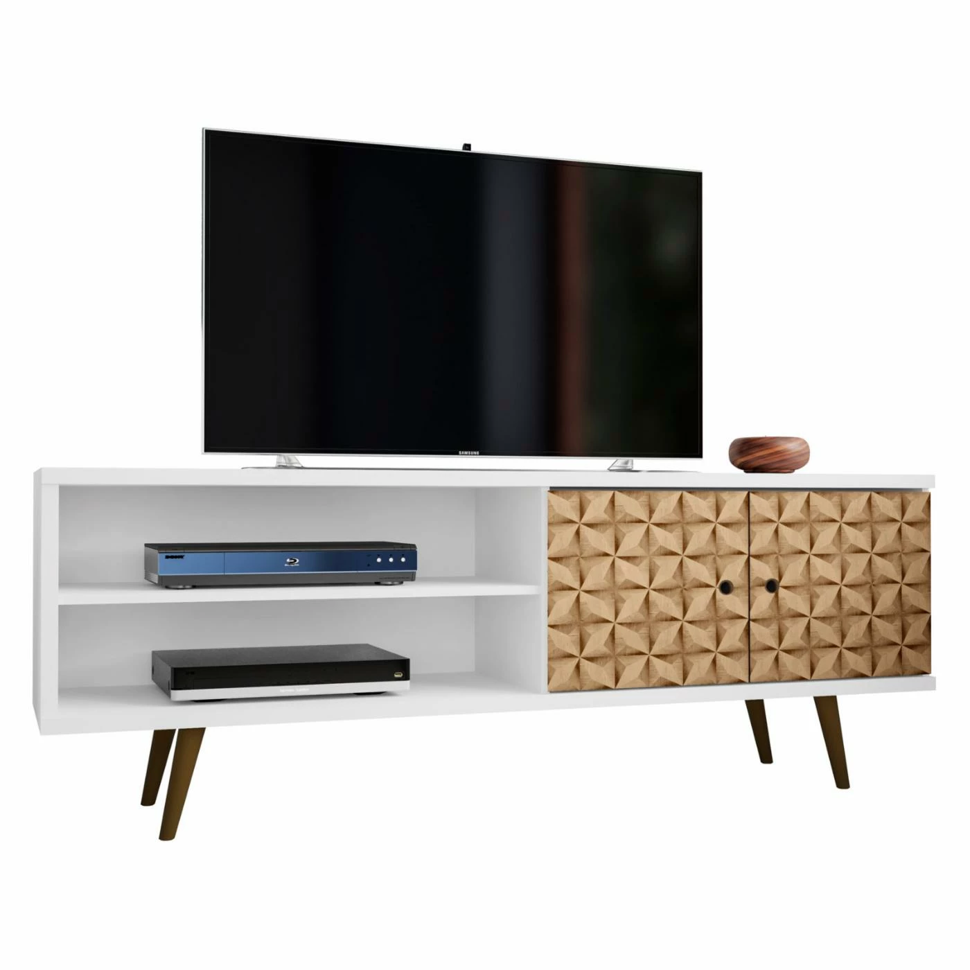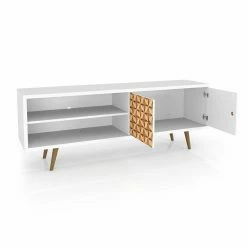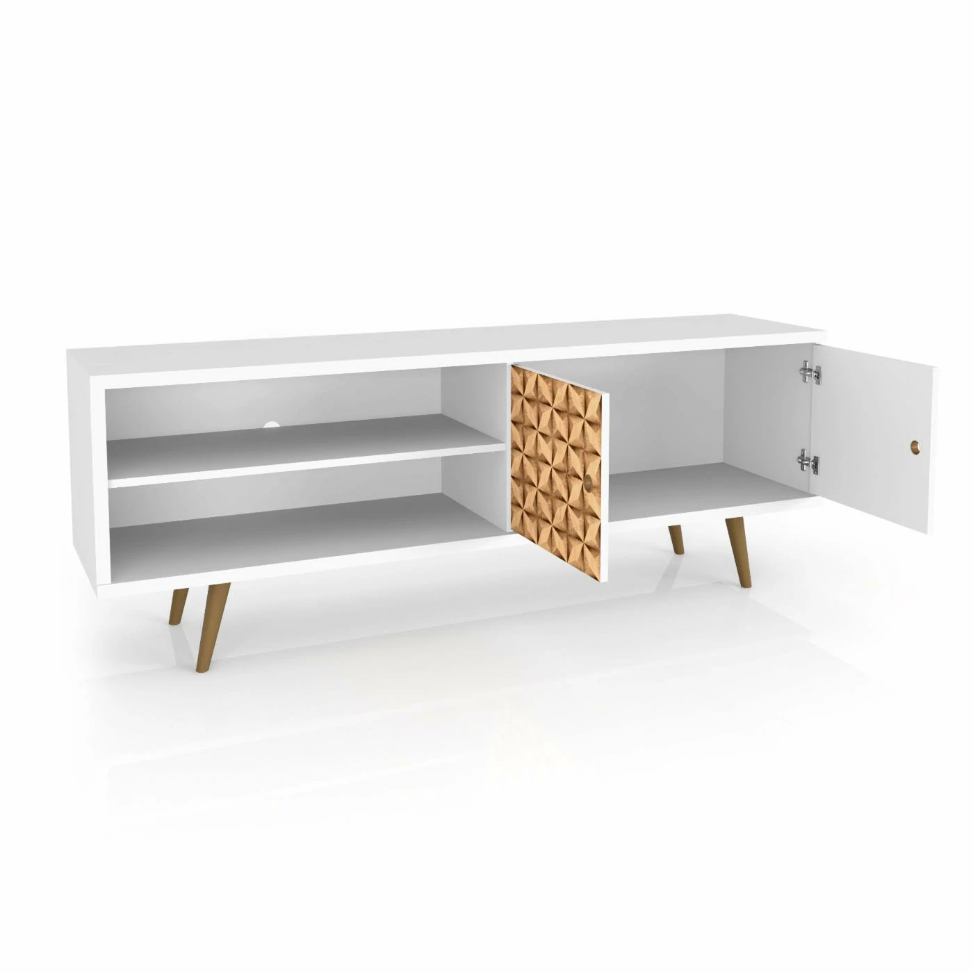 The Manhattan Comfort Liberty 2 Door TV Stand with 3D Print offers a welcome update to our living space. The mid-century style of this TV stand includes splayed, solid wood legs. For a chic touch, it features a fun 3D printed design on two of its doors. Open shelving and concealed storage allow you to organize and store media consoles and accessories. This TV stand is constructed of engineered and solid wood in choice of available finish options.