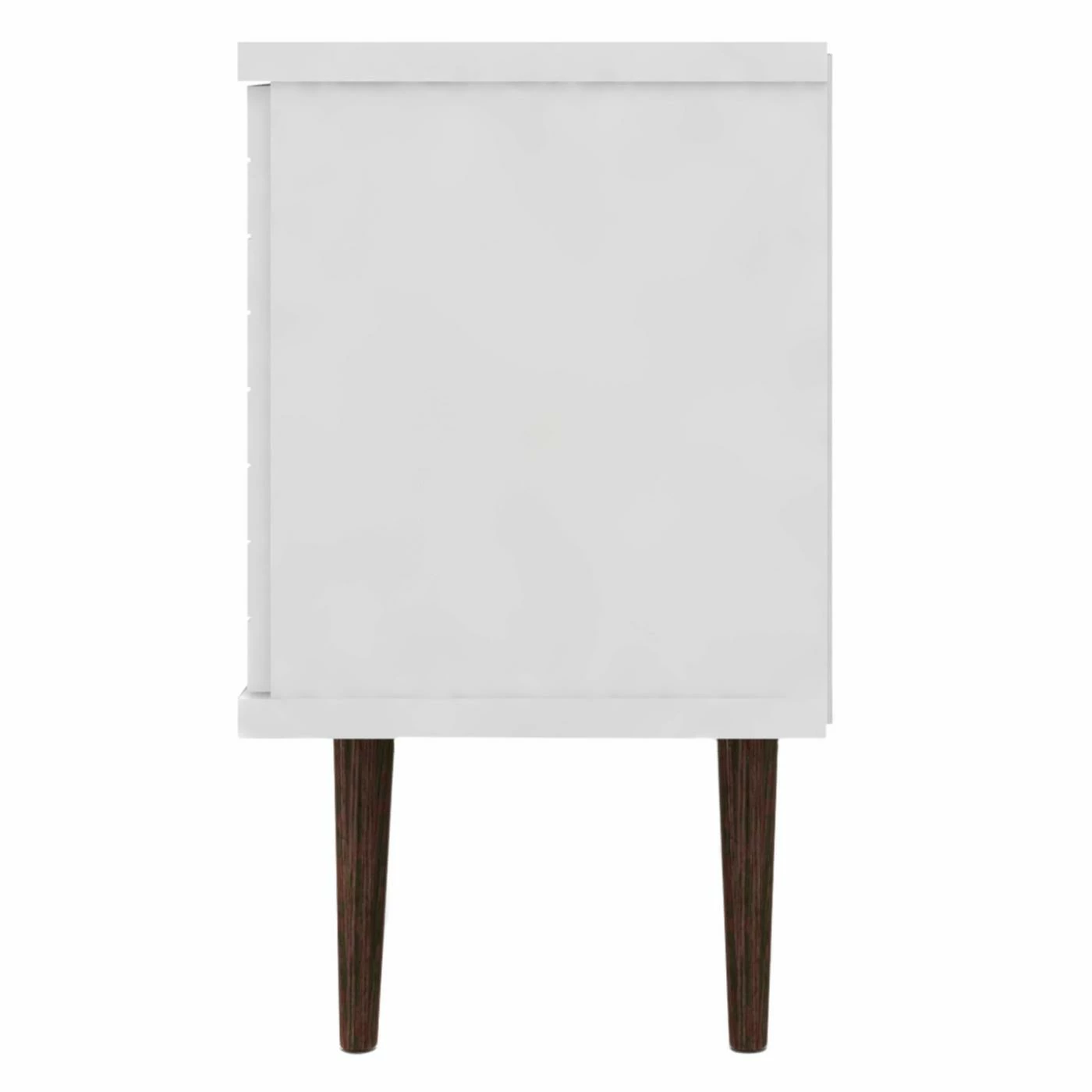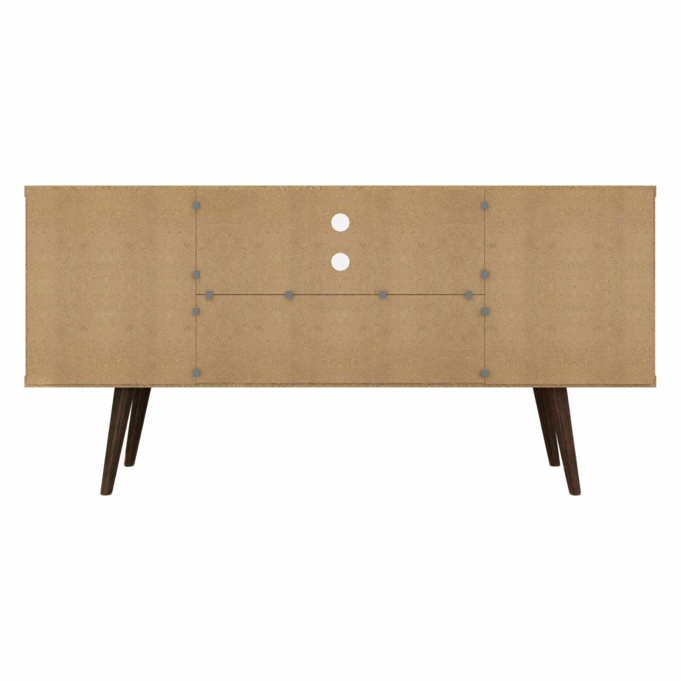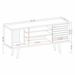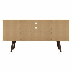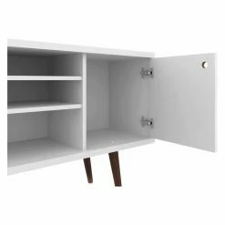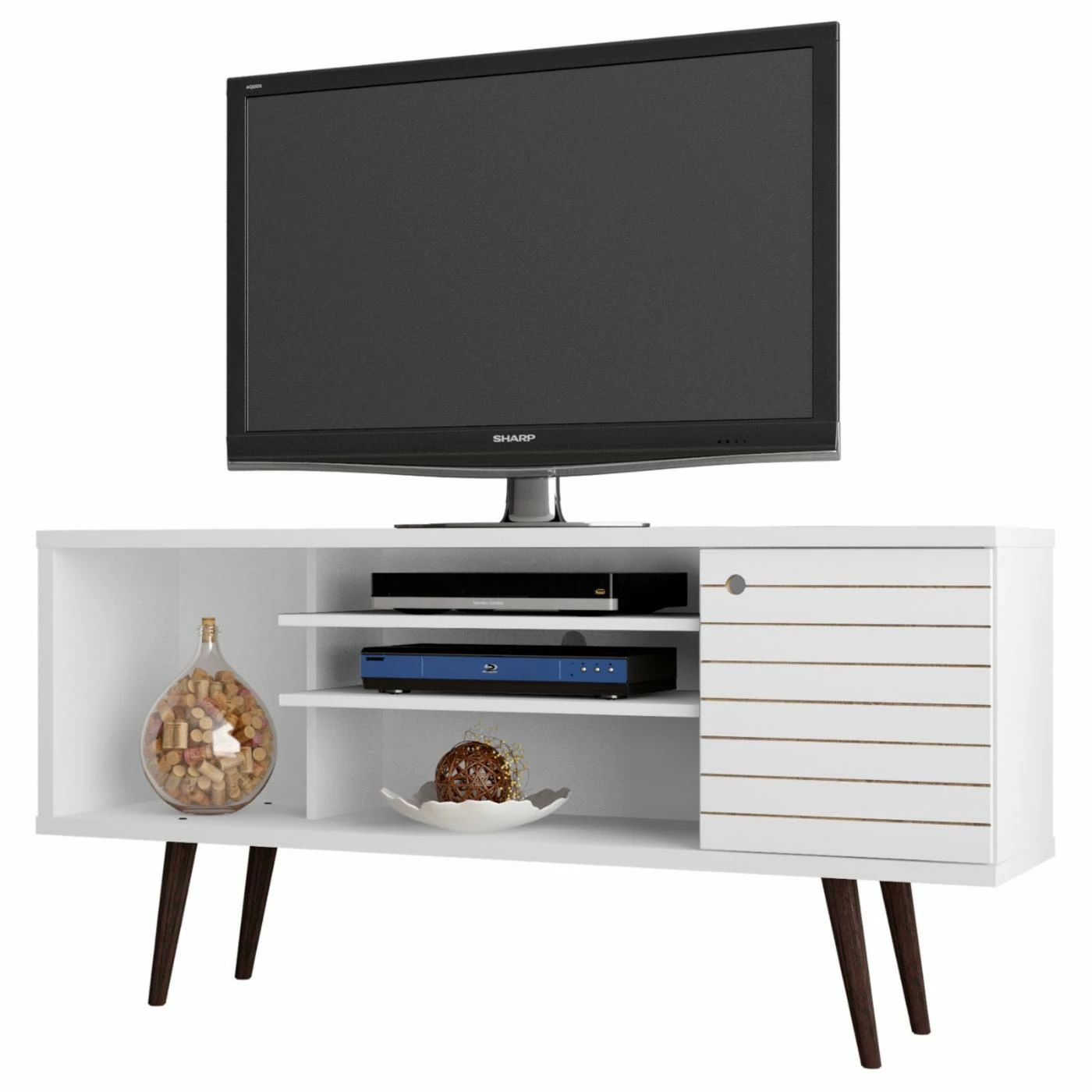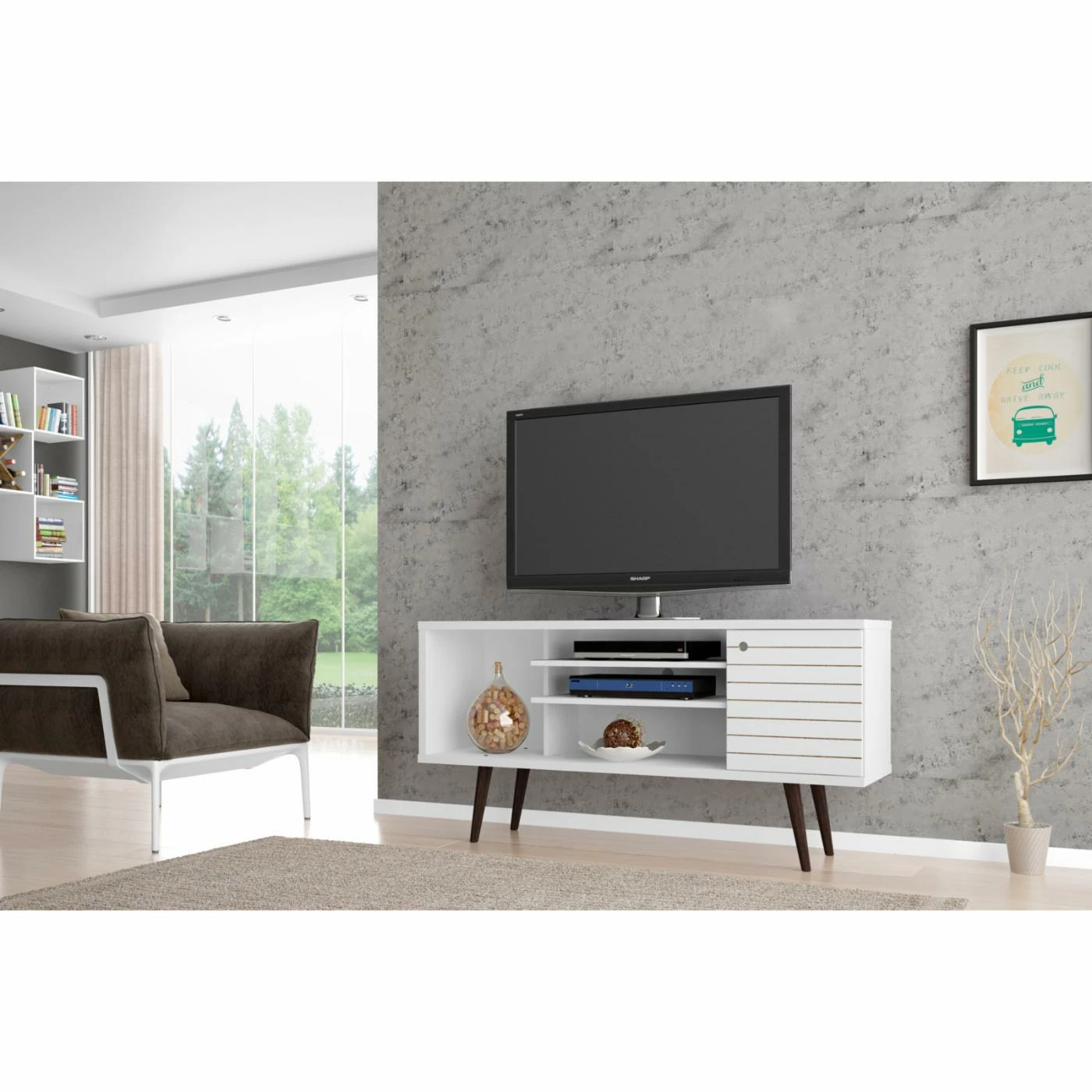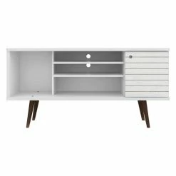 The Manhattan Comfort Liberty TV Stand with 5-Shelves and 1-Door is built of engineered wood for lasting durability and offered in your choice of available finish. Storage features of this TV stand include open shelving and wire management holes plus a grooved cupboard door on soft-close hinges. Splayed solid wood legs give this TV stands its mid-century modern appeal.