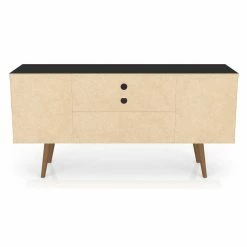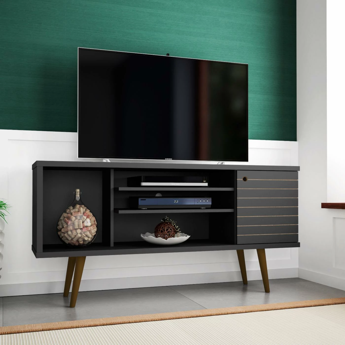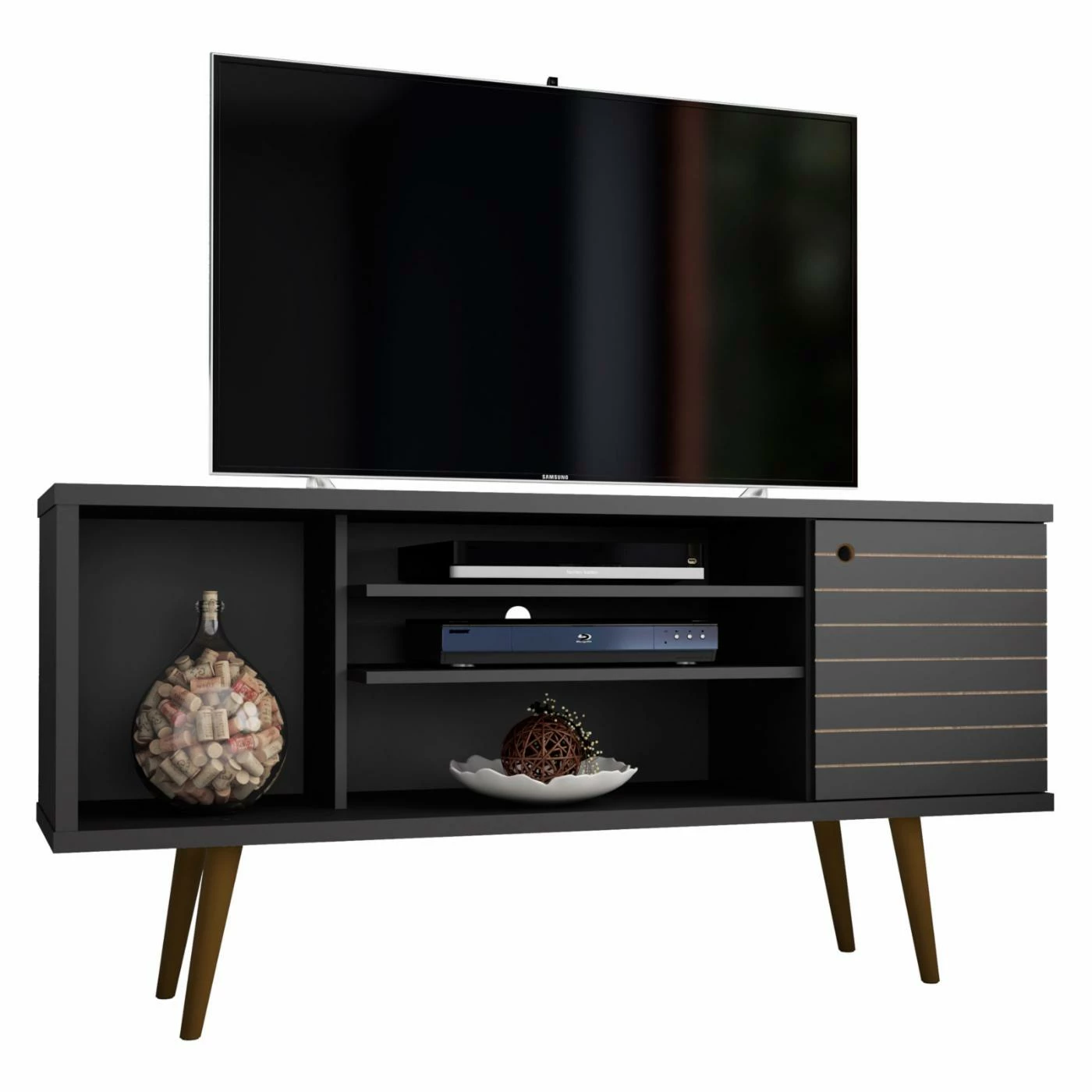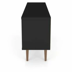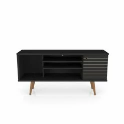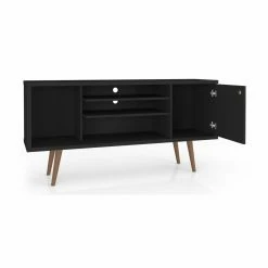Bring a contrasting look to your living space with the Manhattan Comfort Liberty TV Stand. This durable TV stand is constructed of engineered wood in black with splayed solid wood legs. It provides ample storage space for your media accessories with open shelving and cubby additions.