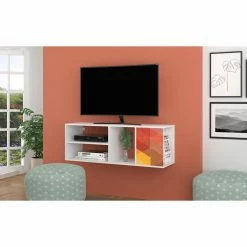 Complete your living or family room with the Manhattan Comfort Minetta Floating TV Stand. Floating cubies provide a clean, modern look to your dΓ©cor. Four of these open cubbies allow you to stash media consoles and accessories with ease. This TV stand is built of engineered wood in a clean white finish. It easily fits TVs up to 46 inches wide.