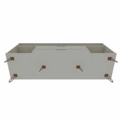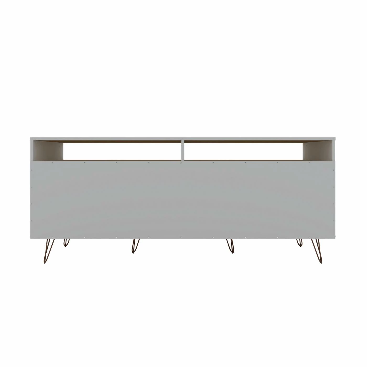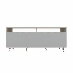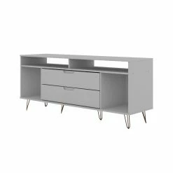 The Manhattan Comfort Rockefeller TV Stand is the living room mainstay thatโs both the perfect media and entertainment focal point with ample storage space perfect for keeping DVD players and media accessories on display in lower open shelves beneath the TV or tucked away in two seamless lower drawers. Two open shelves on each side offer space for showcasing decorative accents baskets filled with your softest throw, and beyond. Stylish with splayed metal legs and Mid-Century design at its best, this piece gathers family and friends to create new memories together and to enjoy favorite movies.