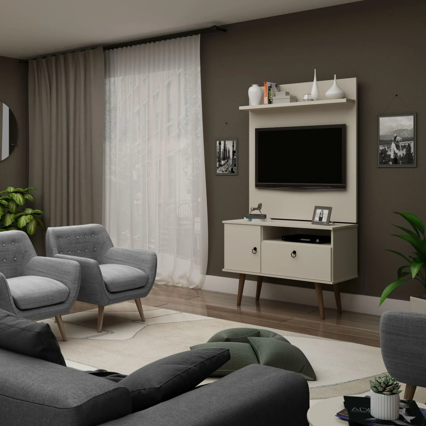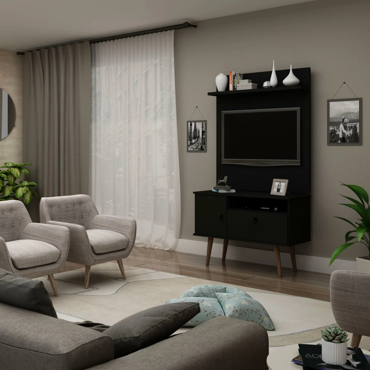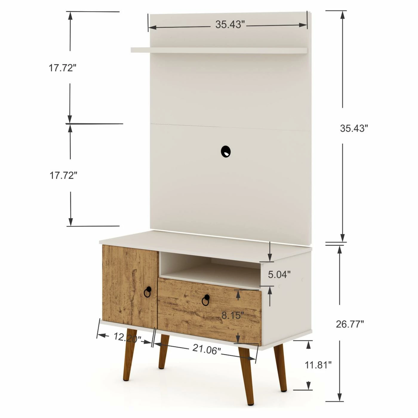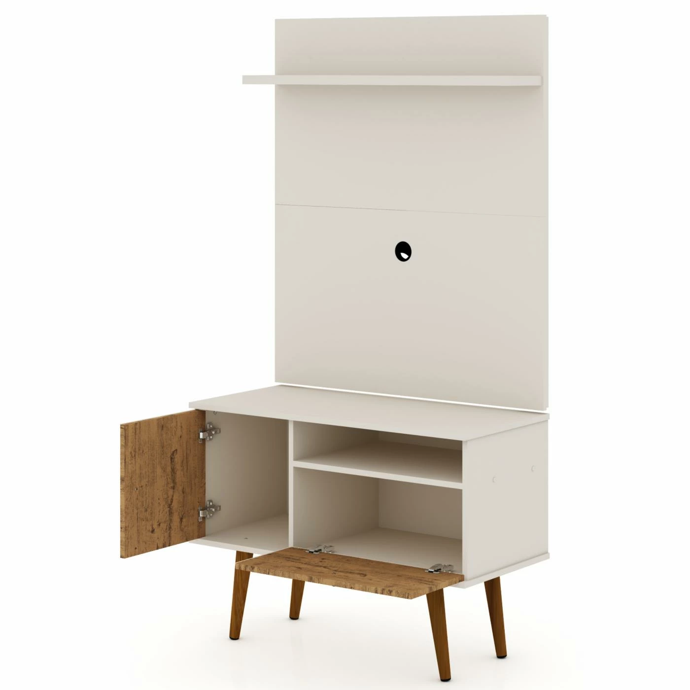 Make a big impact, even in a small space, with the Manhattan Comfort Tribeca TV Stand and Panel with Display Shelf. This TV stand and panel are constructed of MDP wood, and the lower unit is supported by solid pine legs. To best coordinate with your space, choose from the available finish options. For storage, one soft-close cabinet and a drop-front cabinet are equipped with metal ring pulls. An open compartment and overhead ledge add space for display.