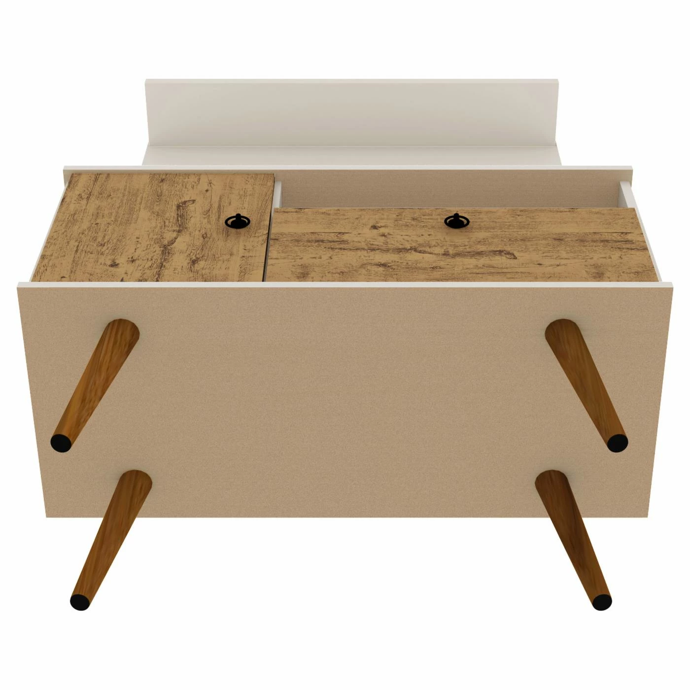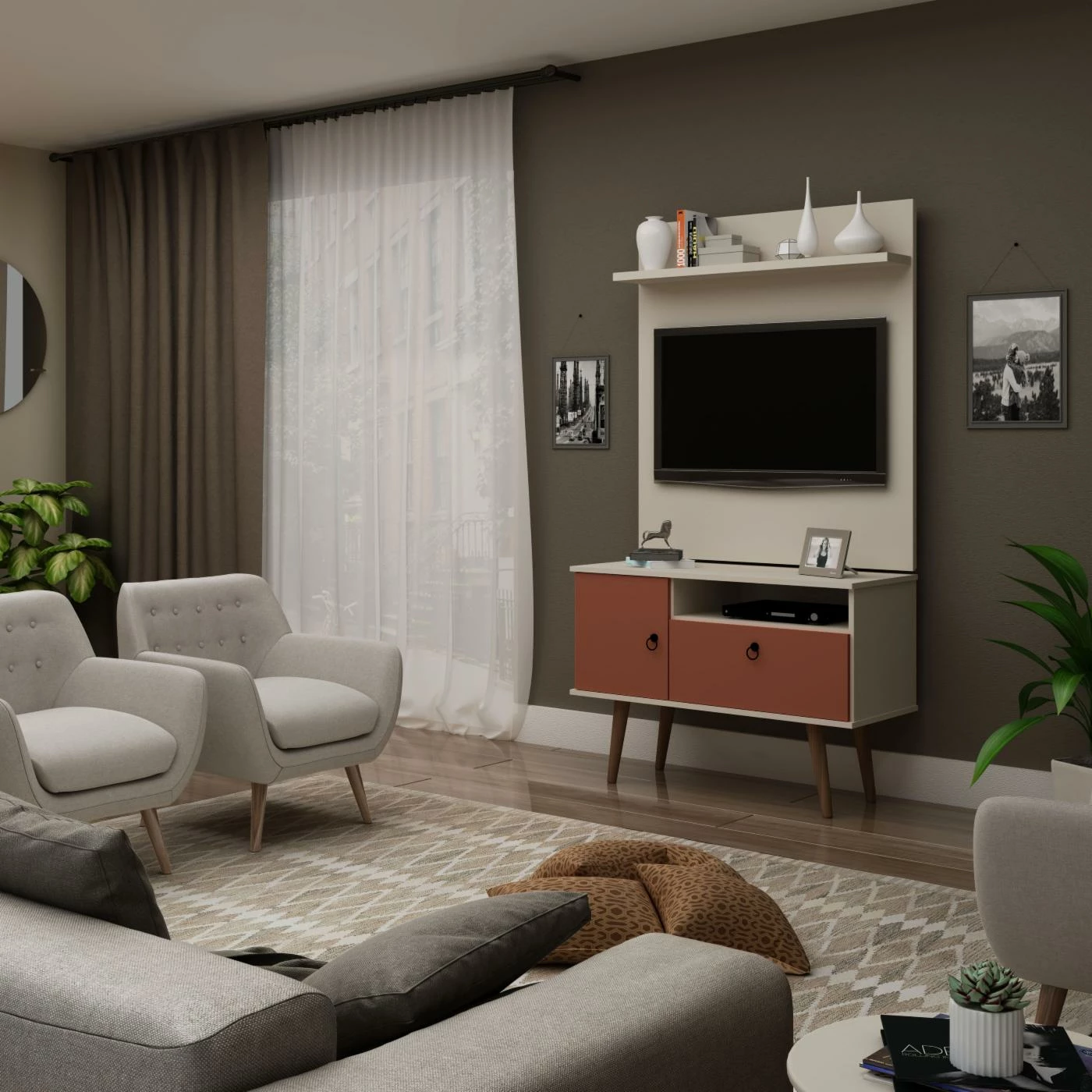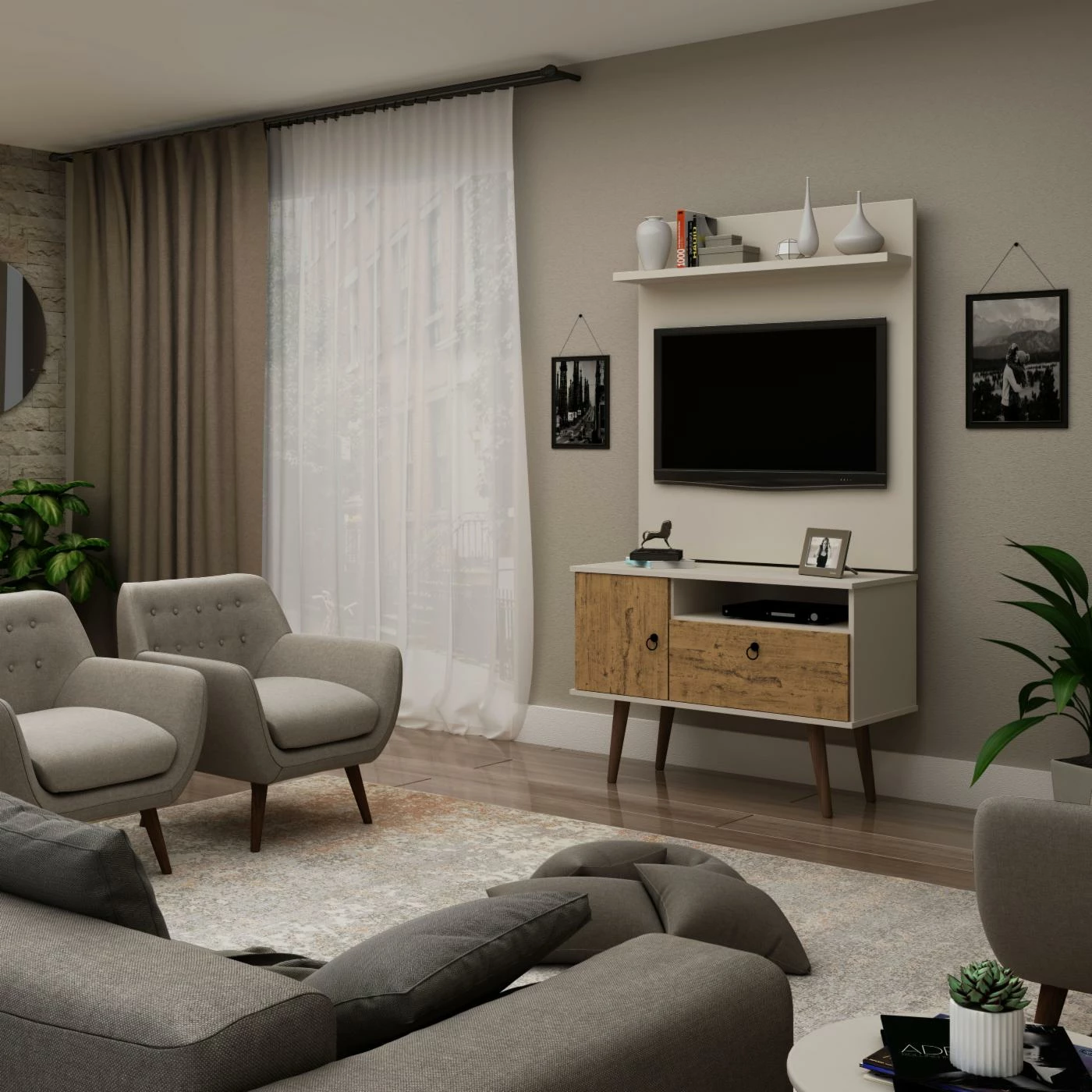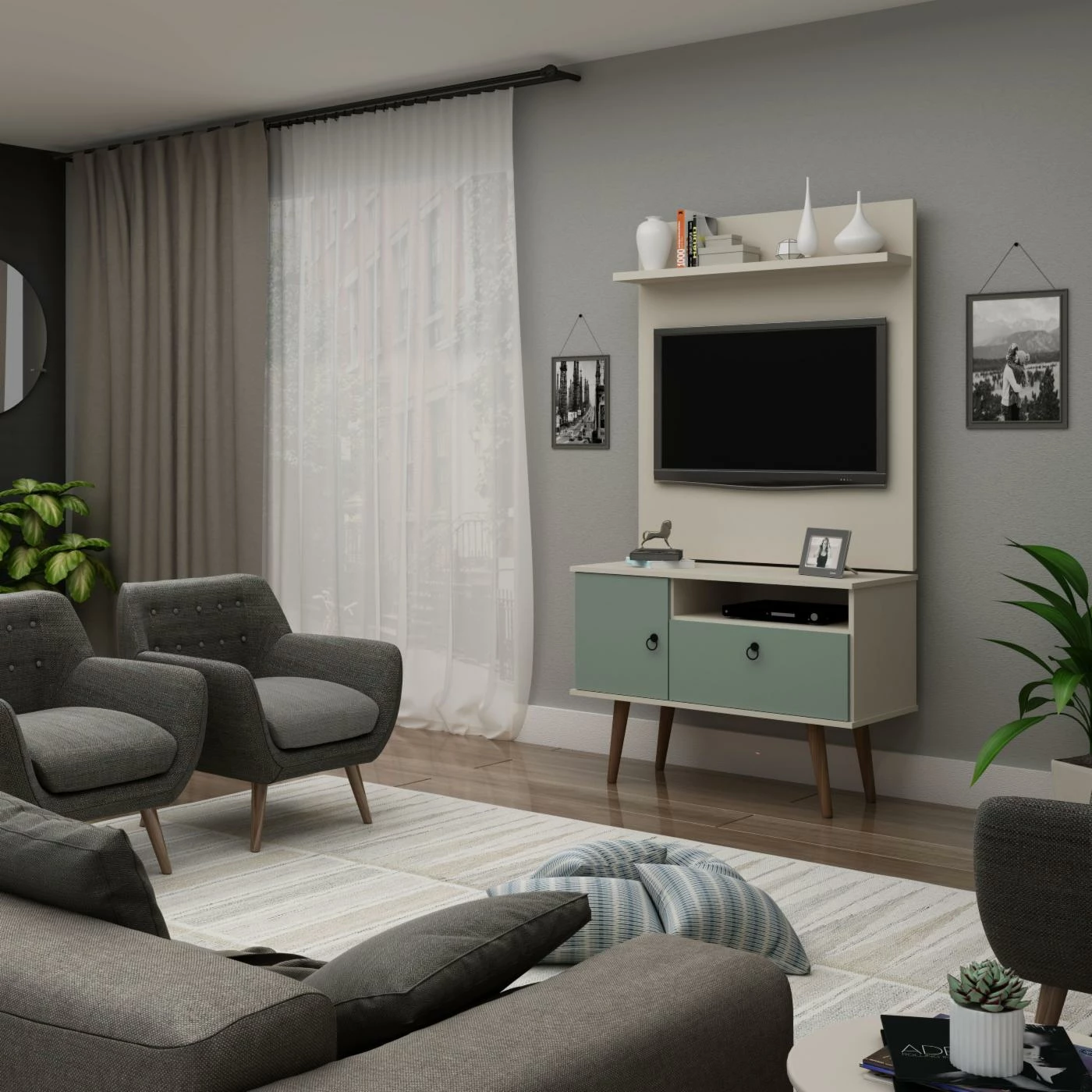 Make a big impact, even in a small space, with the Manhattan Comfort Tribeca TV Stand and Panel with Display Shelf. This TV stand and panel are constructed of MDP wood, and the lower unit is supported by solid pine legs. To best coordinate with your space, choose from the available finish options. For storage, one soft-close cabinet and a drop-front cabinet are equipped with metal ring pulls. An open compartment and overhead ledge add space for display.