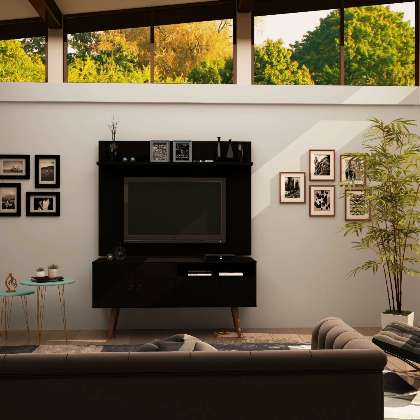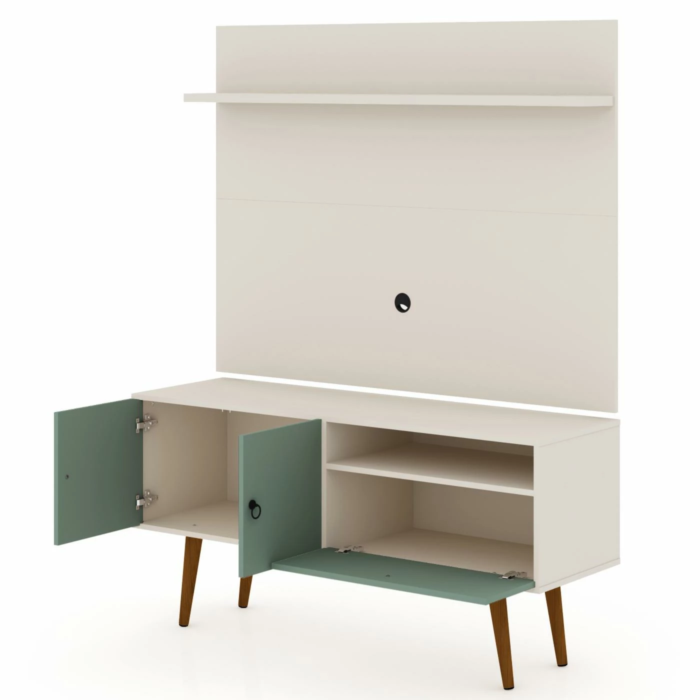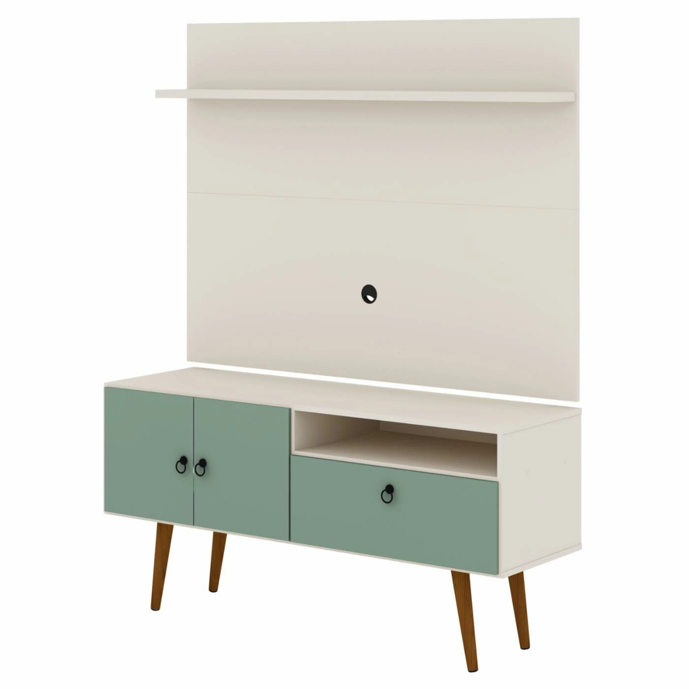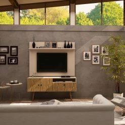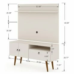 The Manhattan Comfort Tribeca TV Stand and Panel offers a two-piece entertainment set that will make a statement in your space. This TV stand and panel are made of MDP wood, and the lower unit is supported by solid pine legs. Customize the look with your choice of available finishes. Two soft-close doors and a drop-front cabinet provide enclosed storage space, and an overhead ledge and an open compartment can be used for display. Each piece is equipped with wire management cutouts to create a clean look.