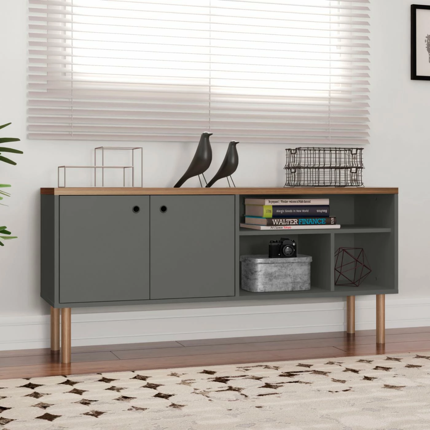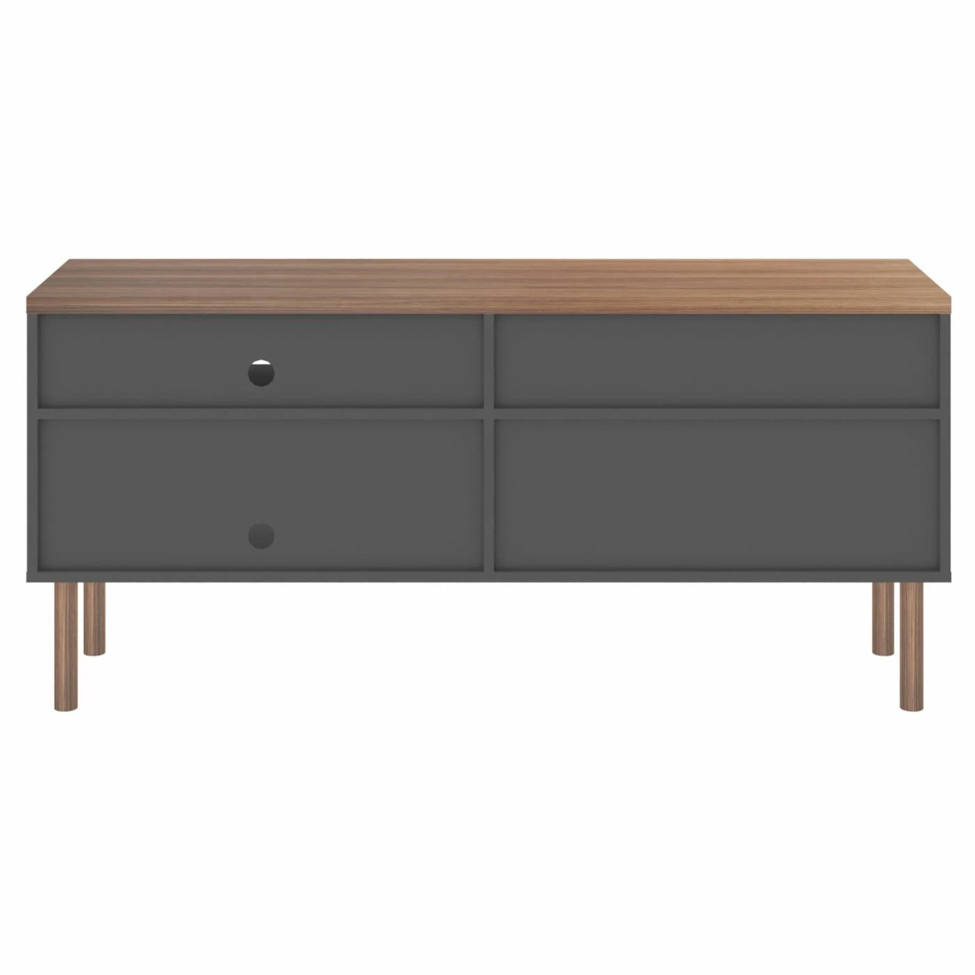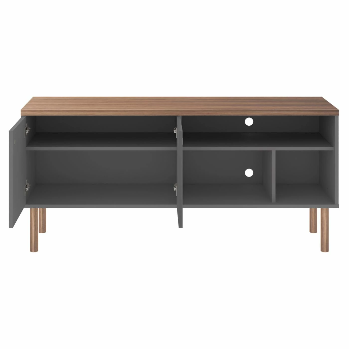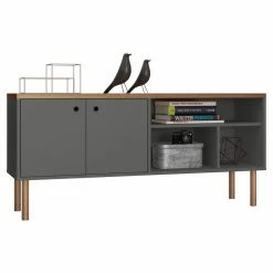 Make the Manhattan Comfort Windsor TV Stand your own by displaying photos, books, and small plants in the open compartments. This TV stand is constructed of engineered wood and supported by eucalyptus wood legs. Choose from the available finish options to customize the look. For enclosed storage, it features two cabinet doors with hollowed ring pulls.