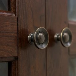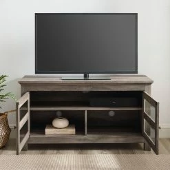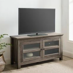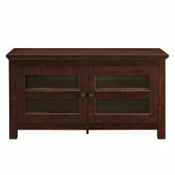 The Manor Park 44-in. Full Door Wood TV Console will give you a double dose of practical storage and harmonious style. This TV console can definitely hold its own among today’s casual, pseudo-traditional furniture styles. Made of durable laminate and MDF (a dense, warp-resistant engineered wood), the console boasts a traditional finish accented by two brass-finished knobs. Framed glass panes allow remote signals to pass through the doors to your audio-visual components arranged on the wide shelves inside. The stand’s sturdy top holds most flat panel TVs measuring up to 48 inches wide.