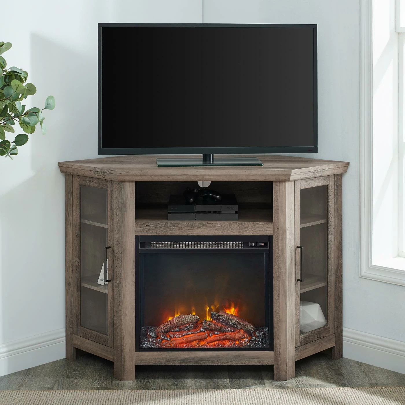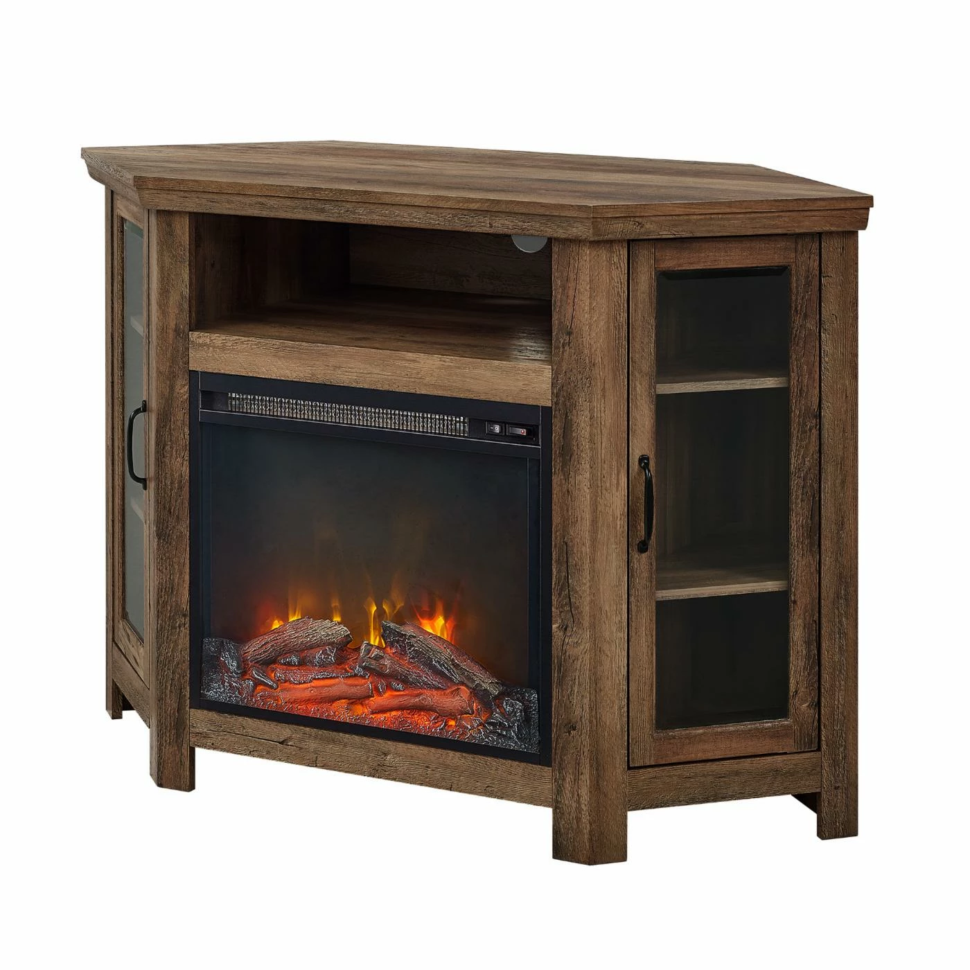 With its corner design to maximize space, the Manor Park 48 in. Wood Corner Fireplace Media TV Stand Console Table is a great addition to small and large rooms alike. Featuring six shelves behind two tempered glass cabinet doors, youβll have plenty of room to store DVDs, remotes, games, and more. The open shelf provides ample space for your media devices and includes a built-in hole for easy cord management. The electric fireplace doesnβt require an electrician to work. Simply plug the unit in to enjoy the flames. Crafted from engineered wood and laminate for strength and durability, and with your choice of available finishes, this TV stand complements any home.
