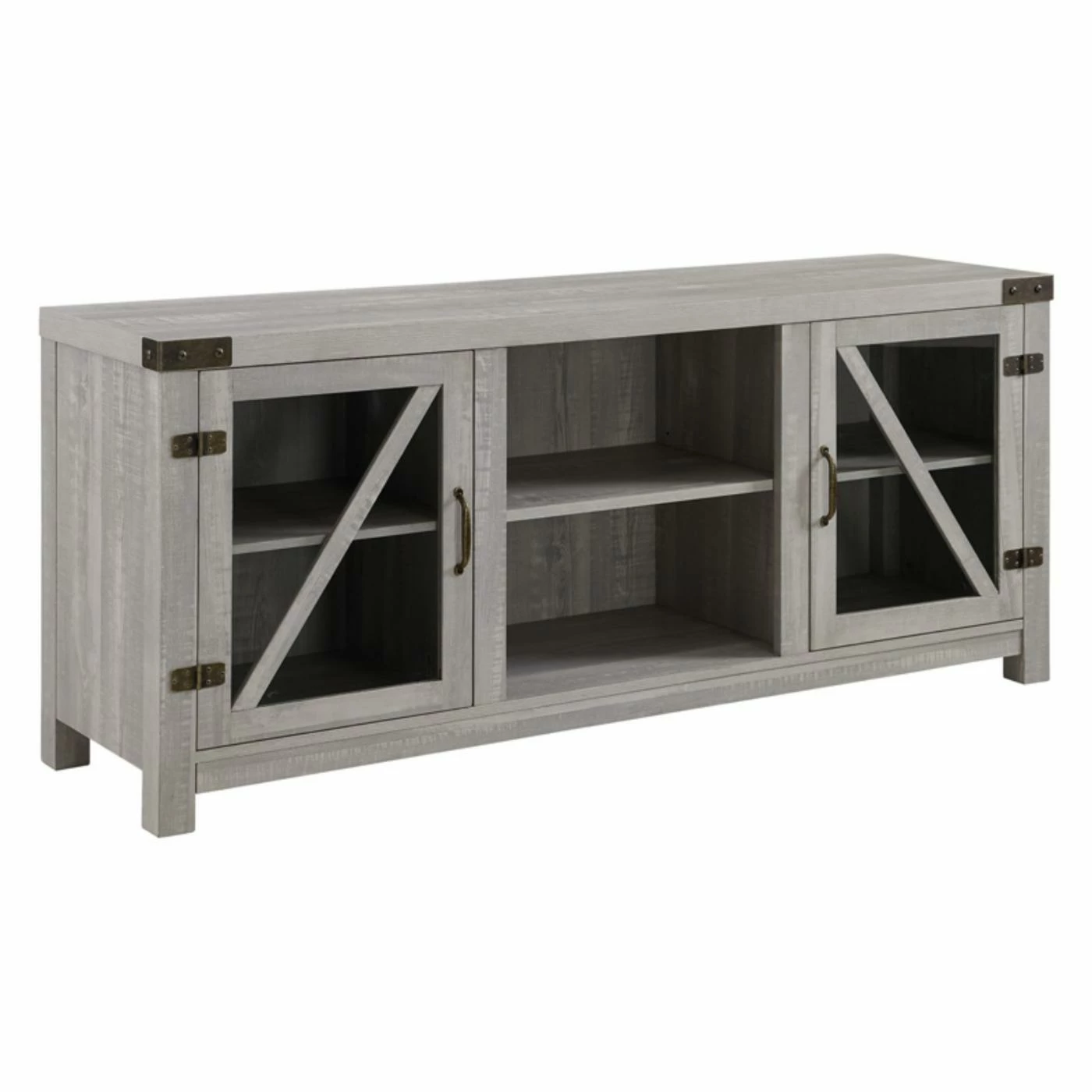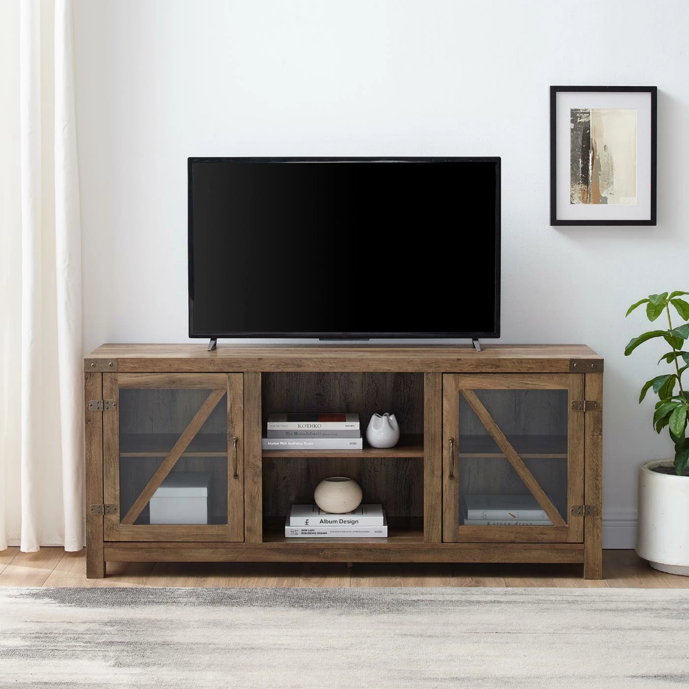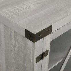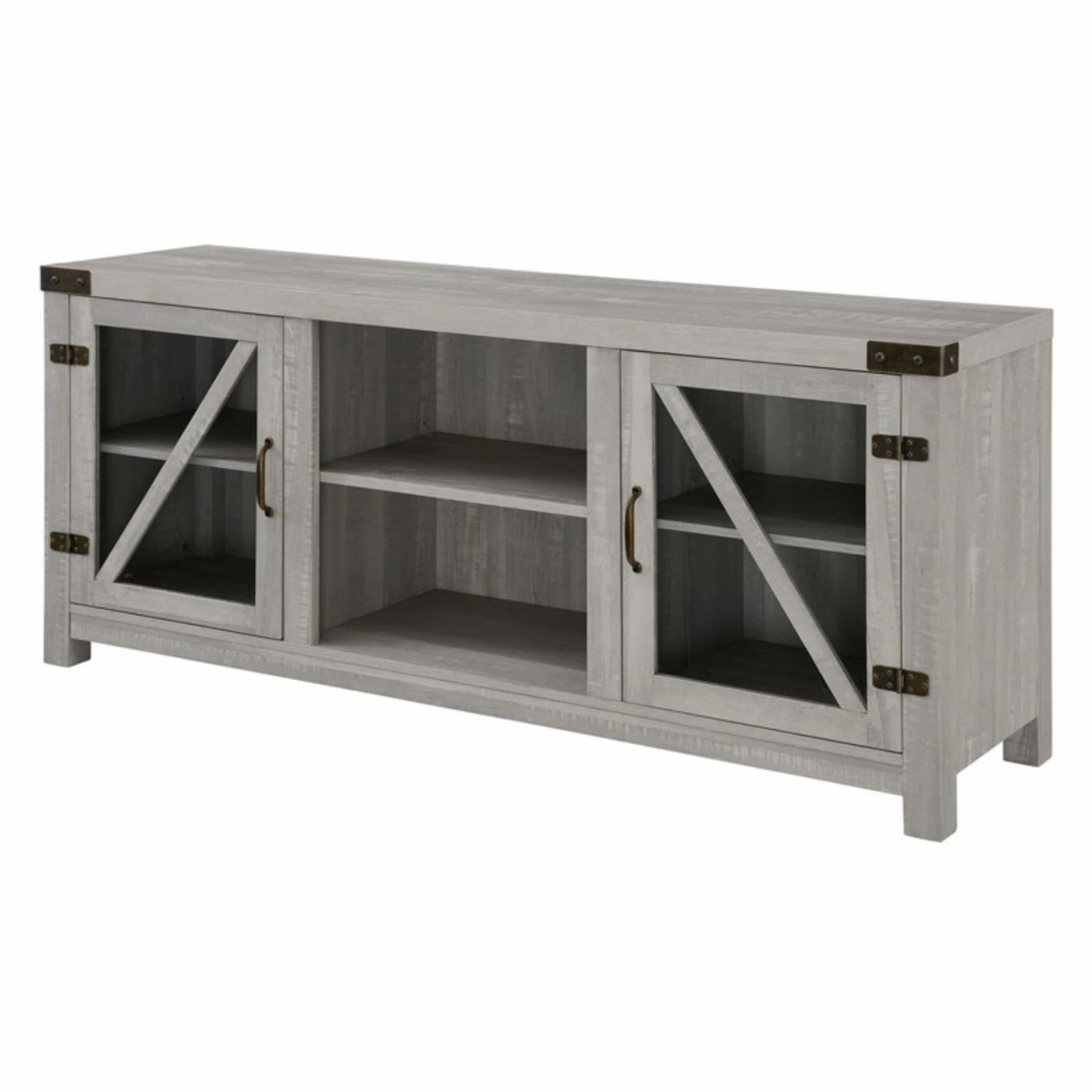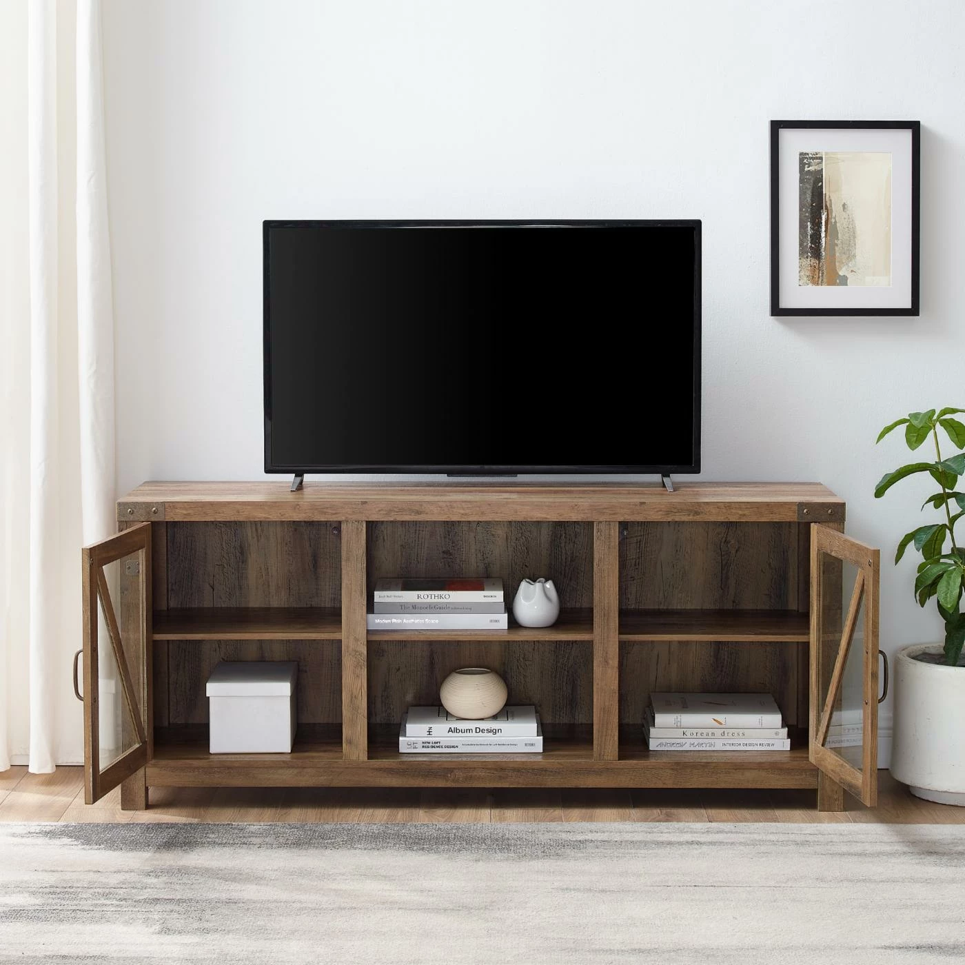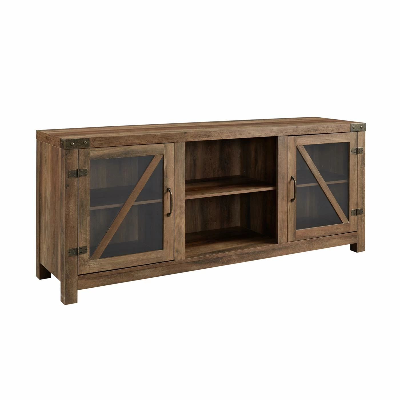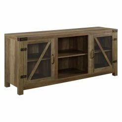 The Manor Park 58 in. Glass Barn Door TV Stand is the perfect blend of farmhouse and modern design elements. Made to add storage space as well as style to your home, this TV stand features an open center space with an adjustable shelf as well as two cabinets with an adjustable shelf each. The high-grade engineered wood and laminate frame comes in your choice of available finishes to complement any decor. Exposed hardware completes the look.