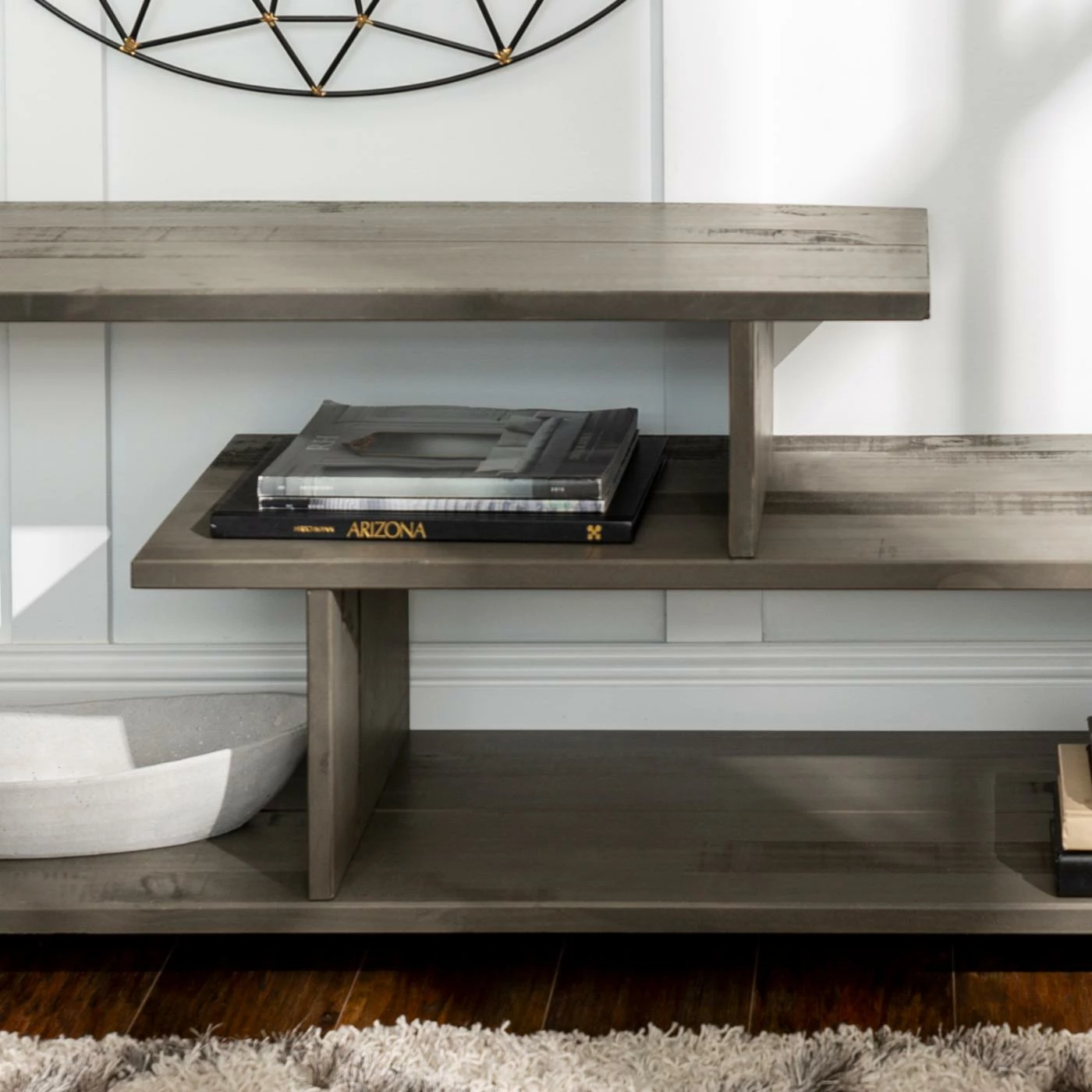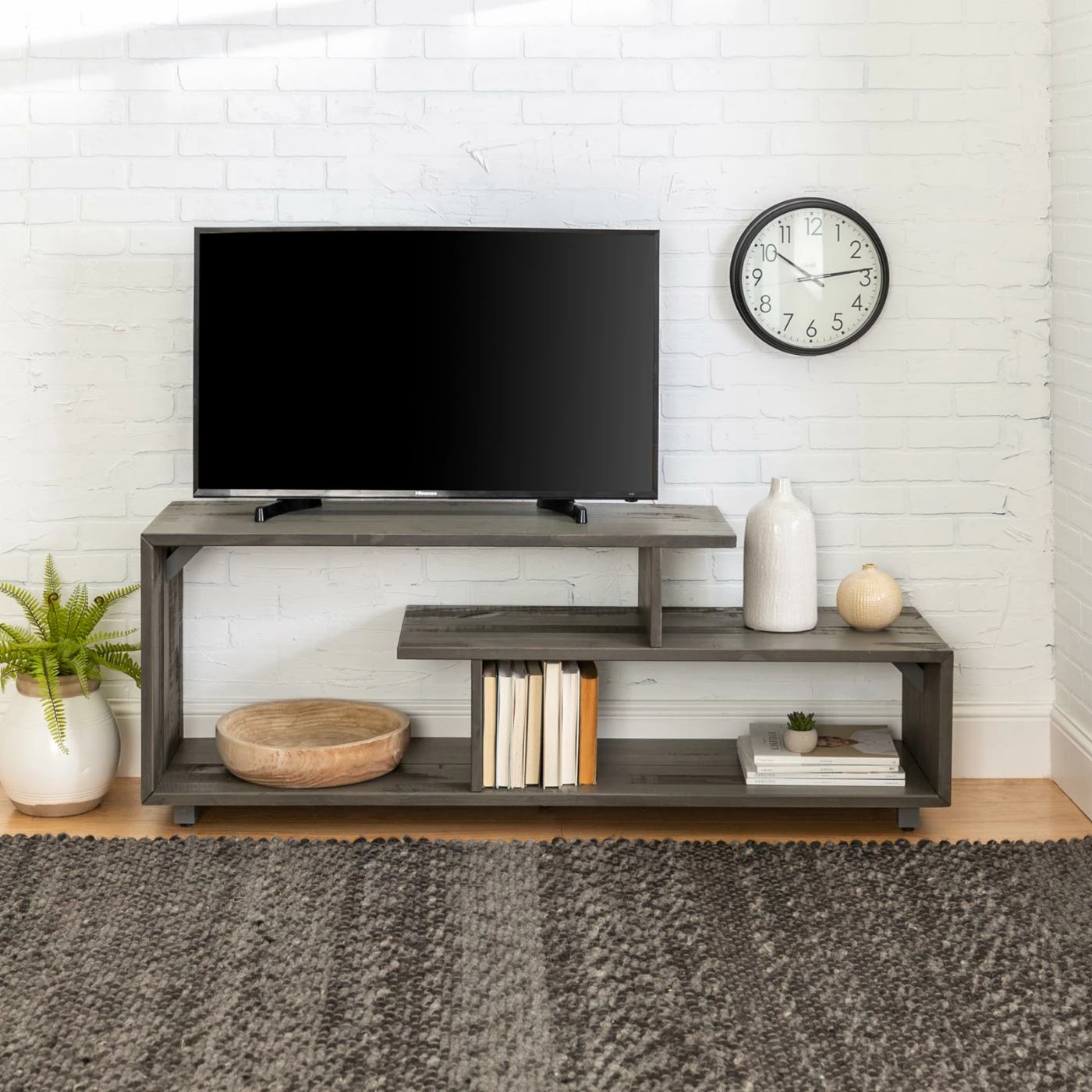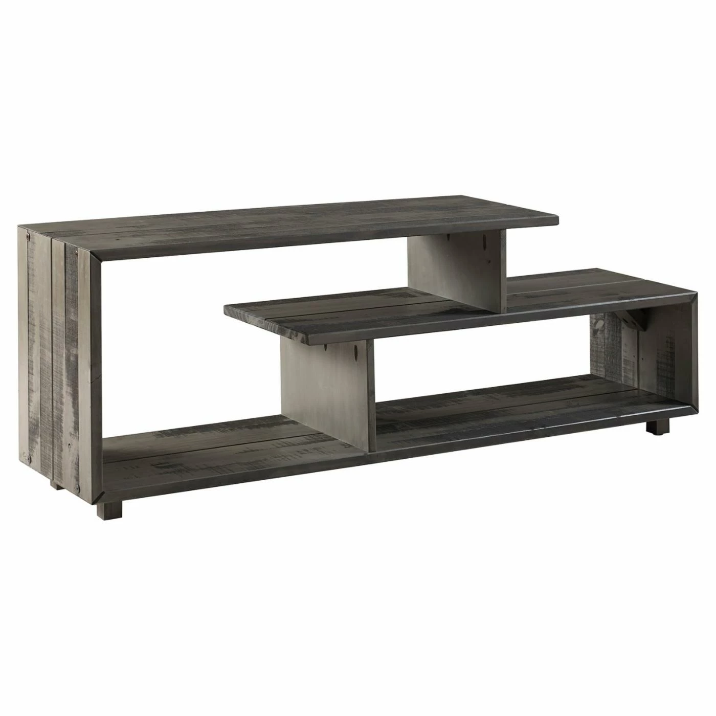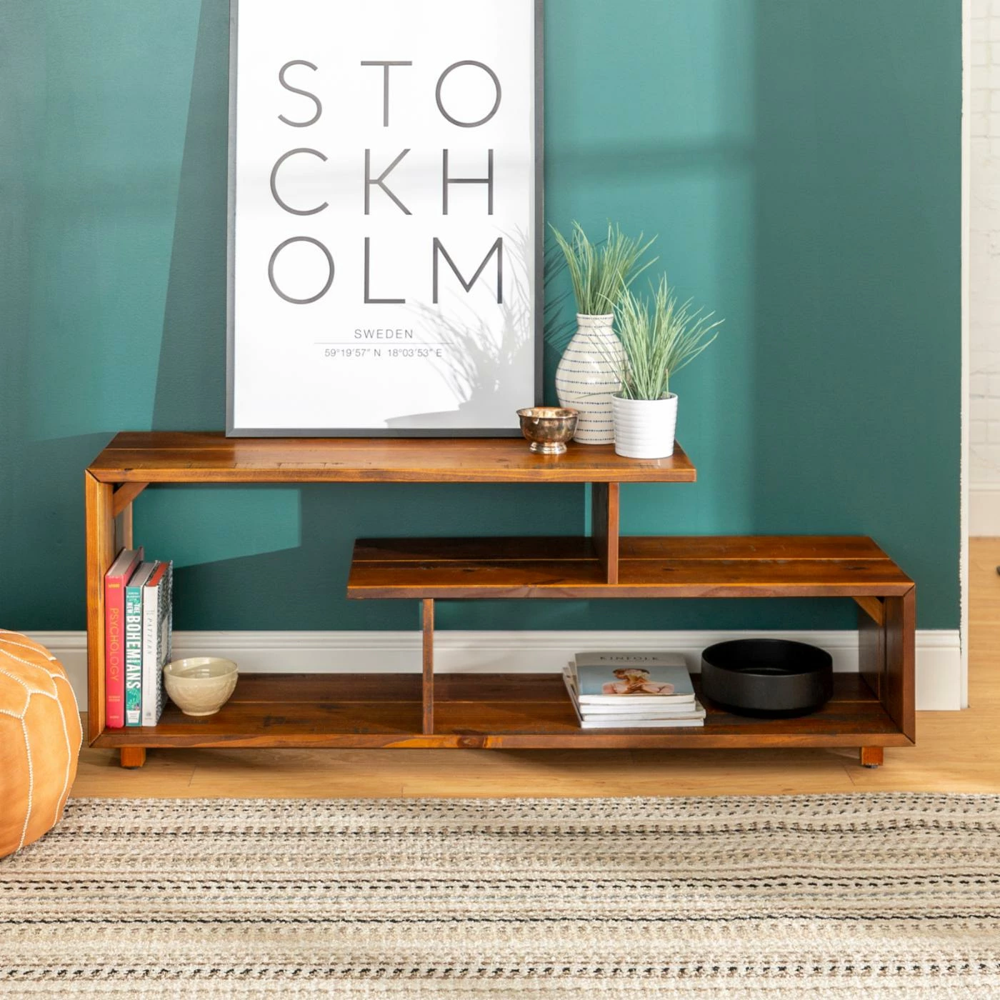 Modern and rustic design collide in the Manor Park 60 in. Solid Wood TV Stand. Featuring an open design with four shelves, this TV stand offers ample air flow as well as space for your electronics, TV, books, decorative items, and more. Constructed from sustainable sourced pine wood in your choice of available finishes, this piece complements any home in a winning manner. Milted joint corners and adjustable feet complete the design.