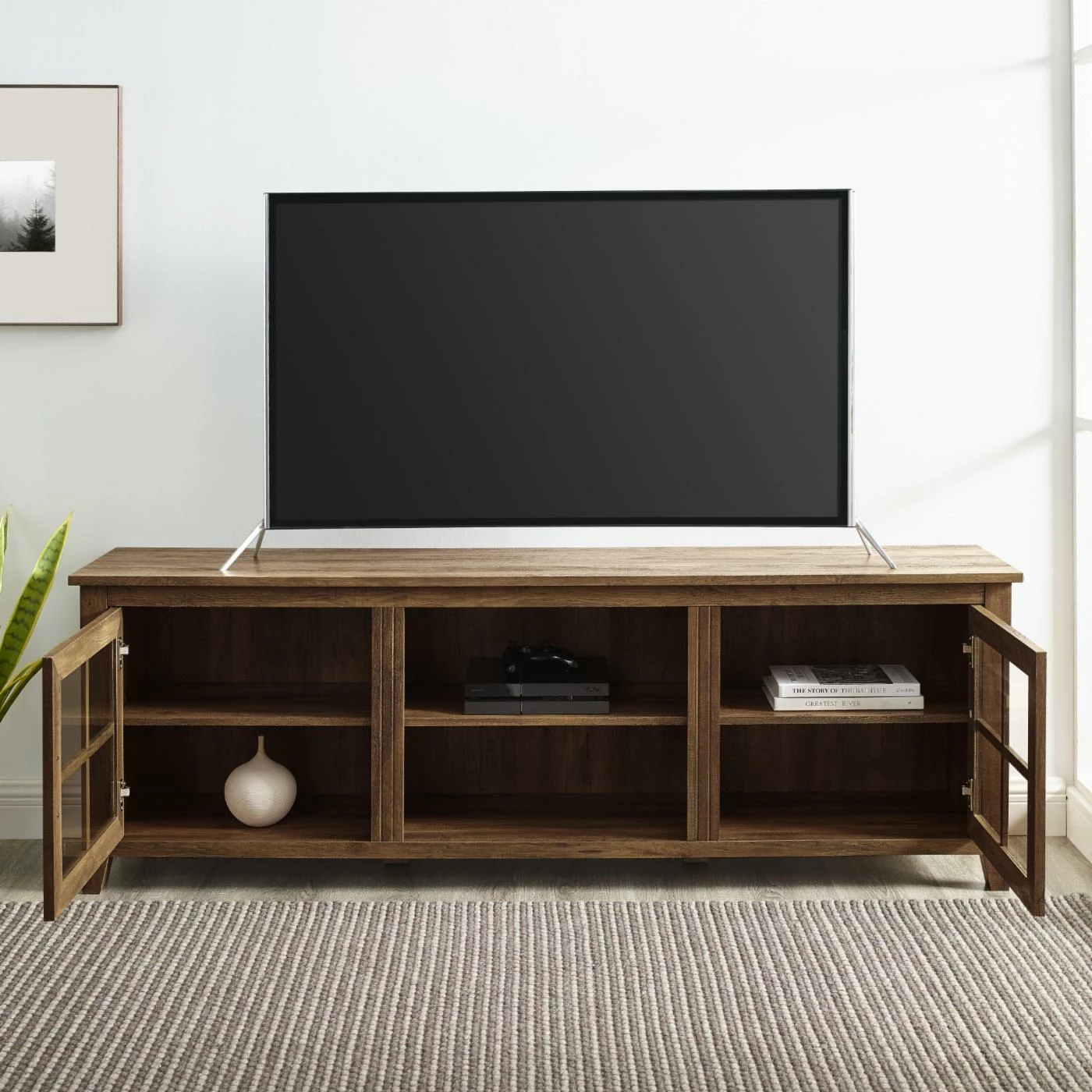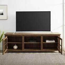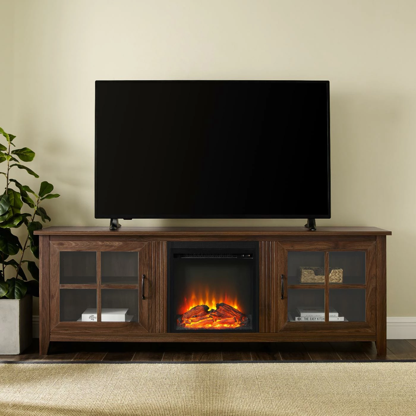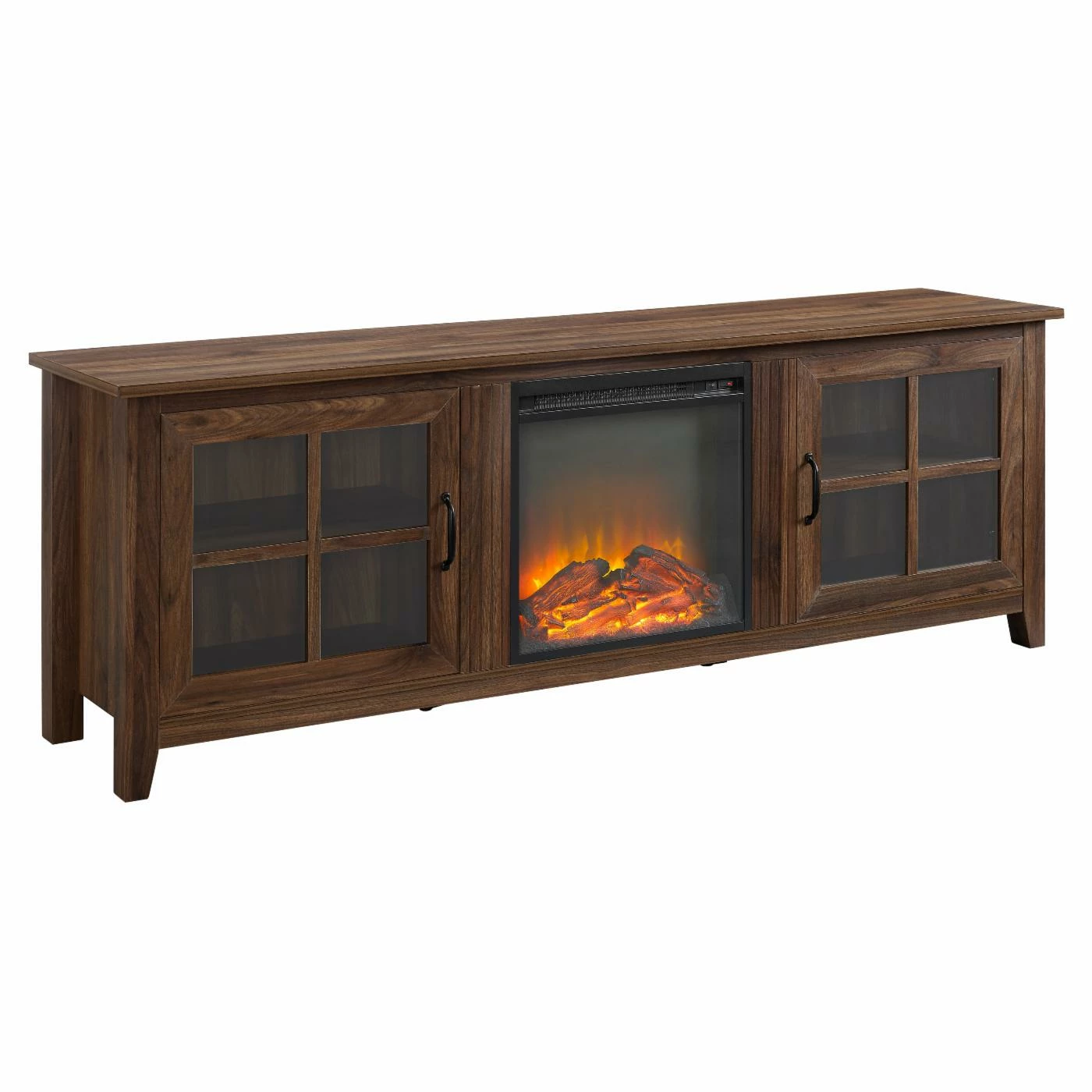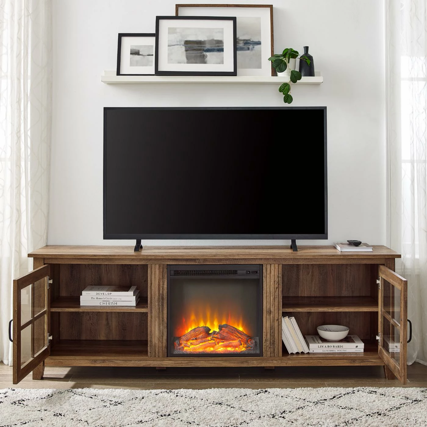 Make over your living room in rustic style with the Manor Park 70 in. TV Stand with Optional Fireplace. Perfect for adding storage space to your home, this piece boasts an open center area thatβs perfect for holding electronic devices as well as two side cabinets for games, DVDs, remotes, books, and more. Add the optional fireplace to replace the center shelves to create a cozy place to gather around. Crafted from high-grade engineered wood and laminate, this sturdy TV stand is a great choice for high traffic areas. Itβs large enough to hold most TV screens up to 65-inches wide, so you can upgrade your TV along with your furniture.