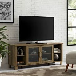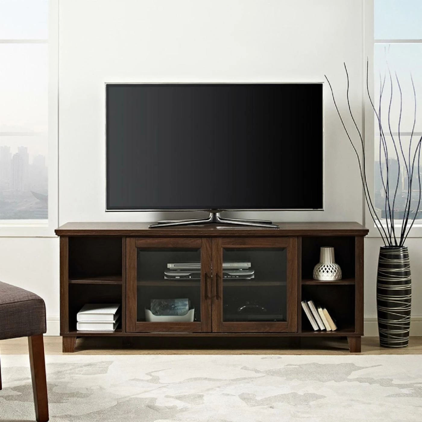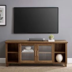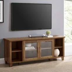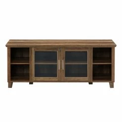 The Manor Park Columbus TV Stand with Middle Doors features eight shelves, two of which are behind clear glass doors. Store or display your favorite movies, books, and knick-knacks. At 58 inches wide, this stand can handle just about any size TV. Assembly required.