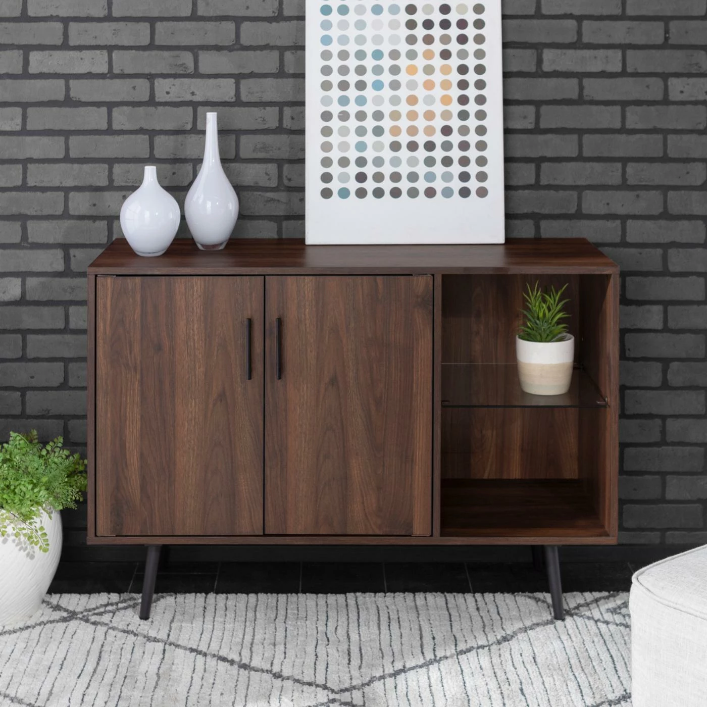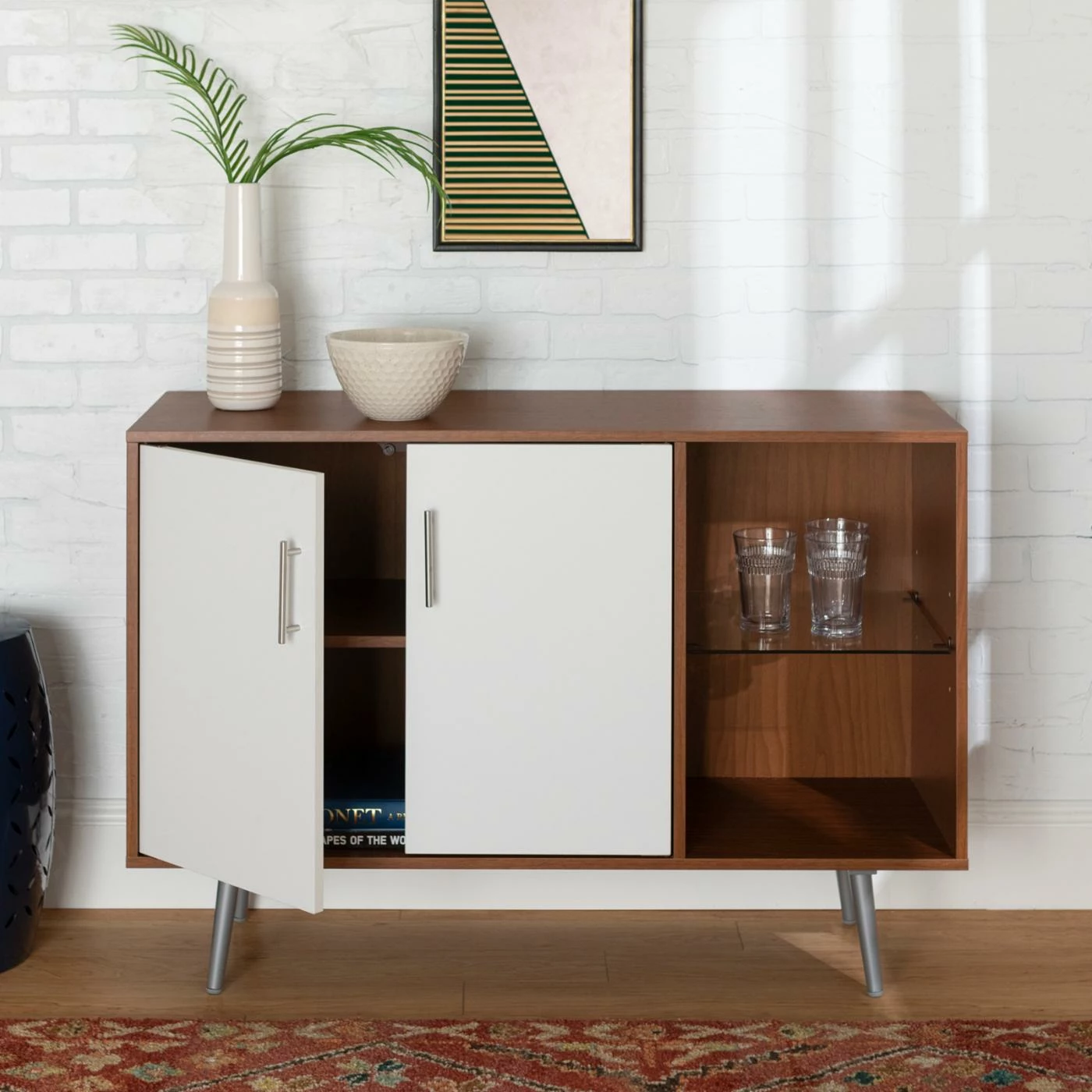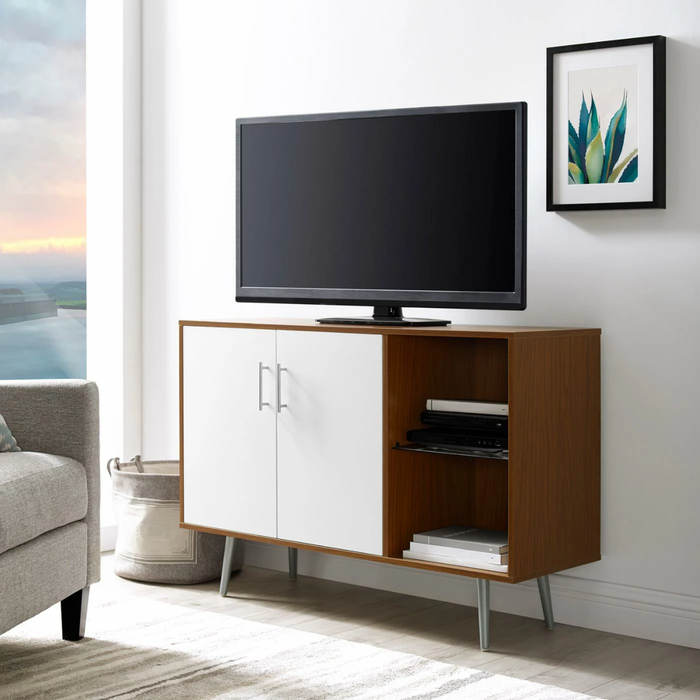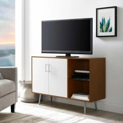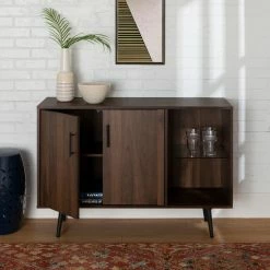 With both open and concealed shelving, the Manor Park Mid Century Console TV Stand is a versatile storage console that instantly updates your space. On trend, mid-century-inspired features include the lean, linear silhouette and the angled legs. As a bonus, the legs make it easy to vacuum underneath this media console. Use it with a flat panel TV up to 48 inches and make good use of the cord management port in the back, or style it as a sideboard for your dining room. Either way, the laminate finish and mix of storage options make this a solid and stylish choice. Doors have convenient magnetic closures, shelves adjust in height, and feet are rubber capped to treat your floors with care.