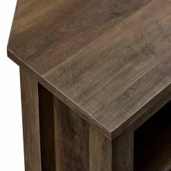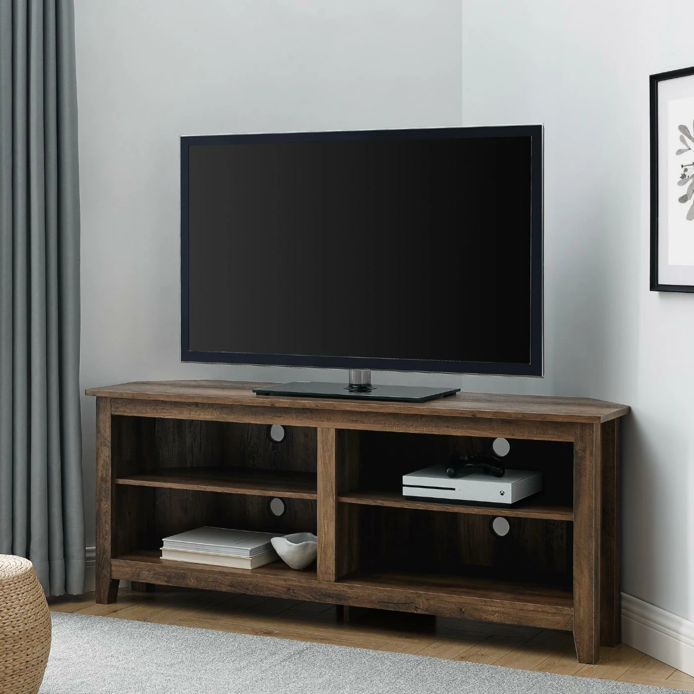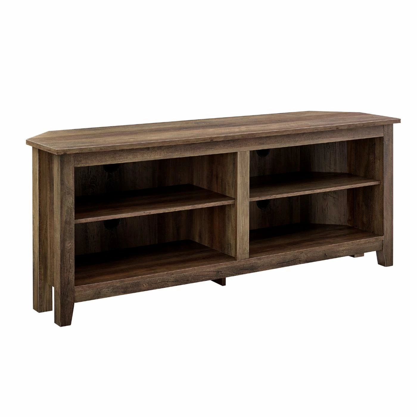 Take advantage of a corner space in your living room with the Manor Park Transitional Corner TV Stand. This TV stand features a unique corner design and offers plenty of open storage for media devices, books, and dΓ©cor with the adjustable shelves. It’s finished in a reclaimed barn wood color to give it rustic, farmhouse appeal. Holes in the back offer convenient cord management and the top of the stand holds up to 64-inch televisions.