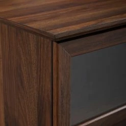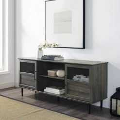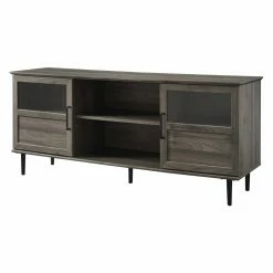 The Manor Park Transitional Glass and Wood Split Panel Door TV Console features simple lines for modern-industrial appeal, but rich details add a rustic touch. The TV stand has two doors each with a half glass, half wood front. Large open cubbies at the center are perfect for media consoles. The stand accommodates televisions up to 64 inches and comes in your choice of available wood finish.
