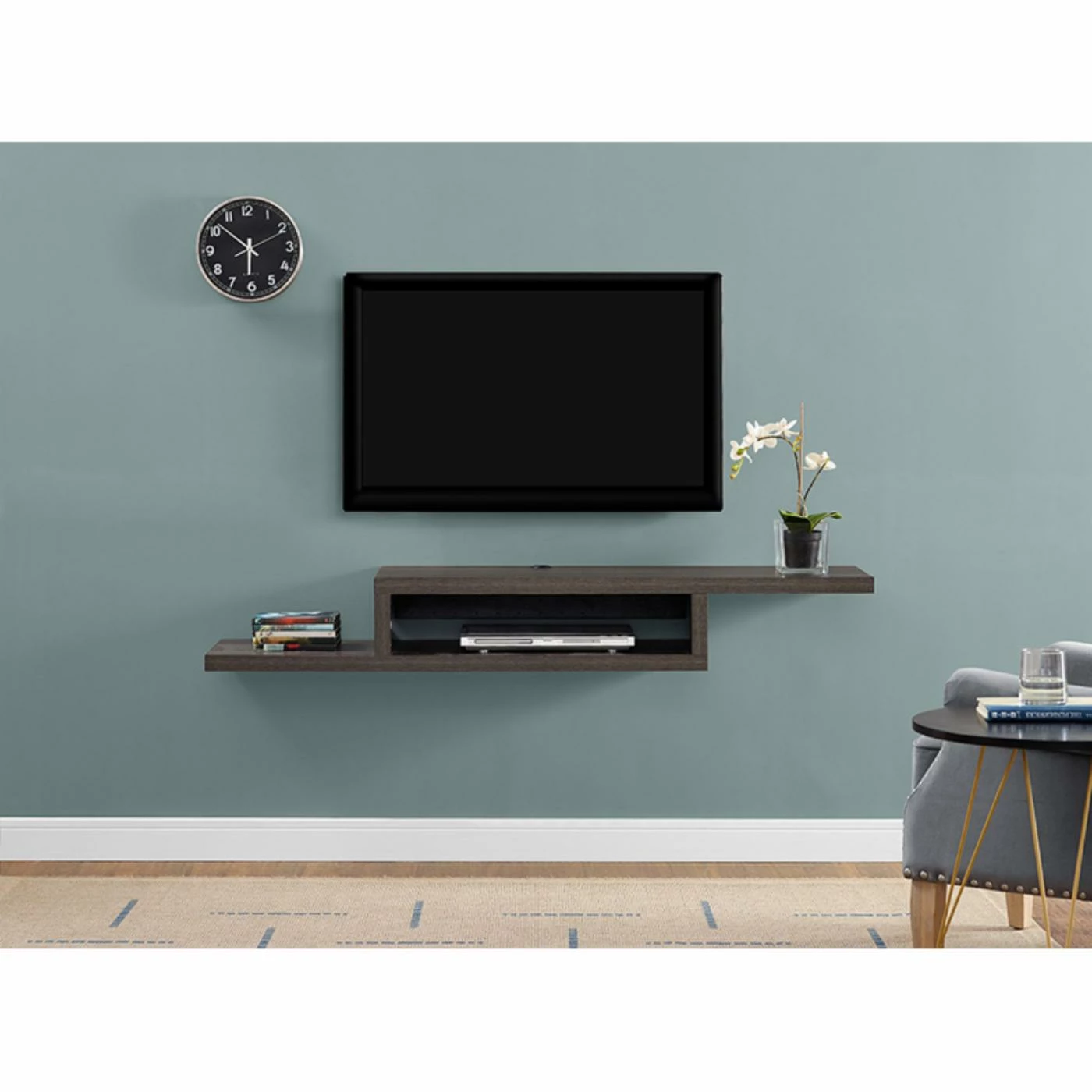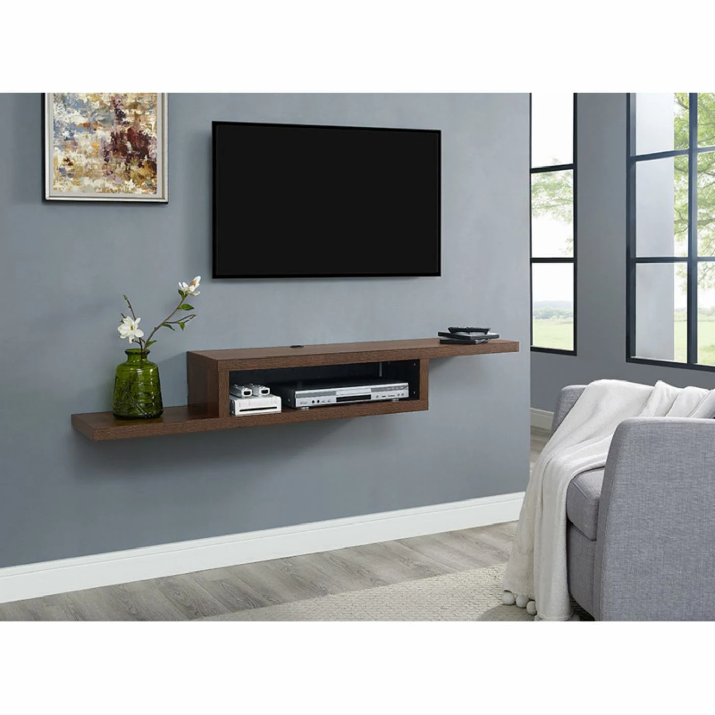 Add stylish storage below your wall-mount television with the Martin Furniture 60 in. Asymmetrical Wall Mounted TV Shelf. This wall-mounted unit features three shelves and an asymmetrical design. It easily supports the television component of your choice.