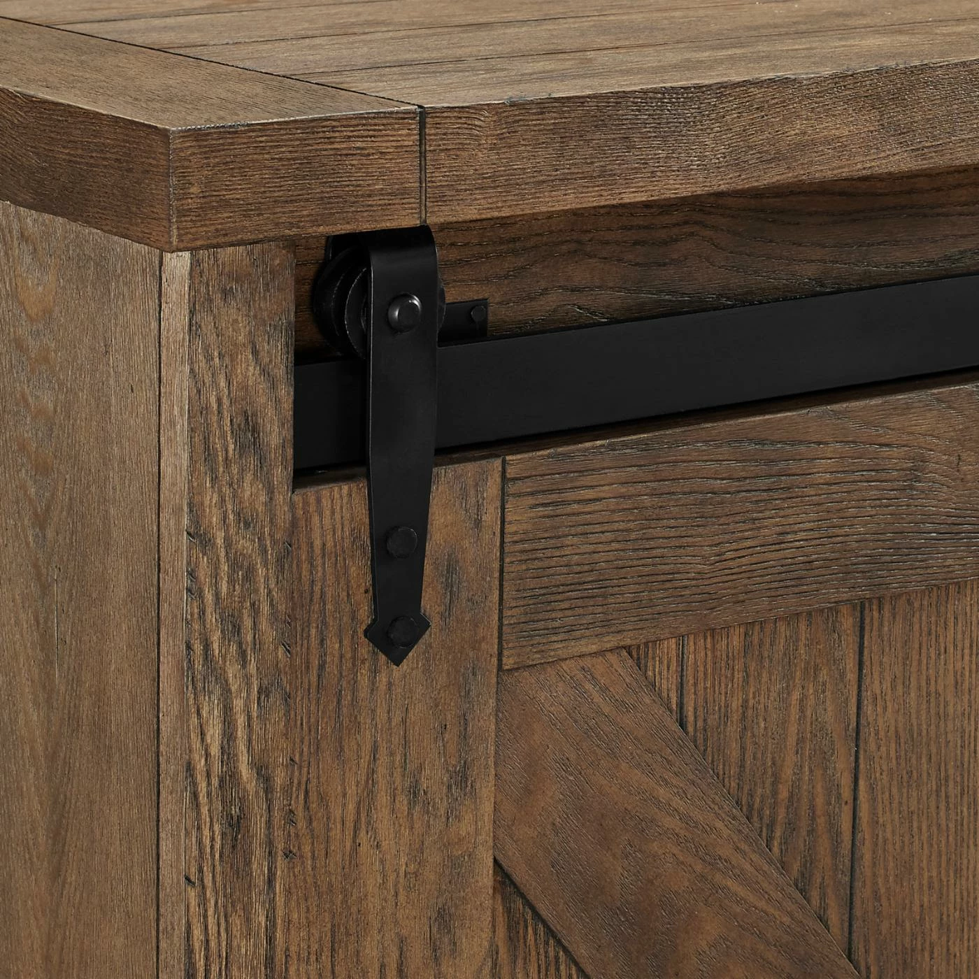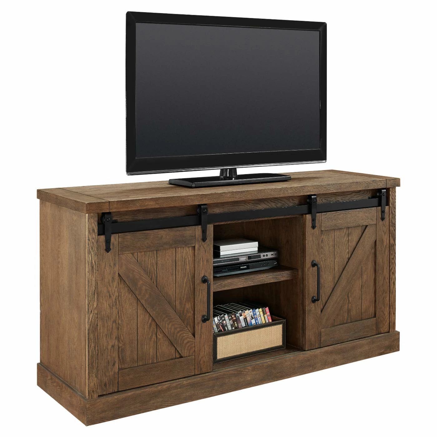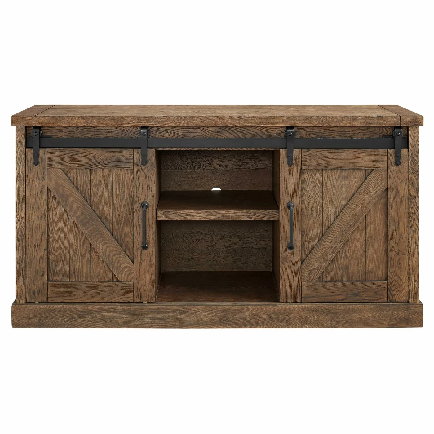 Designed to soothe your longing for simpler times, the rustic Martin Furniture Avondale Credenza TV Stand is also brilliantly suited to modern living. The hand applied weathered oak finish and mortise and tenon details create a ranch-style ambiance that suits industrial or cottage styles. Steel rails complement the basic barn door construction and heavy plank top. With two sliding doors, three fixed shelves, and cable management ports, you can host a stable of media devices.