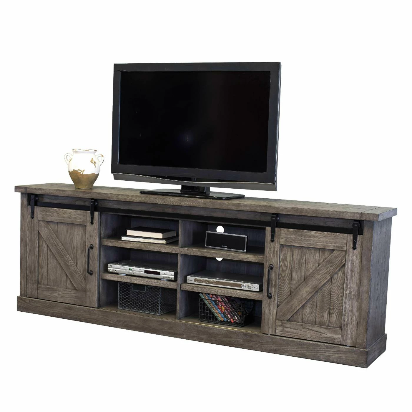 Complement your new television with the Martin Home Furnishings Bailey 60 in. High Boy TV Stand for a relaxed, rustic-style centerpiece to your dΓ©cor. This TV stand features two sliding barn-door cabinets and a six shelf center console area with vented backings for cords. Boasting hardwood construction, this TV stand features barn-door style cabinets and a cool gray finish that’s sure to look good anywhere.