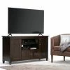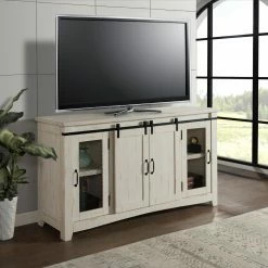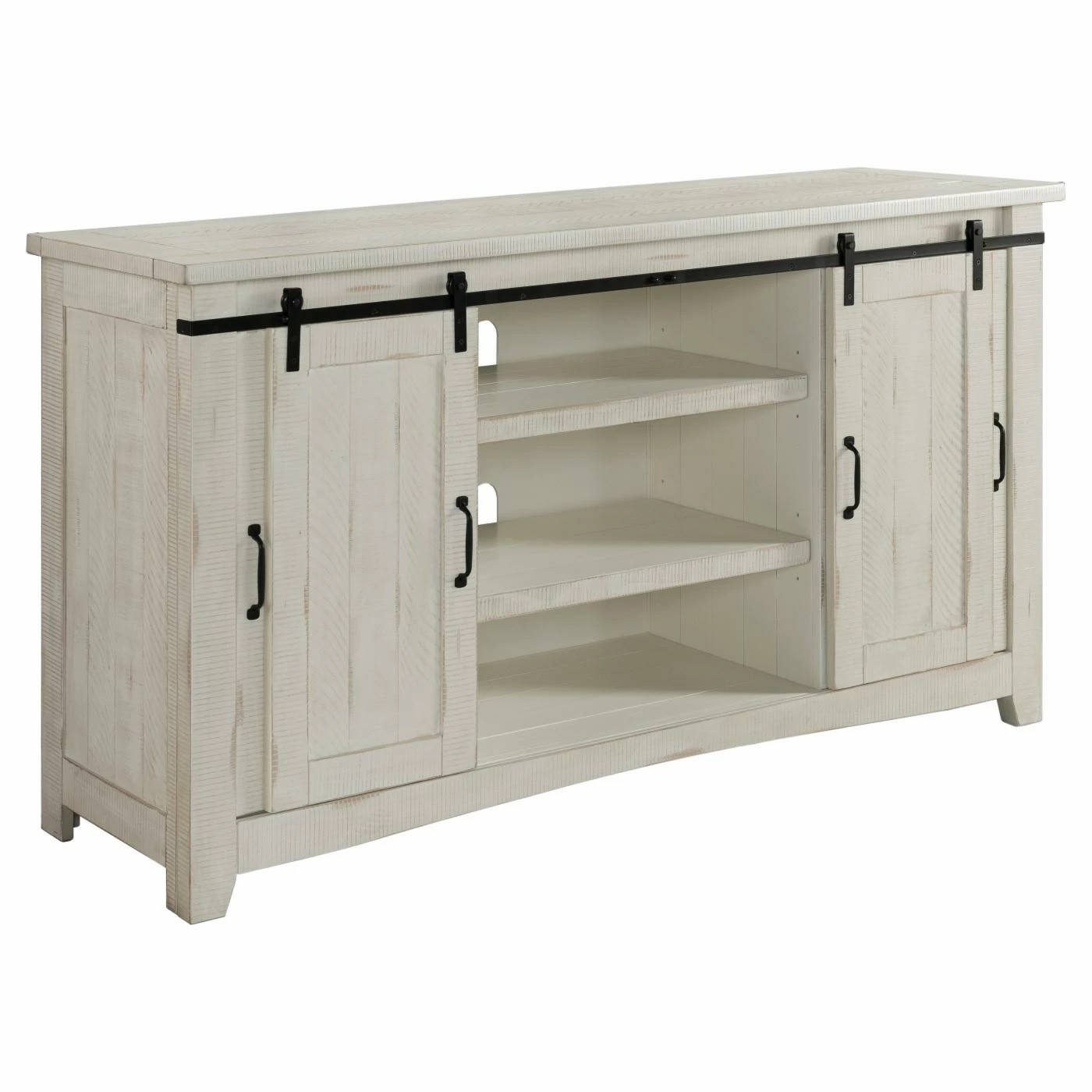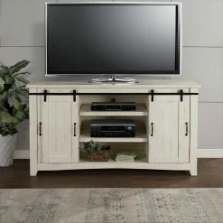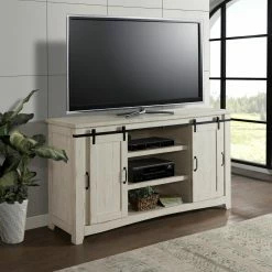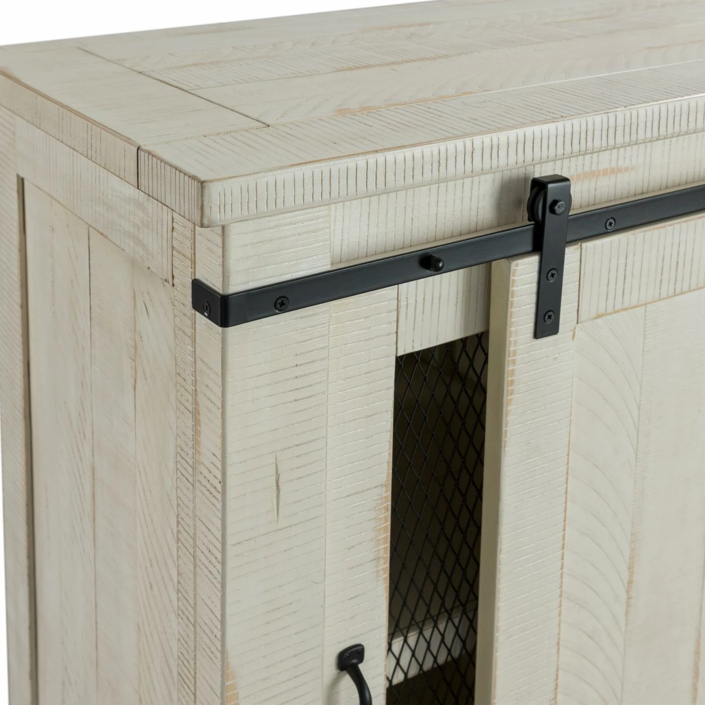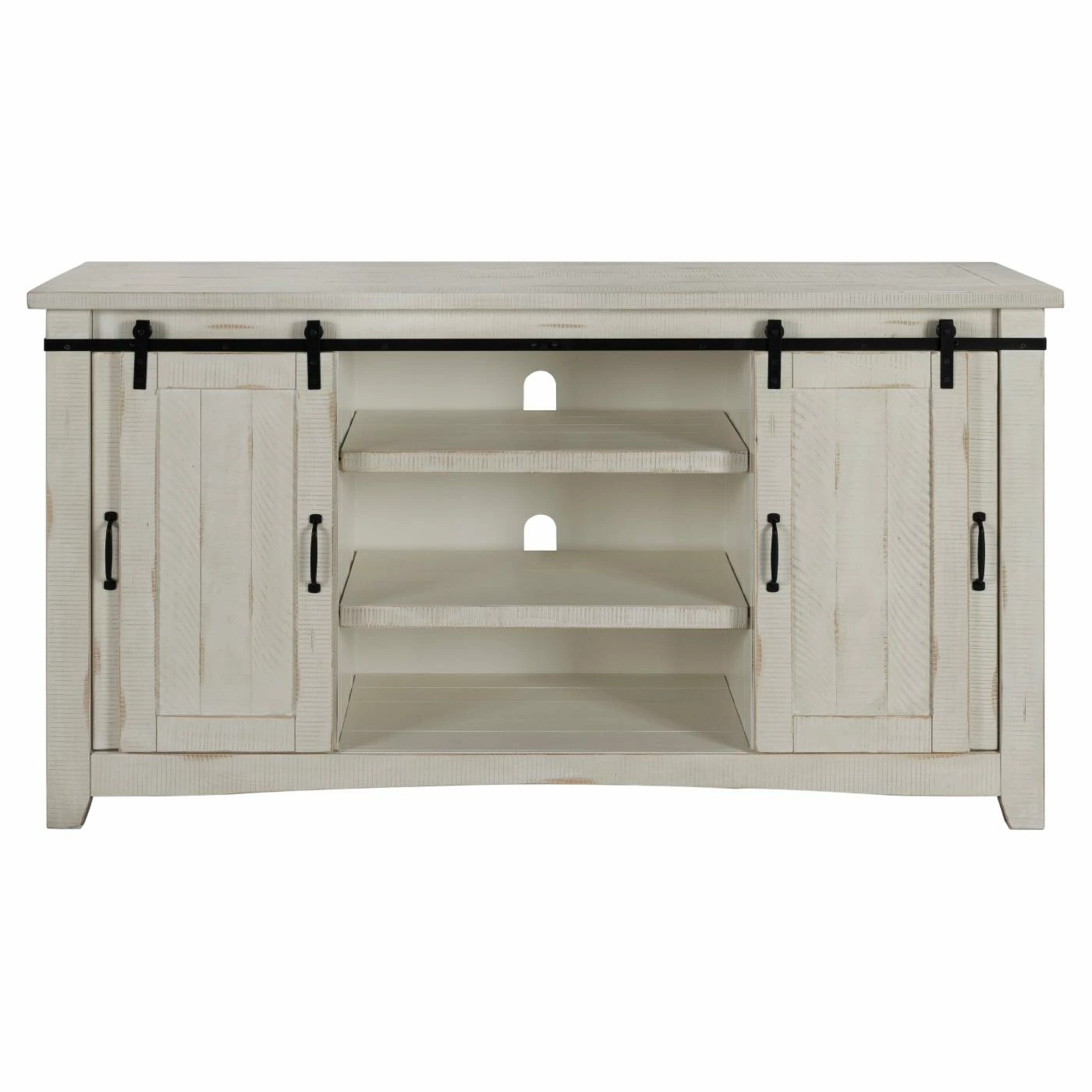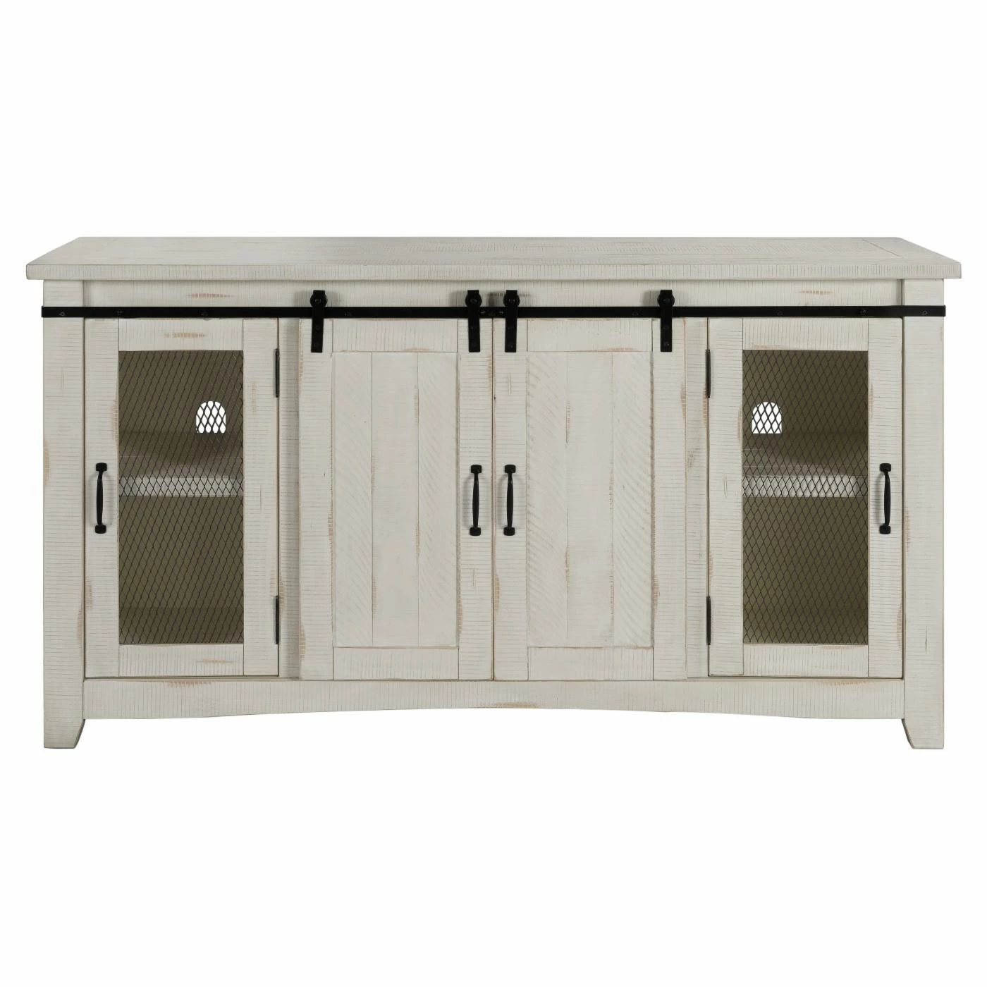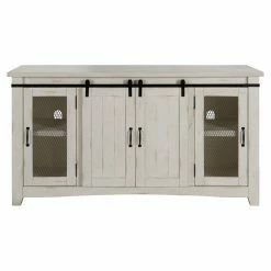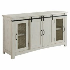 Provide a handsome farmhouse style centerpiece to your new reclaimed, relaxed living room with the Aspen 65 in. Sliding Barn Door TV Stand – Antique White. This wide stand is constructed from a combination of pine hardwood solids and engineered wood. An antique white finish lends a creamy, distressed touch to the design. Two single-door cabinets are incorporated into the design, each boasting black mesh framed panels and an adjustable shelf. Sliding double barn doors provide additional storage for electronic accessories while vented backing panels assist with cord-management.