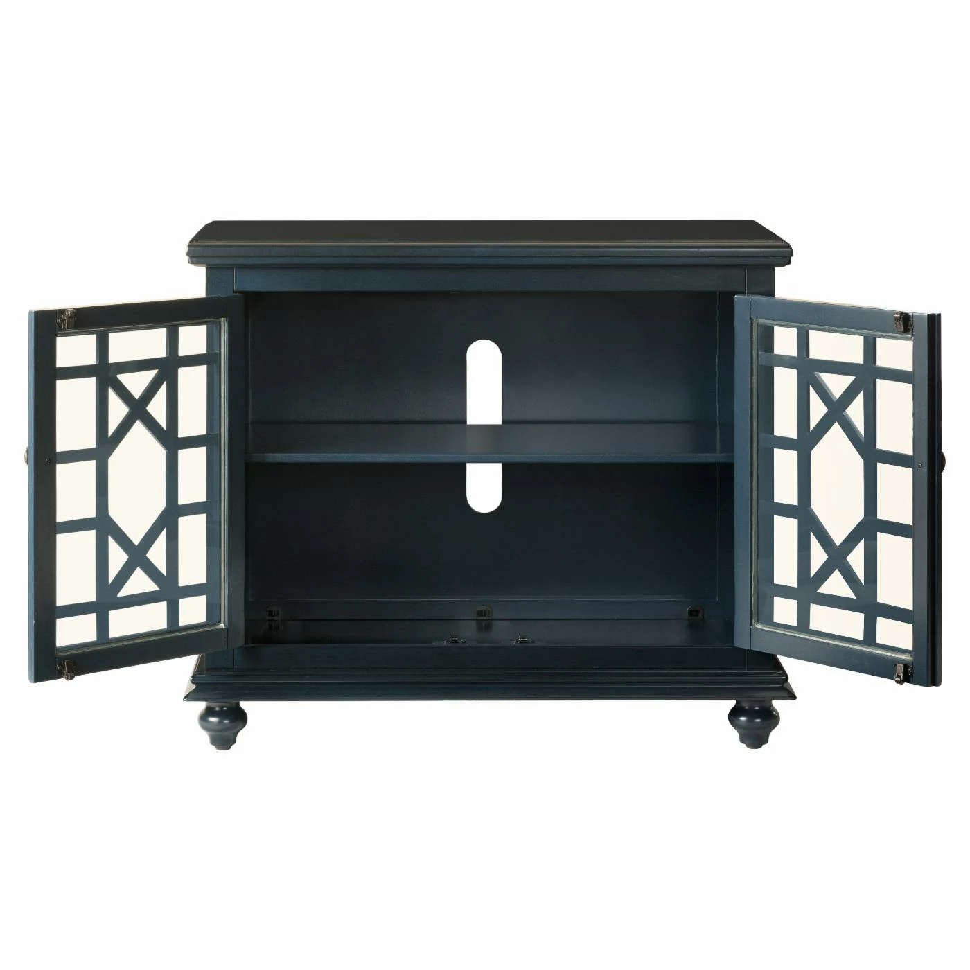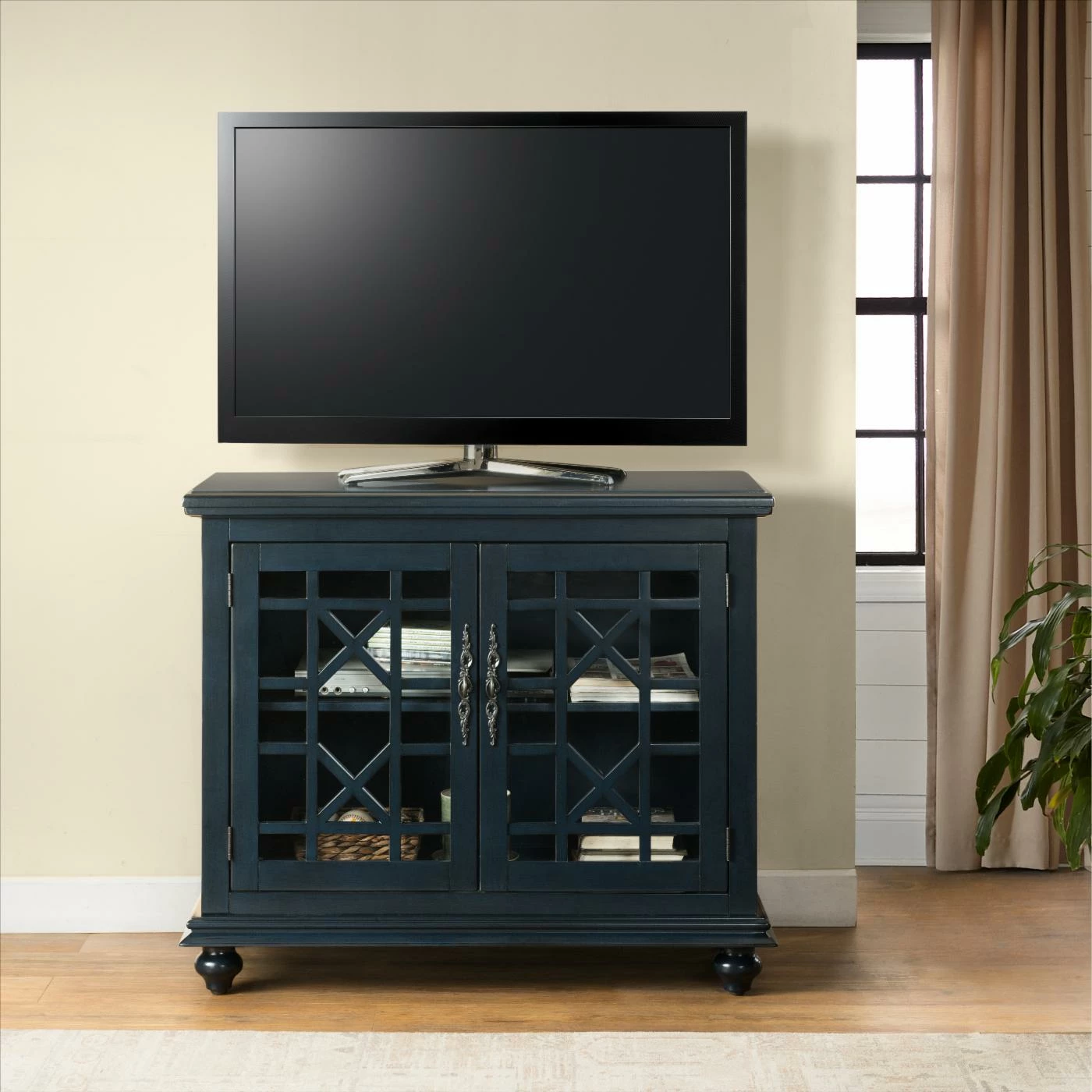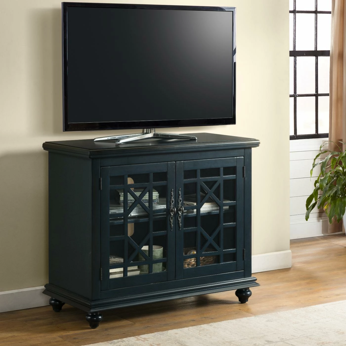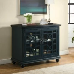The Avalon Small Spaces 38 in. TV Stand – Catalina Blue might have a small footprint, but easily supports moderately-sized televisions with ample built-in storage space. Lightweight wood constructs the frame, perched on bun feet. A dark Catalina blue tone finishes the wood, accented by pewter antique metal handles. The cabinet doors have a framed, clear glass design with a geometric trellis pattern.