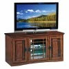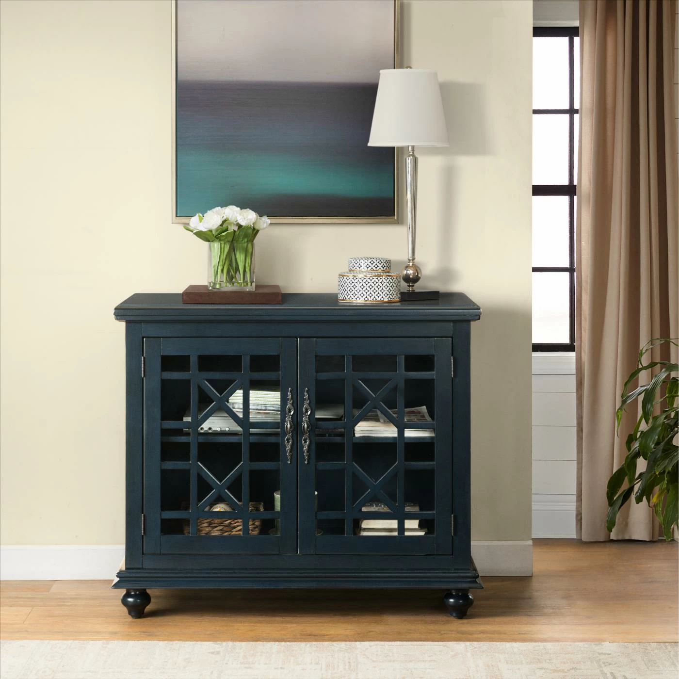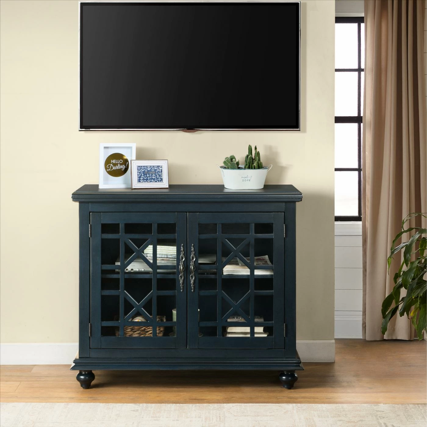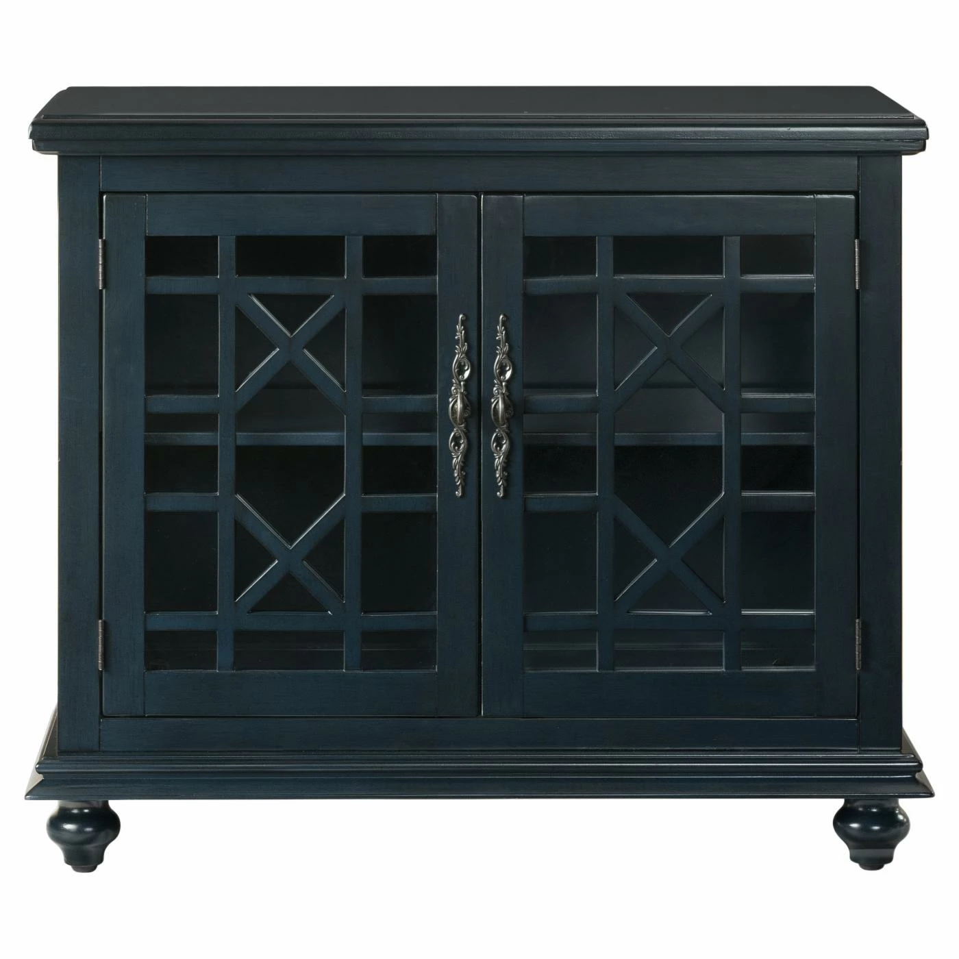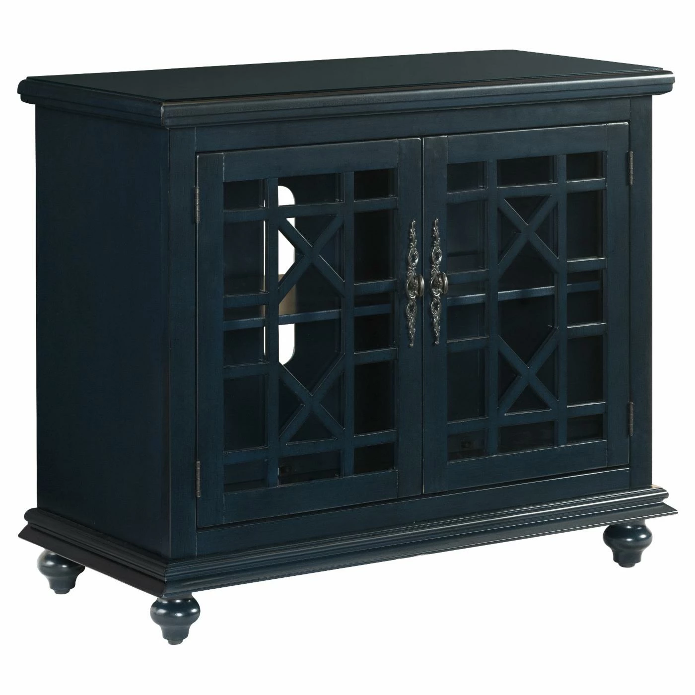 The Avalon Small Spaces 38 in. TV Stand – Catalina Blue might have a small footprint, but easily supports moderately-sized televisions with ample built-in storage space. Lightweight wood constructs the frame, perched on bun feet. A dark Catalina blue tone finishes the wood, accented by pewter antique metal handles. The cabinet doors have a framed, clear glass design with a geometric trellis pattern.