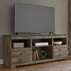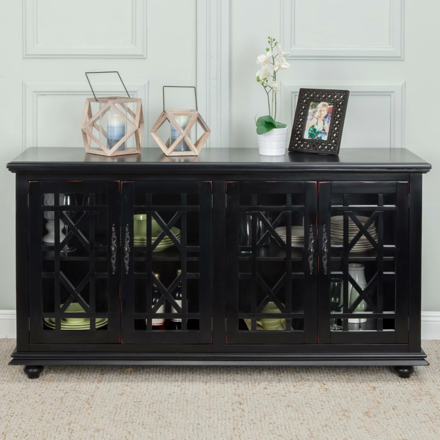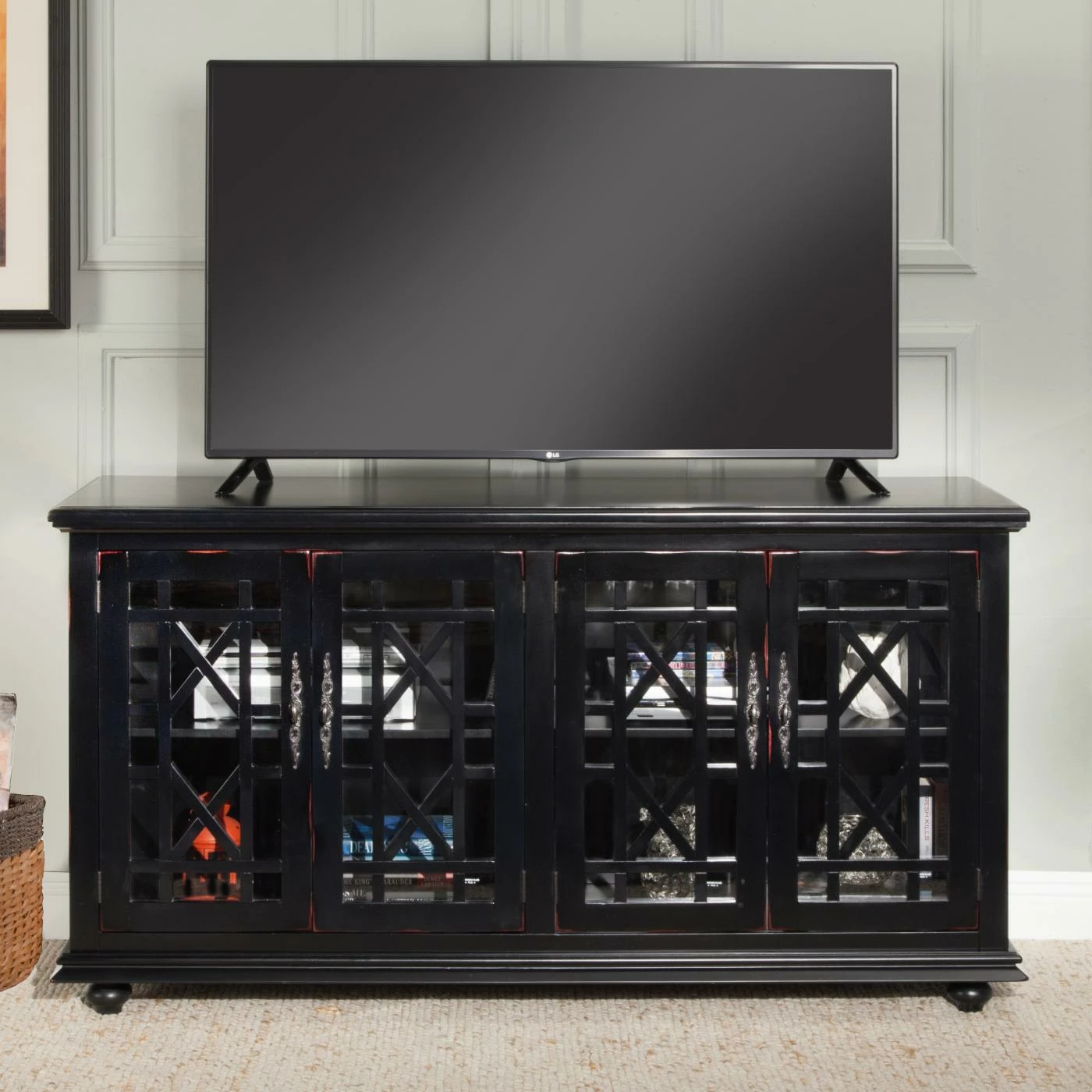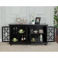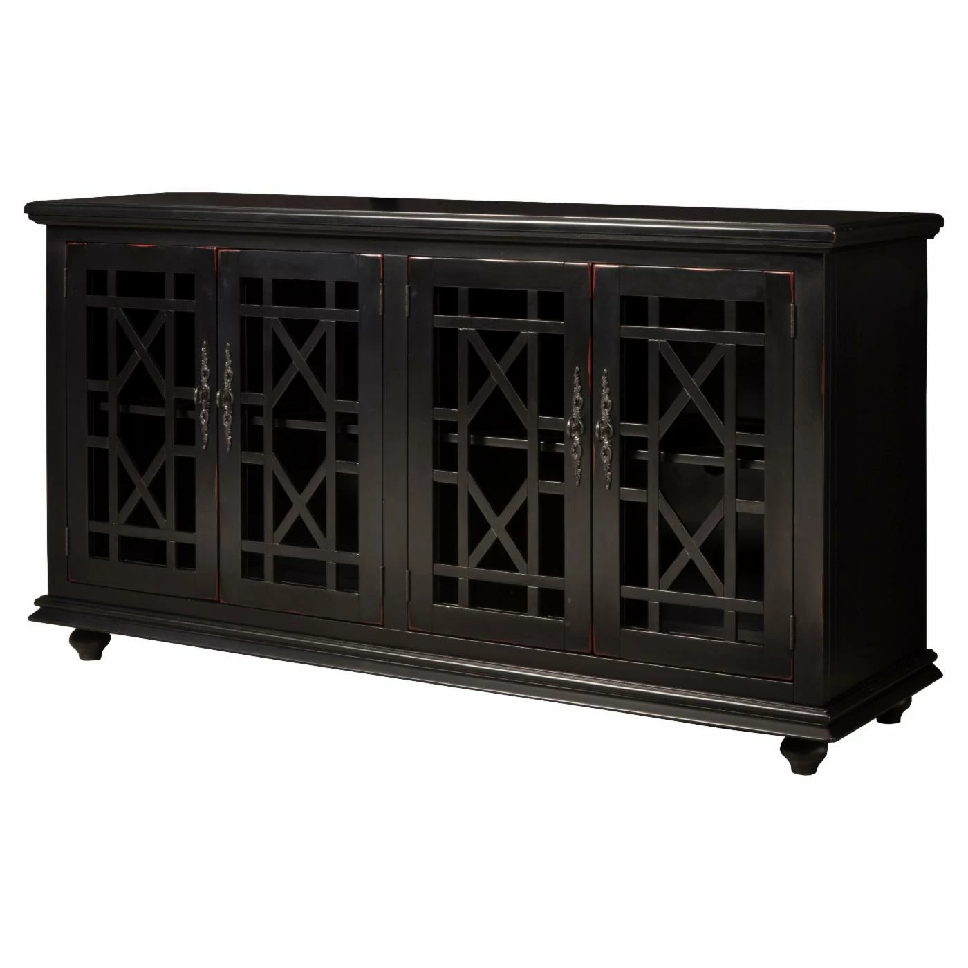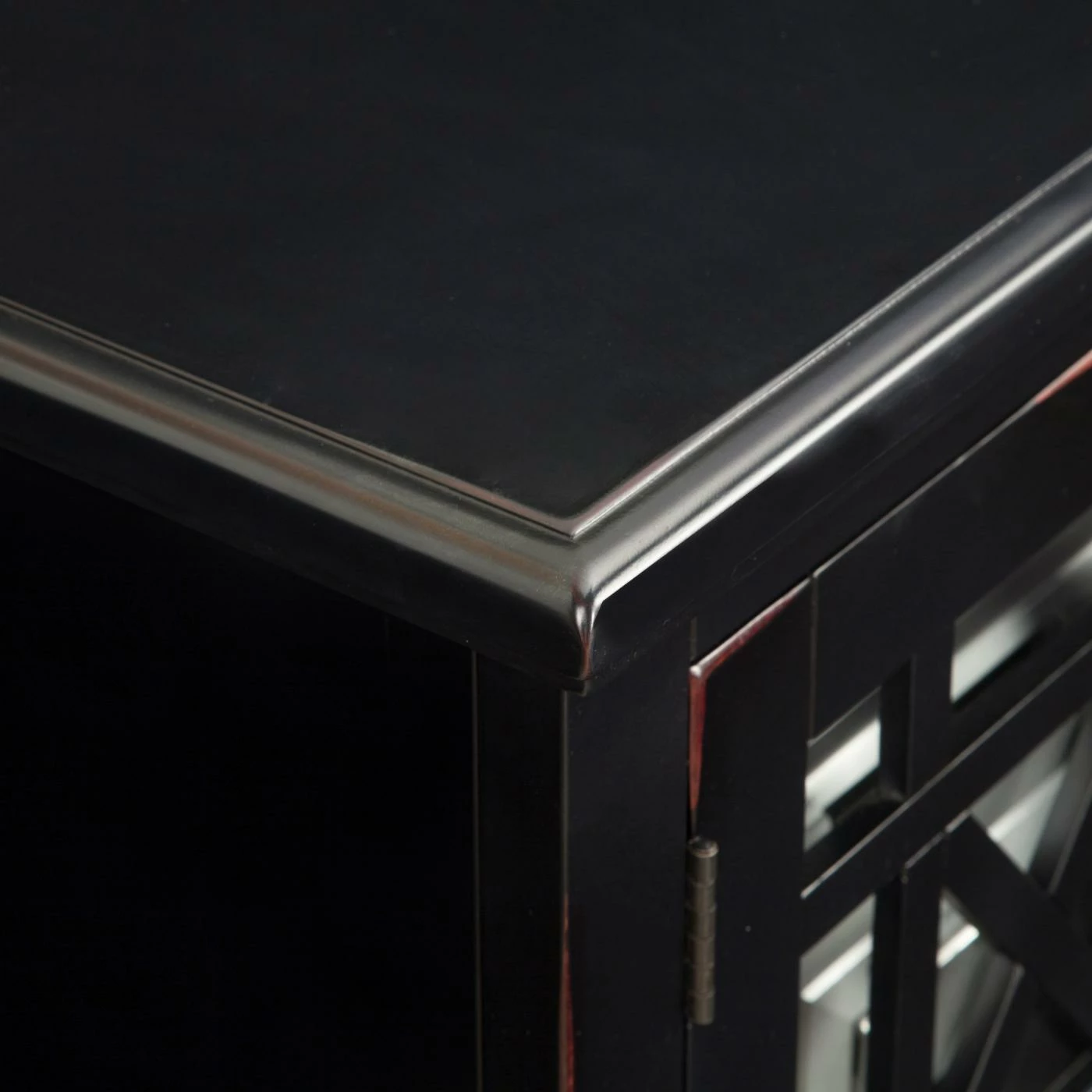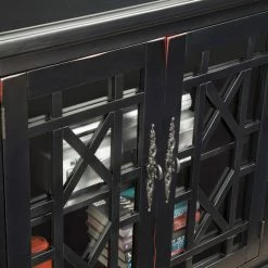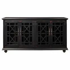 Blending minimalist lines, bold colors, and classical accents, the Cassandra 63 in. TV Stand – Antique Black is a one-of-a-kind complement to help you find your living room’s personality. This wide stand is rendered from lightweight and long-lasting engineered wood. Turned bun feet provide a stable platform. The frame is topped by an antique black finish with a rubbed, weathered design. Two cabinets offer endless storage, outfitted with adjustable shelving and vented backing. The doors each feature clear-glass panels with a trellis overlay and antique metal handles.