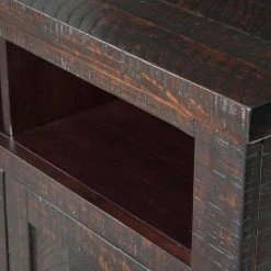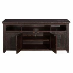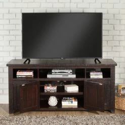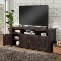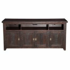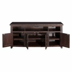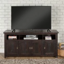 Lend some lodge-style casual charm to your living room design with the Coffee Plantation 65 in. TV Stand. This wide stand is rendered from solid pine hardwood and engineered wood, complemented by scratches and scuffs. For storage, three open shelves let you easily install cable boxes, game consoles, and more. The base has two single-door cabinets and a wide double-door cabinet, each featuring adjustable shelves and vented backing. Your choice of availalbe finish options.
