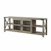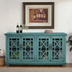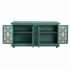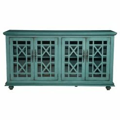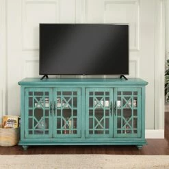 Brighten up your living room with the Jules 63 in. TV Stand – Teal. This brilliant TV stand is made from lightweight engineered wood with turned, bun feet and a vibrant teal blue finish. The base is home to two wide cabinets with adjustable shelves and vented backings for cord management. Each cabinet door is inlaid with clear glass and an angular trellis design.