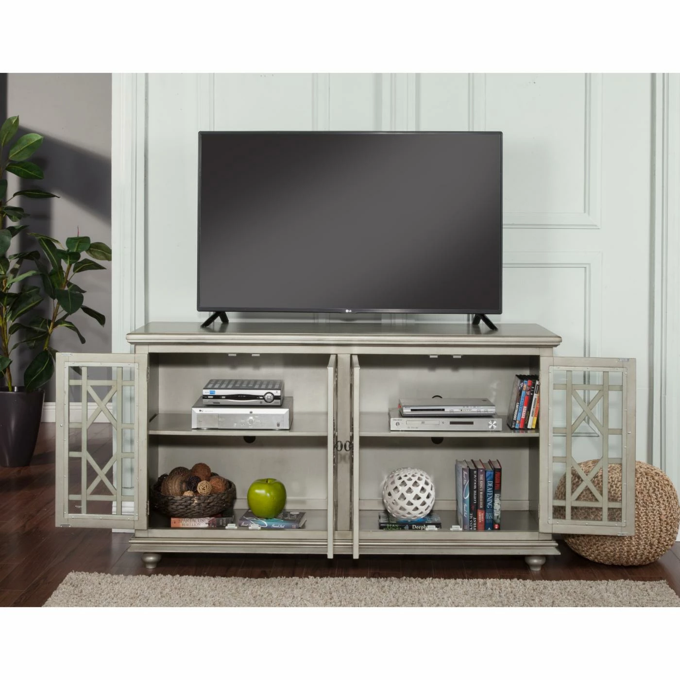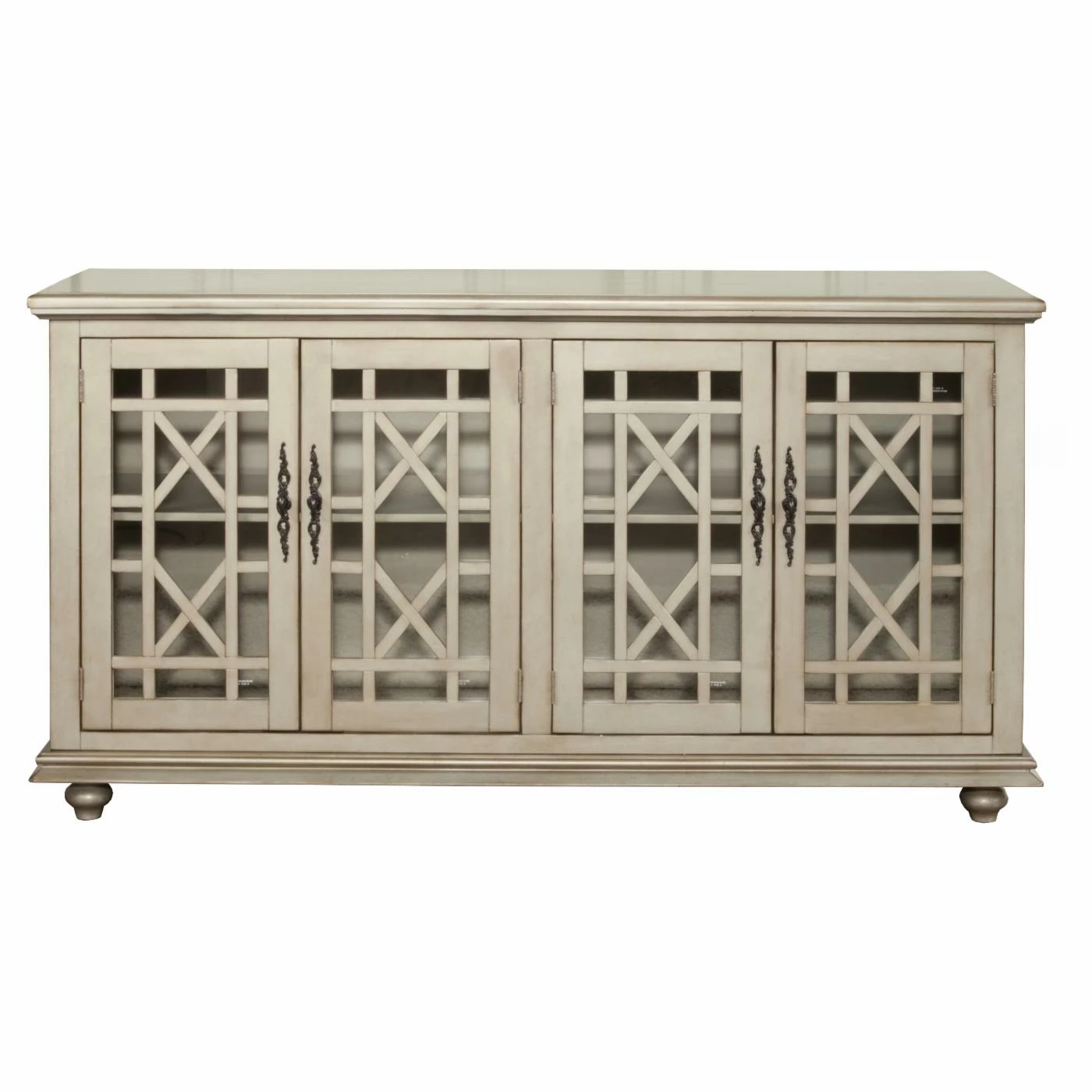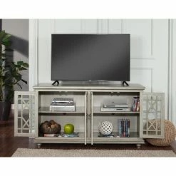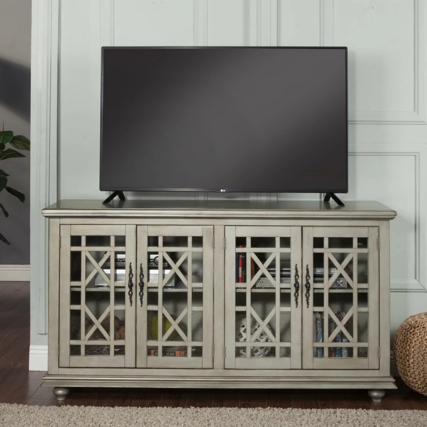Don’t let your sleek new television clash with the rest of your dΓ©cor: the Marche 63 in. TV Stand – Antique Silver is here to help make your flat-screen better blend into the rest of your room design. The wide frame features bun feet and is rendered from long-lasting wood. An antique silver finish provides a timeless vintage appeal to the stand. Two double-door cabinets off endless amounts of space for your electronics, movies, games, and more. Each door is backed by clear glass with an angled trellis slat overlay.