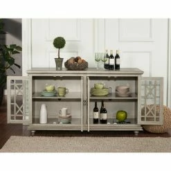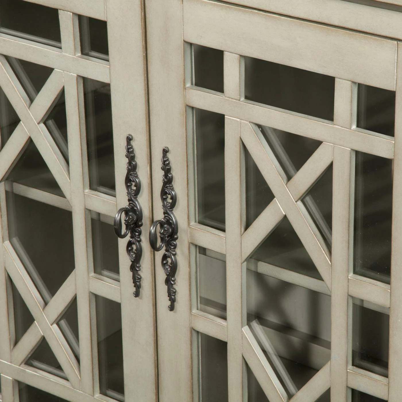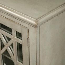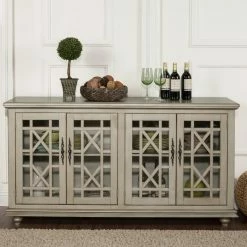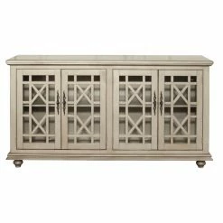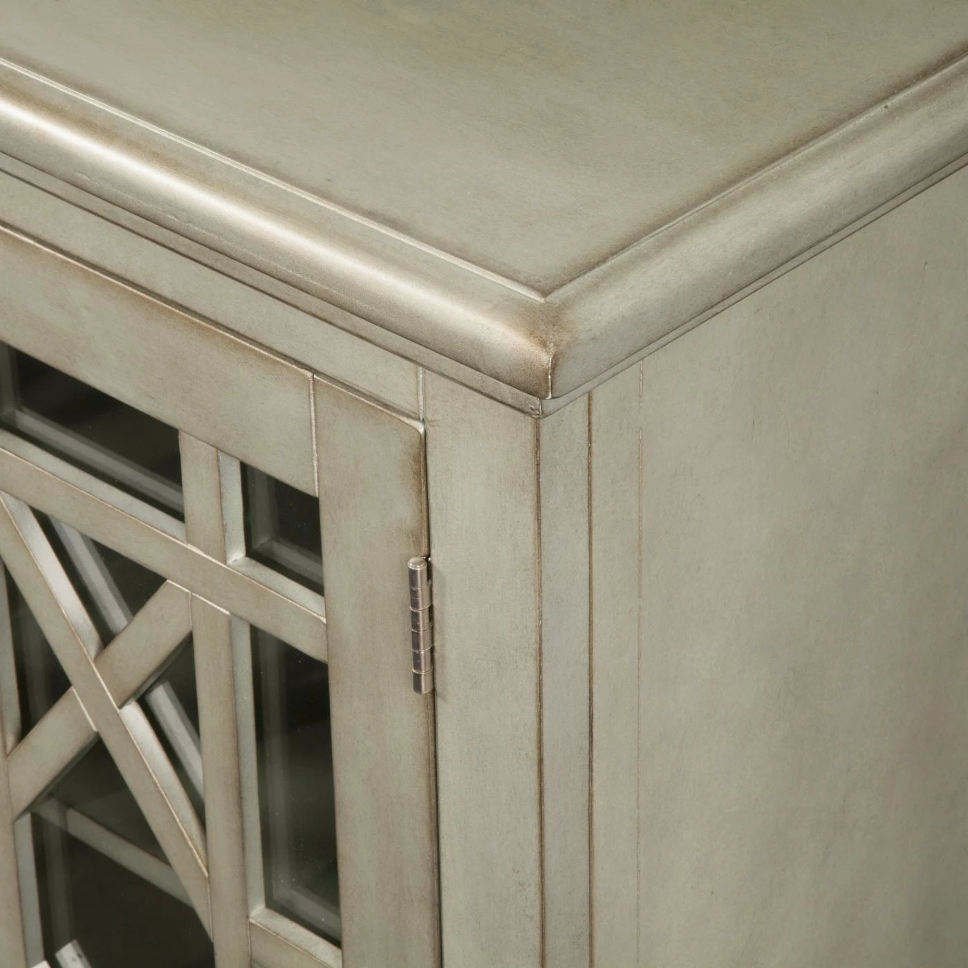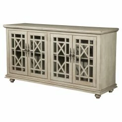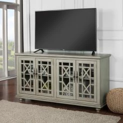 Don’t let your sleek new television clash with the rest of your dΓ©cor: the Marche 63 in. TV Stand – Antique Silver is here to help make your flat-screen better blend into the rest of your room design. The wide frame features bun feet and is rendered from long-lasting wood. An antique silver finish provides a timeless vintage appeal to the stand. Two double-door cabinets off endless amounts of space for your electronics, movies, games, and more. Each door is backed by clear glass with an angled trellis slat overlay.