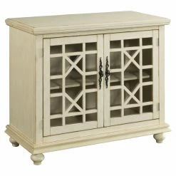 Don’t need a television that takes up an entire wall? The Orsey Small Spaces 38 in. TV Stand – Antique White is right there with you. An ideal option for more modest TVs, this stand features a double-door cabinet in the base for all your storage needs. The cabinet is outfitted with an adjustable shelf and vented backing. Each door has a clear glass backing panel and a geometric trellis slat design. The wood comes finished in creamy antique white.