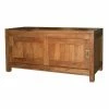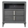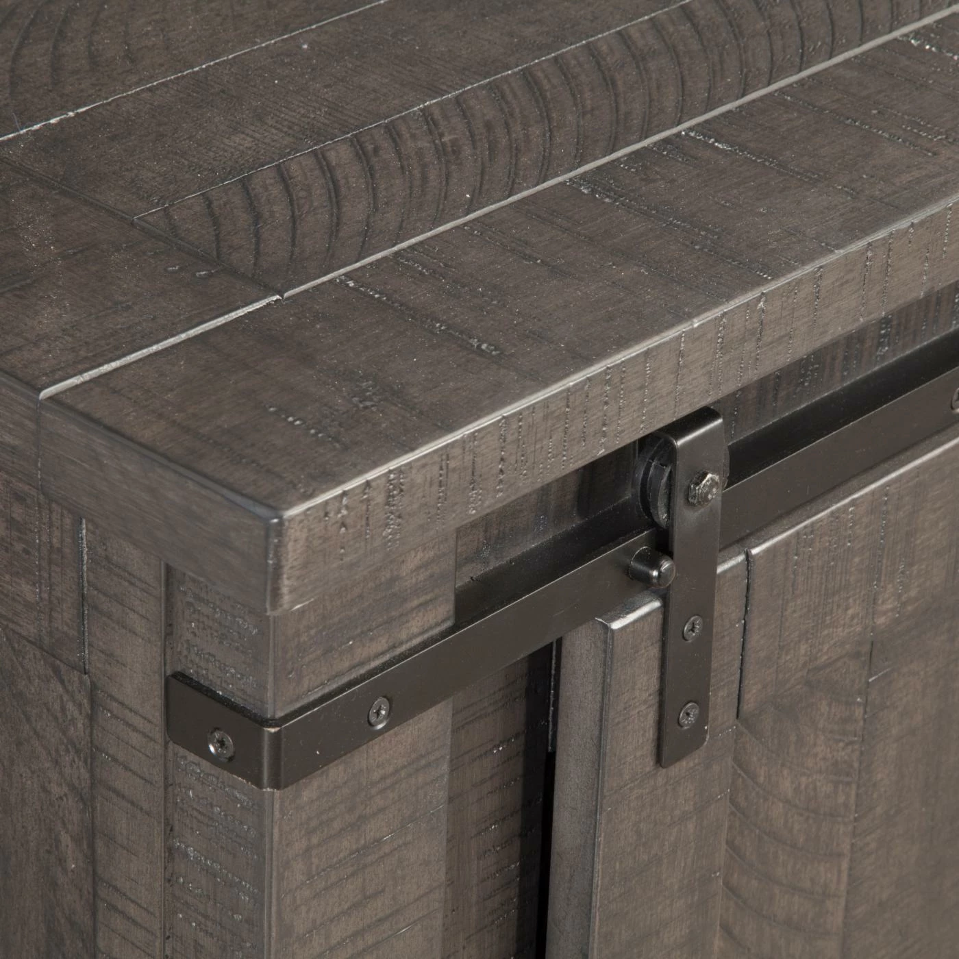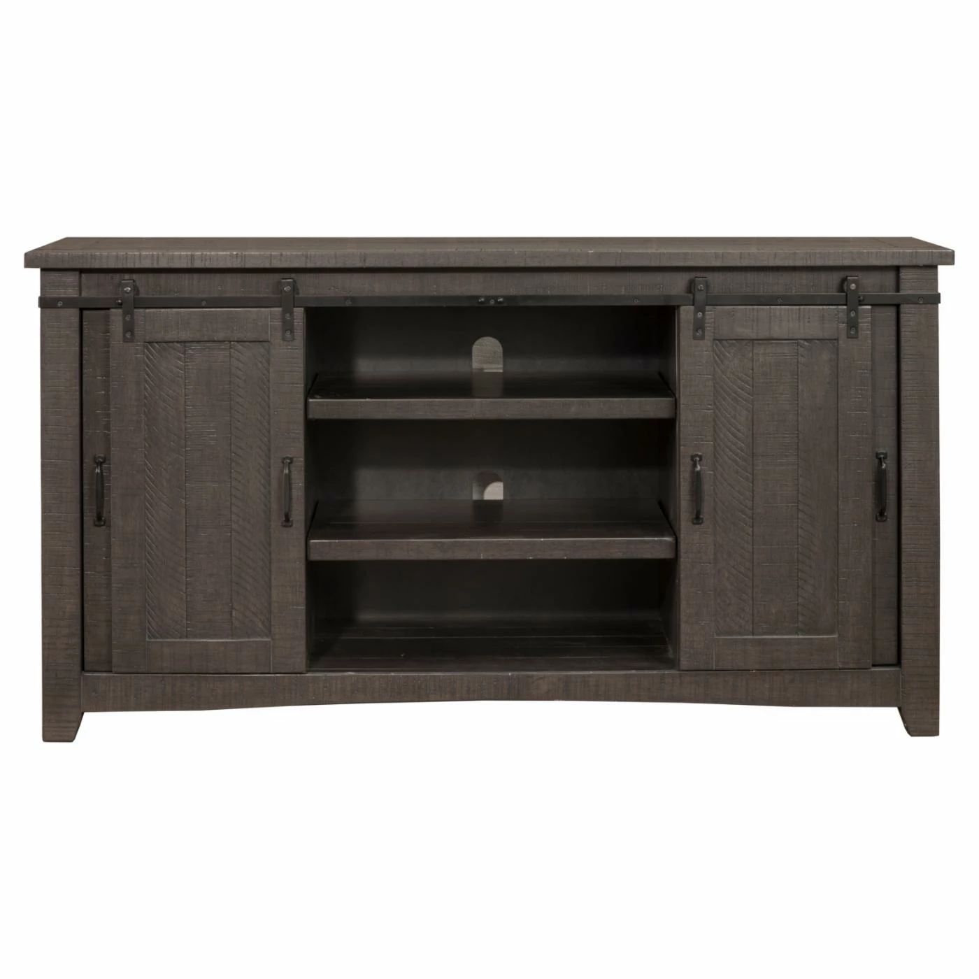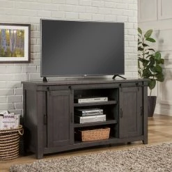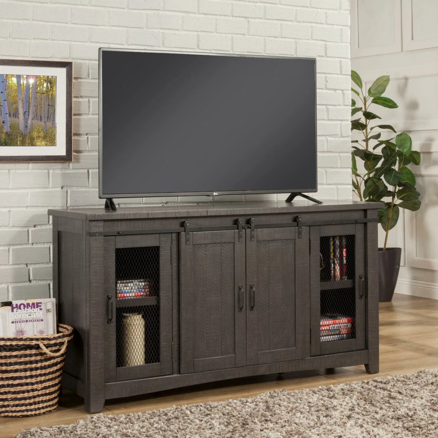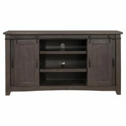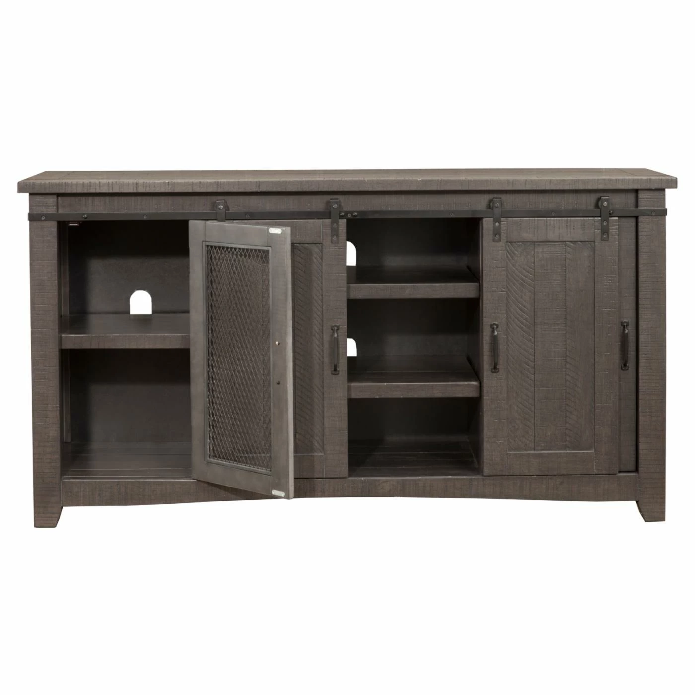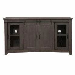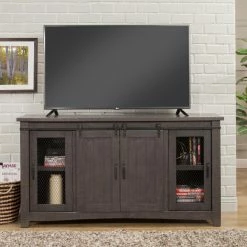 Complement your casual modern living room with the Sierra 65 in. Sliding Barn Door TV Stand – Gray for plentiful storage for your new television and all its accessories. The frame is constructed from durable pine hardwood and engineered wood with a subtle scuffed, distressed texture. The base has framed double barn-door cabinets in the center with two adjustable shelves. Two additional cabinets are incorporated into the sides, fronted with wire mesh panels. The backing has vented holes for cords.