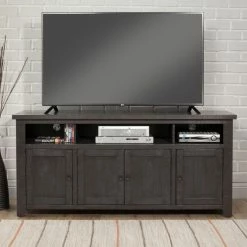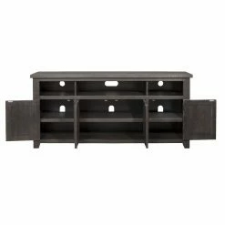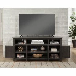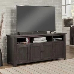 Reinvent your bedroom or living room with refined modern aplomb thanks to the West Mill 65 in. TV Stand – Gray. This stand has a low, wide frame rendered from durable pine hardwood with a wide top and plentiful storage in the base. The wood surface is artfully distressed and finished in a deep woodsy gray. Three sectioned shelves provide a perfect spot for your stereo receiver, favorite media, and more. A double-door base cabinet and two single door cabinets offer concealed storage, each outfitted with interior shelves.