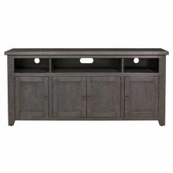 Reinvent your bedroom or living room with refined modern aplomb thanks to the West Mill 65 in. TV Stand – Gray. This stand has a low, wide frame rendered from durable pine hardwood with a wide top and plentiful storage in the base. The wood surface is artfully distressed and finished in a deep woodsy gray. Three sectioned shelves provide a perfect spot for your stereo receiver, favorite media, and more. A double-door base cabinet and two single door cabinets offer concealed storage, each outfitted with interior shelves.