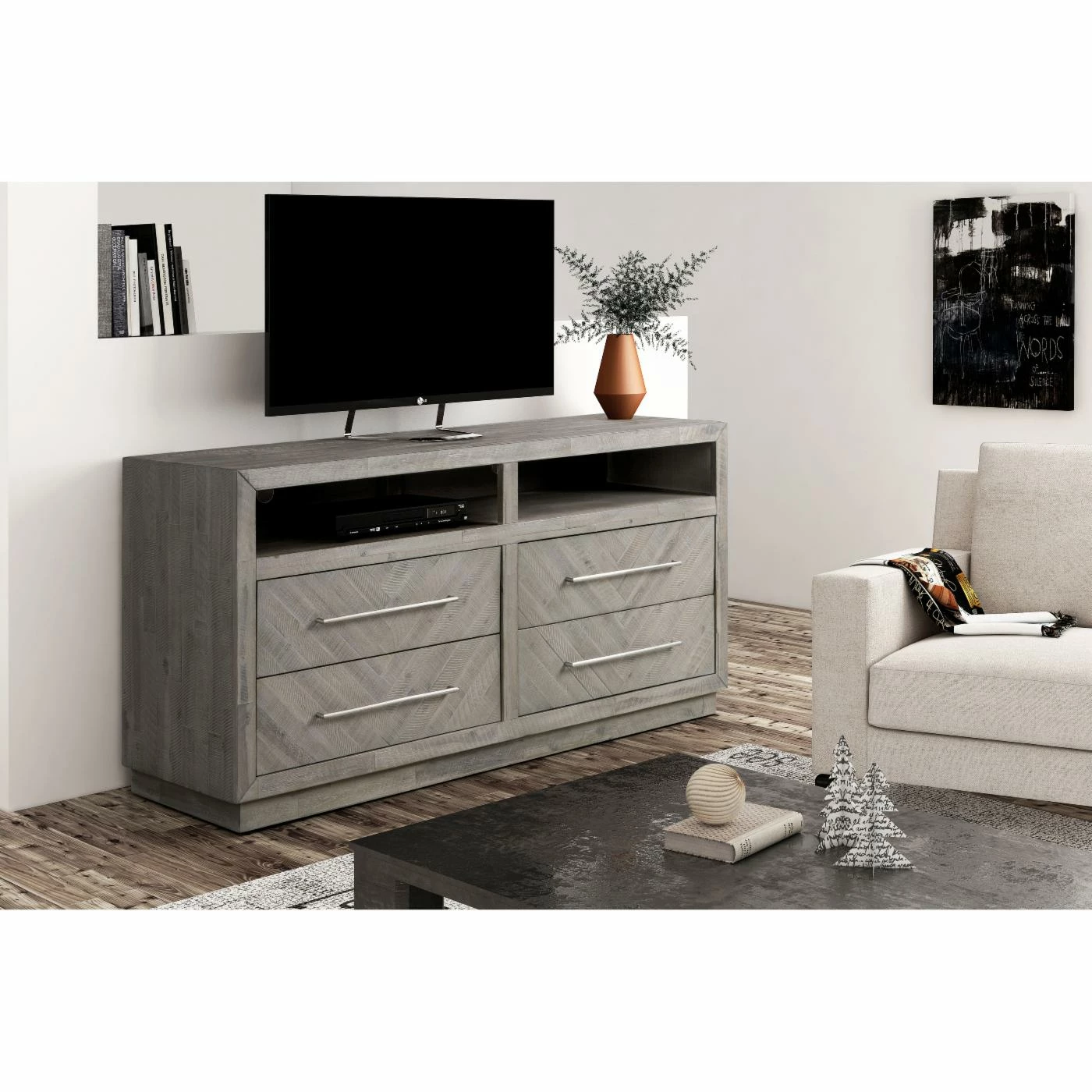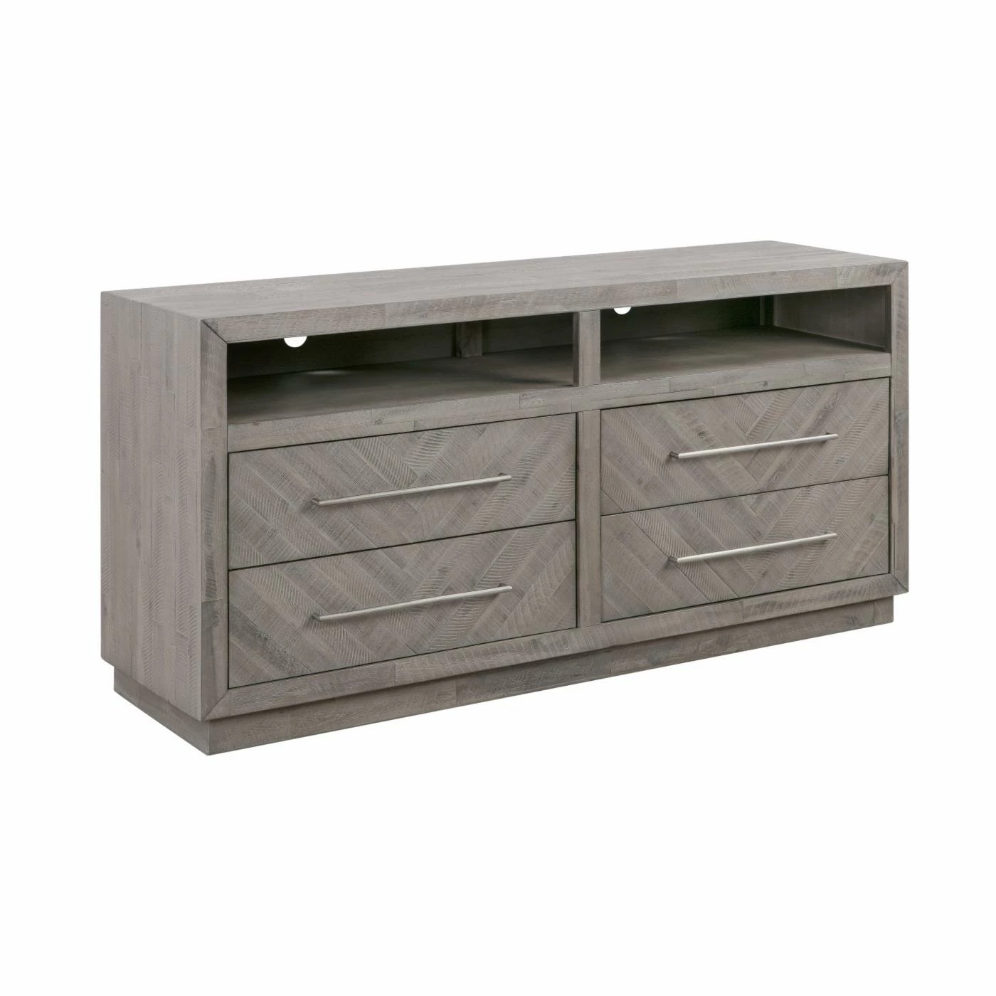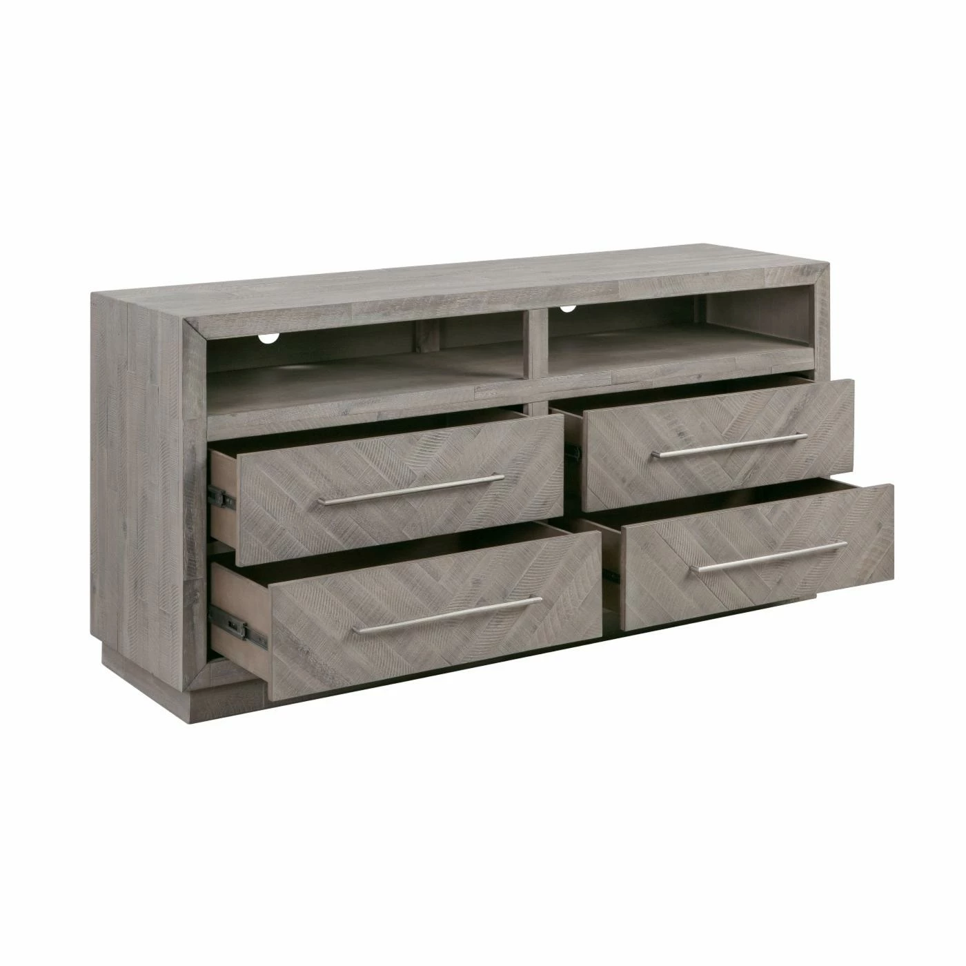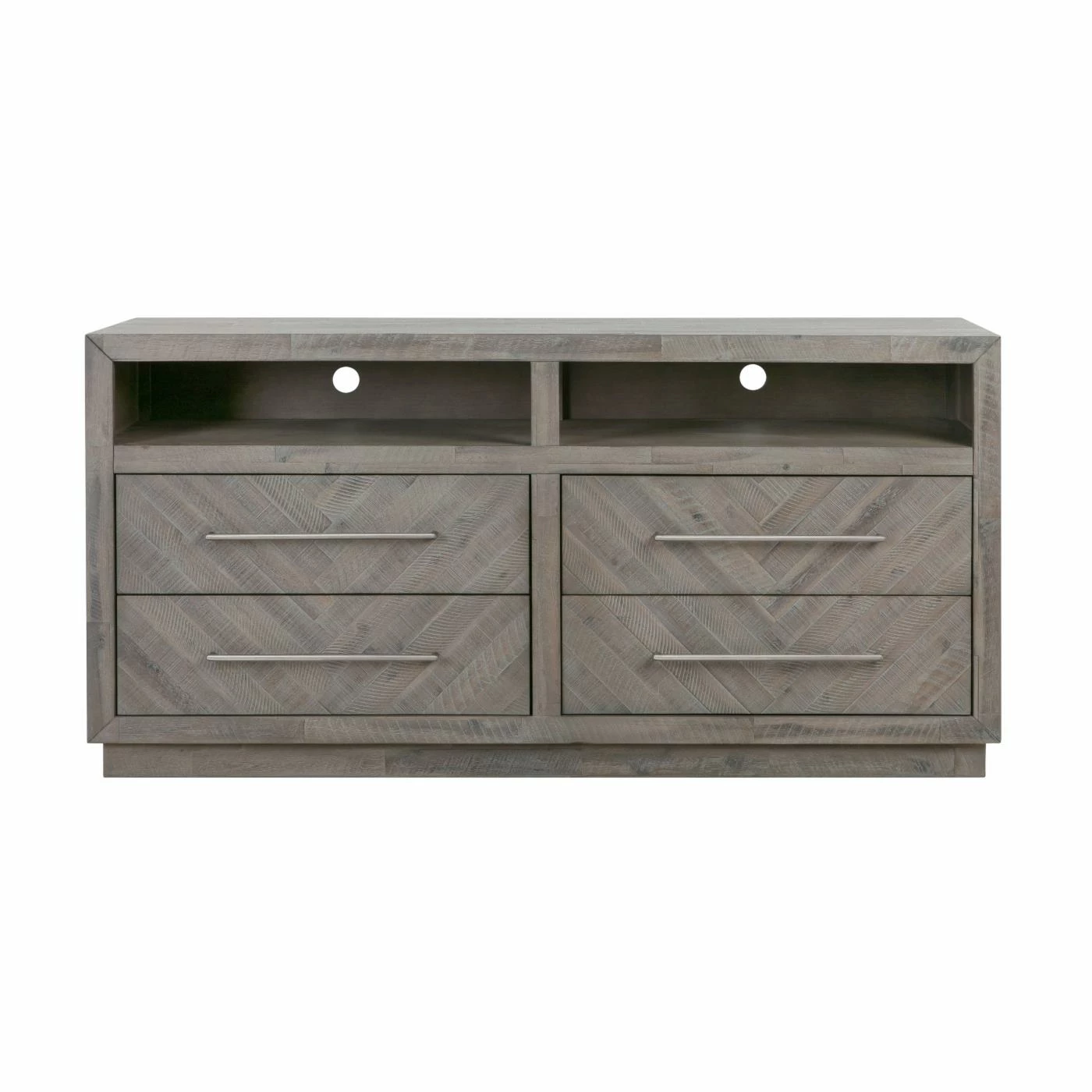 Add some rustic contemporary design to your living or family area with the Modus Alexandra 64 in. Media Console TV Stand – Rustic Latte. Constructed of solid acacia, the stand features distressing reminiscent of hand sawed planks and a driftwood gray finish. The contemporary styled herringbone pattern and chrome drawer pulls blend to make the perfect mesh of modern and rustic decor.