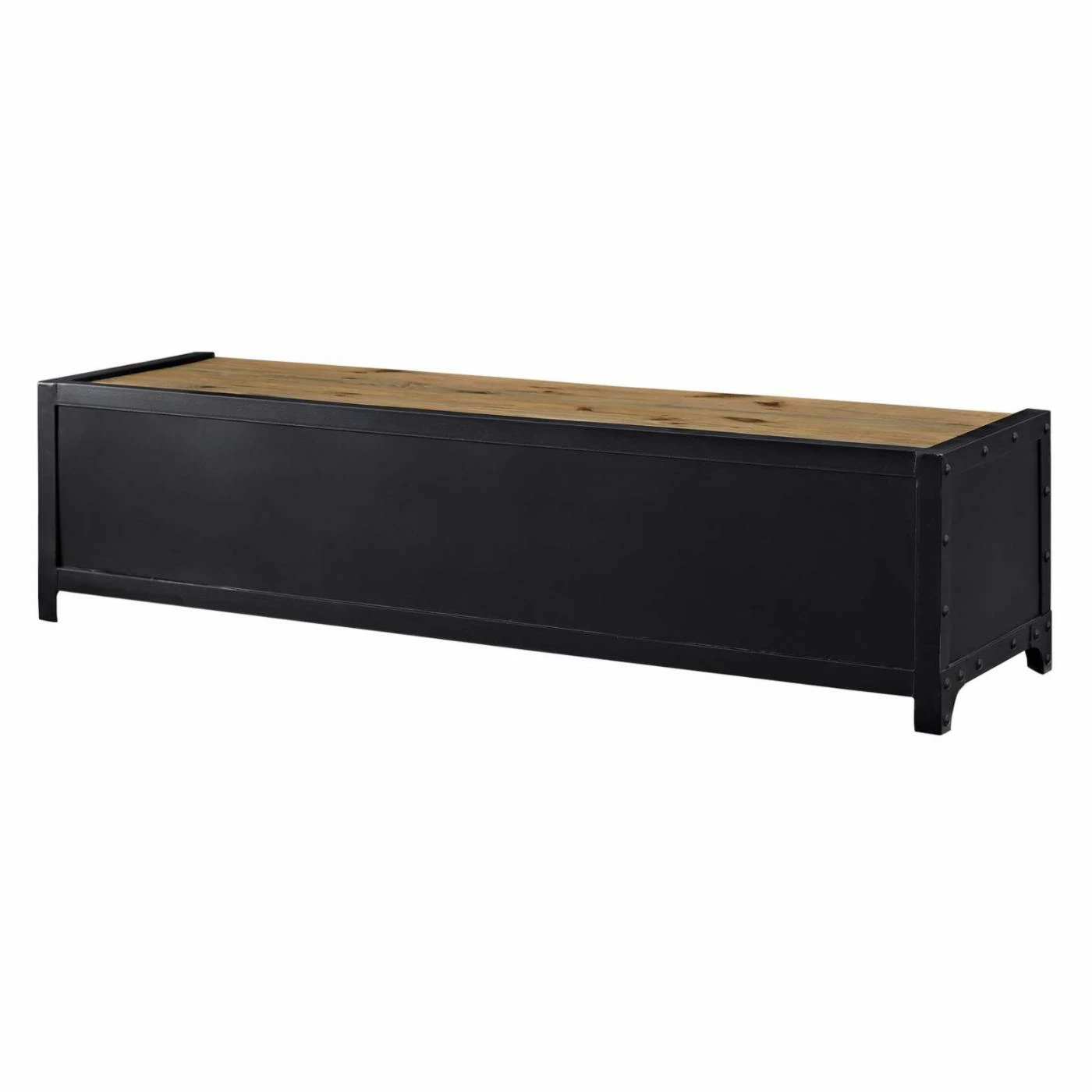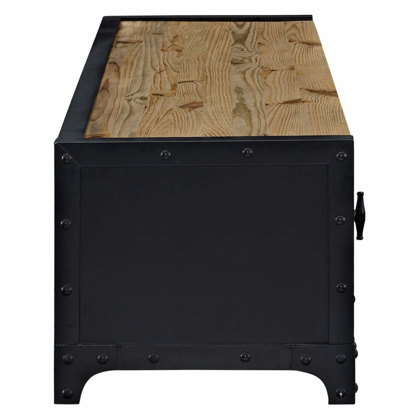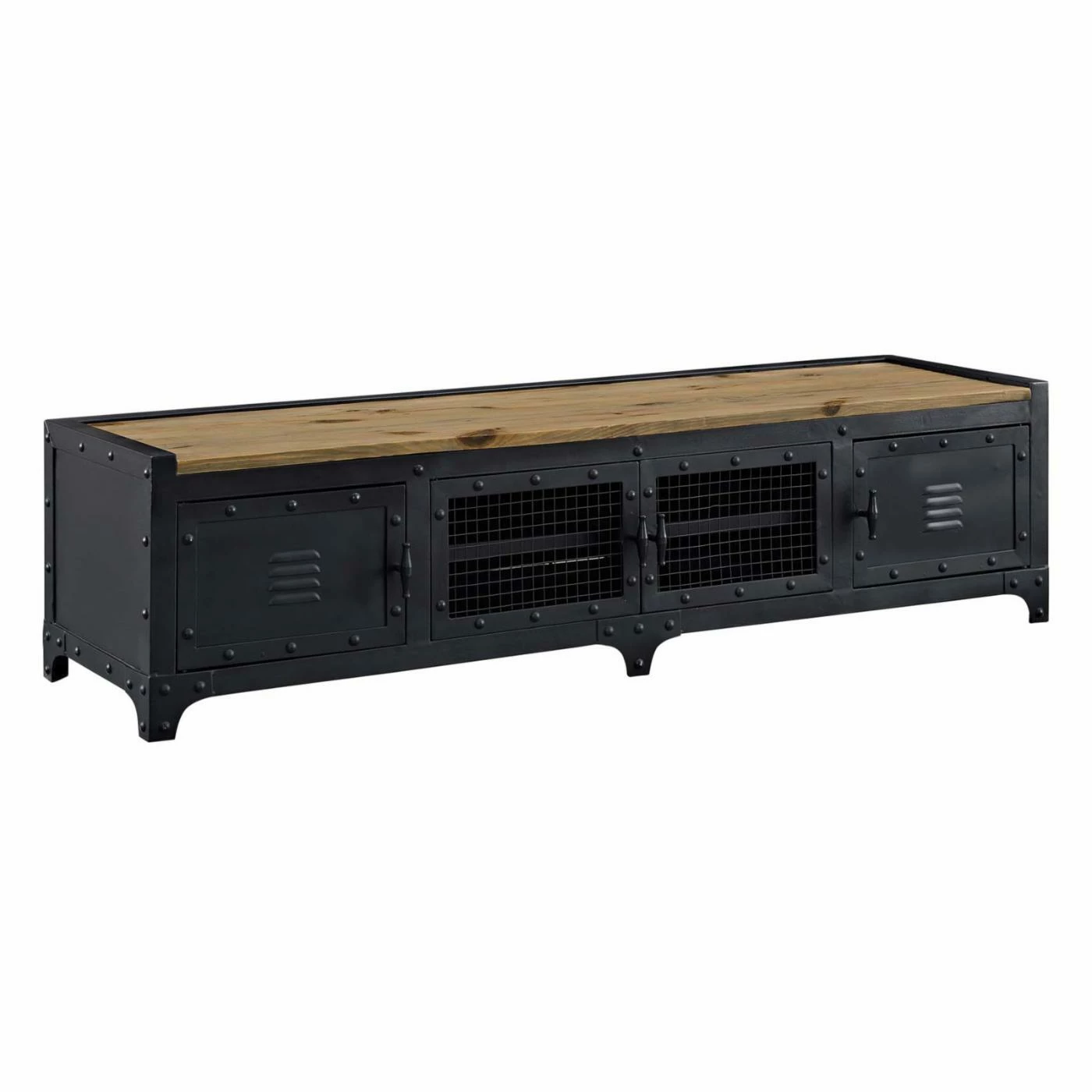 Enrich your living area with the industrial-chic style of the Modway Dungeon TV Stand โ Black. This unique TV stand boasts a robust black steel foundation with a pine wood top that is perfect for displaying your TV or decorative items. Two center steel shelves behind the metal mesh doors hold your DVD player, game console, or cable box. The two additional doors provide additional concealed storage for your media accessories. The unique design of this TV Stand makes it an eye-catching addition to your media room.