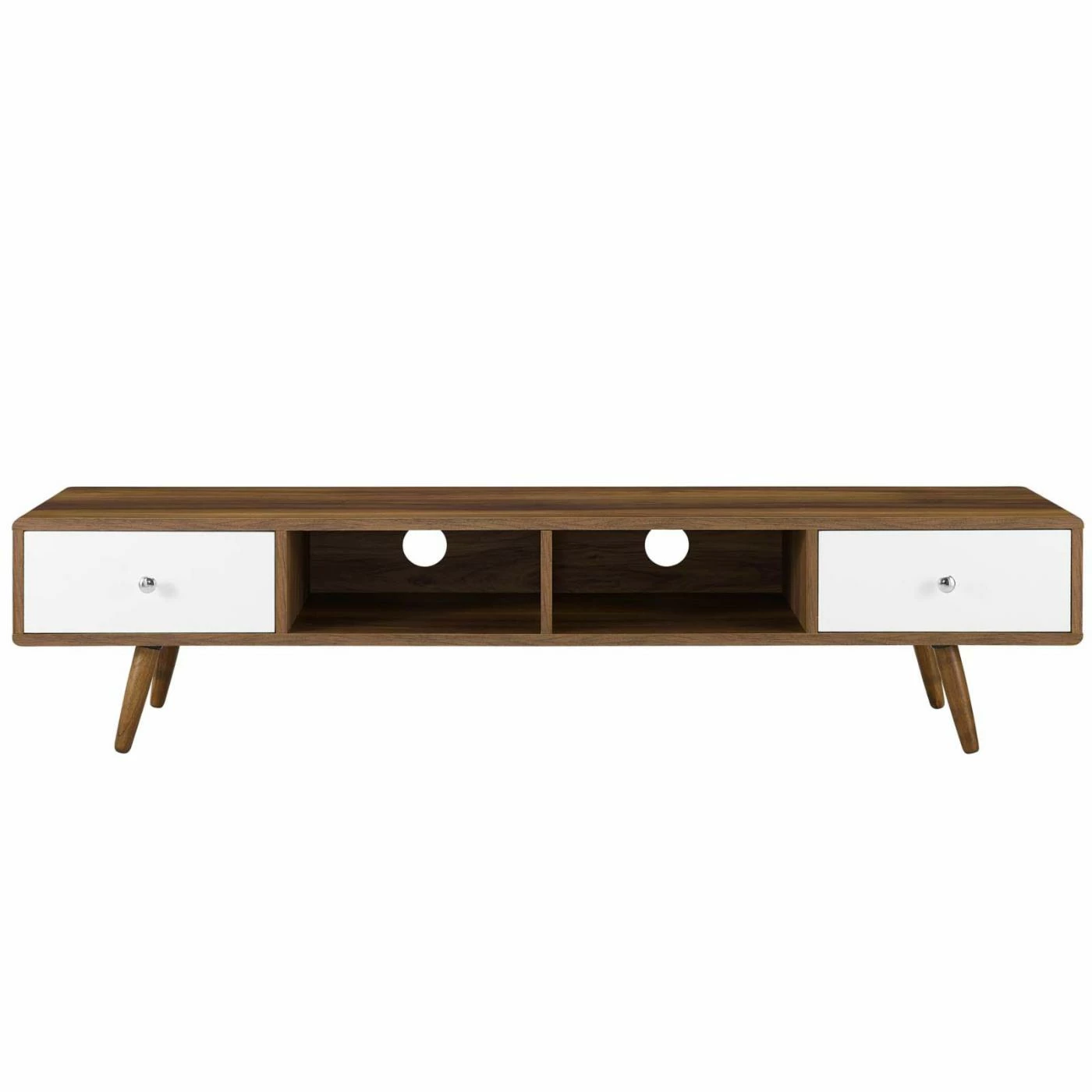 Mod lines combine with a blend of walnut and white finishes in the Modway Transmit TV Stand – Walnut / White, producing a piece worth coveting. Equipped with two full-extension glide drawers and two media storage cubbies, this TV stand will keep your media neat and tidy. Two cable management holes keep unsightly cords out of view, allowing you to appreciate the sleek mid-century appeal of this piece.