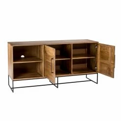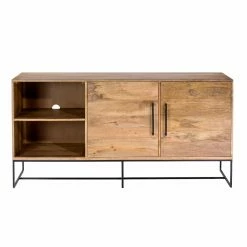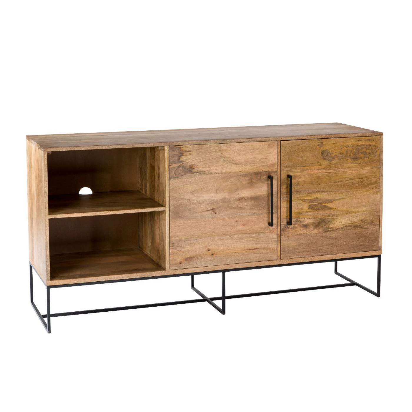 Even though your cable provider offers thousands of channels, there’s probably nothing that’s as pleasing to watch as the Moes Home Collection Colvin Entertainment Unit TV Stand. This chic piece offers thick slabs of natural-finished mango wood supported by slim and strong legs of powder-coated iron. You have six storage compartments that can easily support your cable box, gaming consoles, and various audio-visual equipment. Four of those shelves are behind solid wood doors with sleek metal pulls. Each compartment features cord-management ports to keep your cables neat and tidy.
