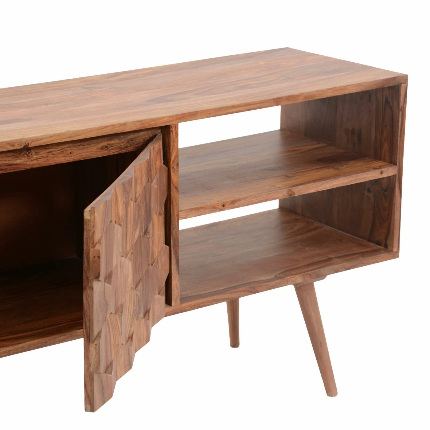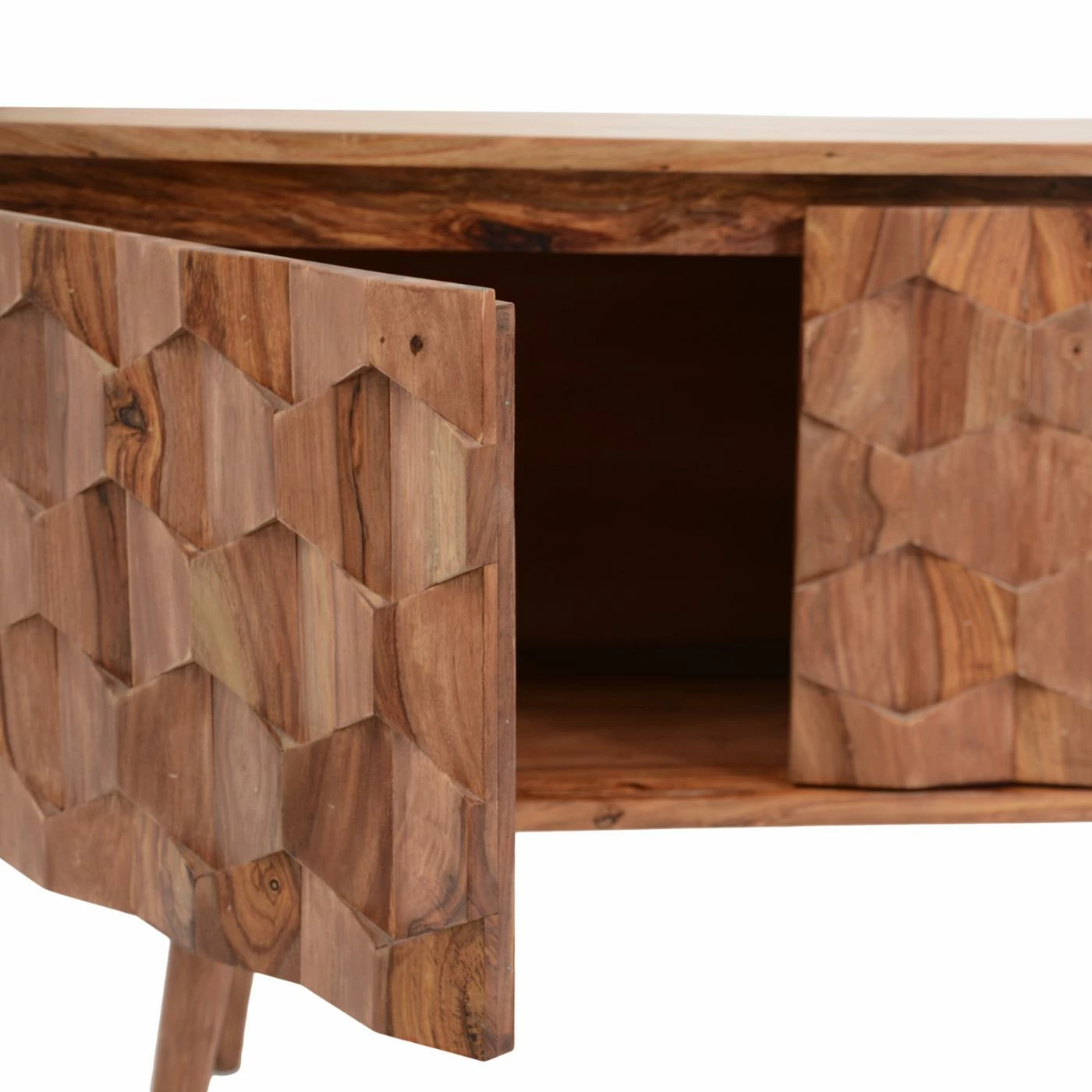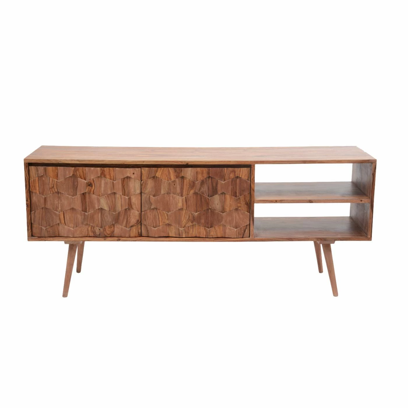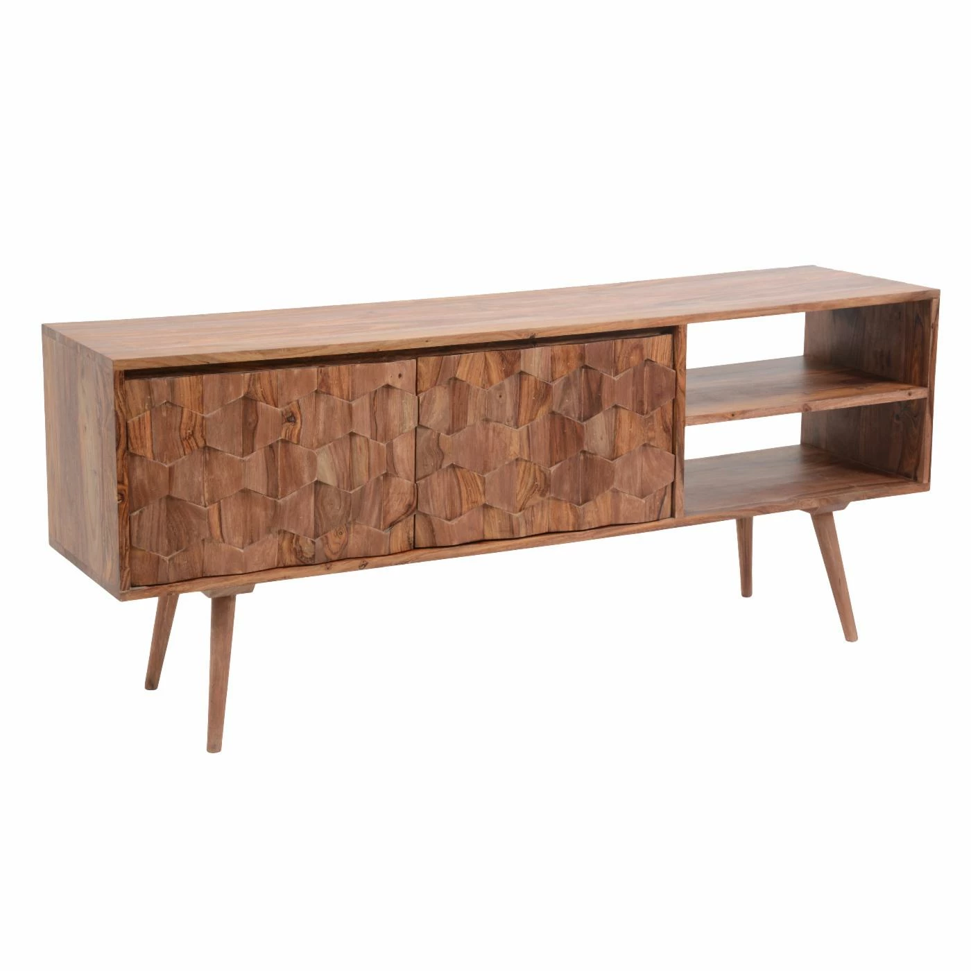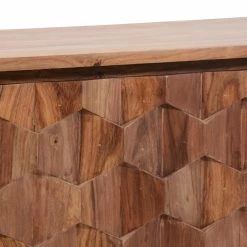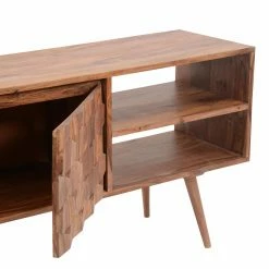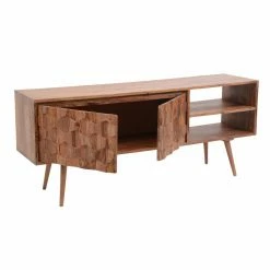 You’re sure to enjoy the good looks of the Moes Home Collection O2 Cabinet TV Stand. The body is crafted from solid sheesham wood, and that unique lumber brings the little details to life. Those undulating hexagons, the figured grain of the wide top, and those slender legs all benefit from the natural finish that makes the wood into the star of the show. Open storage compartments give you the room you need for AV components and gaming consoles, while the roomy interior offers plenty of additional storage.
