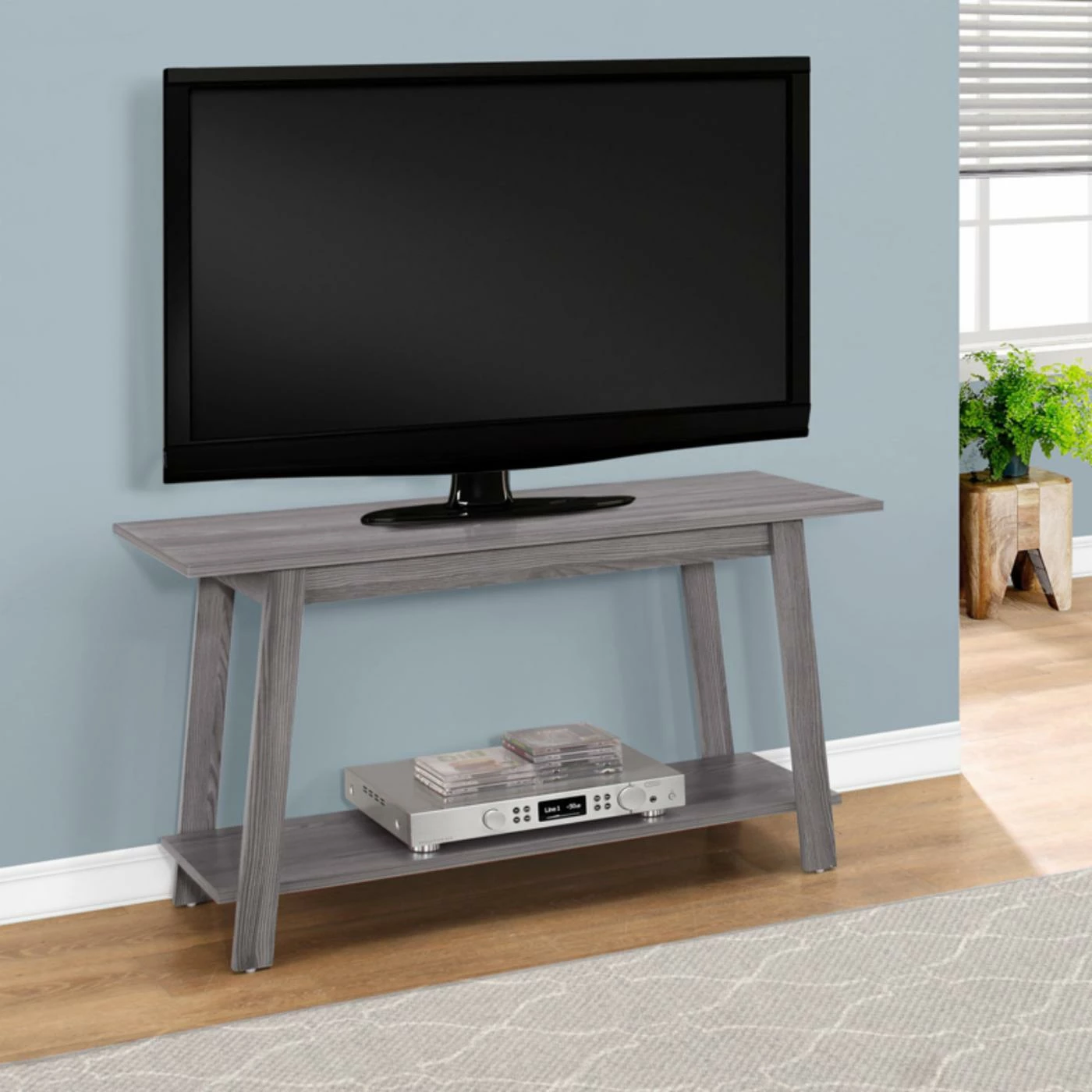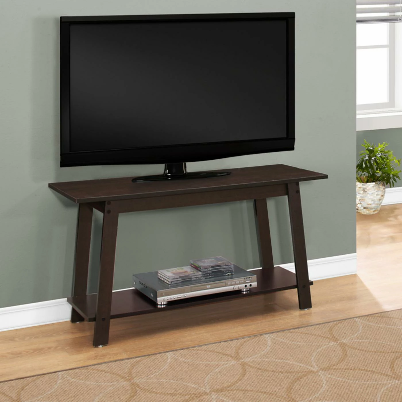 Kick back in your living room, den, or bedroom accompanied by the sleek styling and quality craftsmanship of the Monarch Specialties 42 in. TV Stand with Storage Shelf. Forest-friendly engineered wood makes use of wood waste products for a net result of fewer chopped trees and less waste going into landfills. A roomy low shelf, nestled between the angled legs, offers room for the audio visual components and gaming accessories you canβt live without.