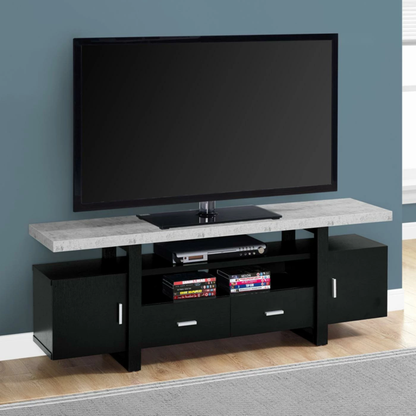 Craving a modern aesthetic? Look no farther than the Monarch Specialties 60 in. TV Stand with Enclosed Storage. This media center helps you keep your living room uncluttered with four enclosed storage areas β two cabinets and two smoothly gliding drawers. The marbled gray top mimics treated concrete, but at less weight and less cost. Thick panels of eco-friendly engineered wood are easy to assemble with the thorough, included instructions. Open shelving is available for speakers, your TiVo or RaKu, and more. Wire management portals pass through the back to keep cords and cables tidy.