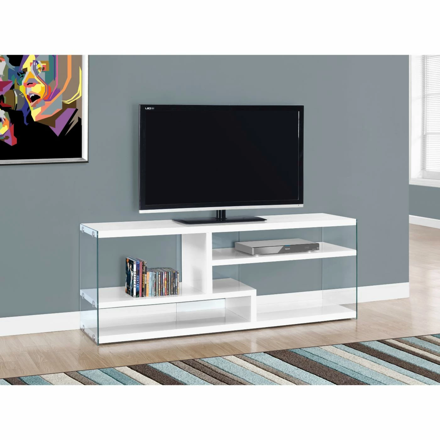Add contemporary appeal to your entertainment space with the Monarch Specialties 60 in. TV Stand with Glass Slides. This airy piece is available in your choice of finish and includes clear tempered glass sides. It features thick paneled fixed shelves for media components with a total of four open compartments.