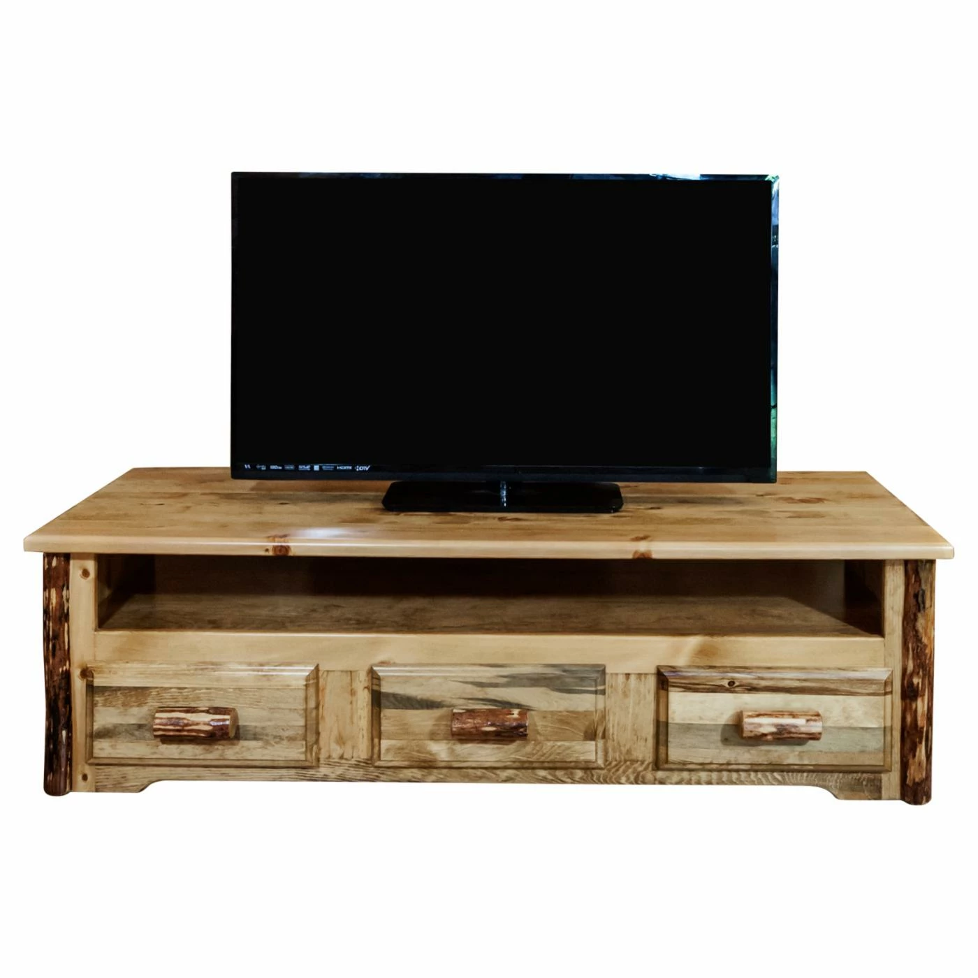 The Montana Woodworks Glacier Country TV Stand provides a low profile piece ideal for living room entertainment. This TV stand features handcrafted American-grown pine and is made in Montana, USA. Three storage drawers are located at the bottom, while open storage provides ample space for your media entertainment. A clear lacquer top coat graces this stand along with skip-peeled trim giving it a textured and natural look.