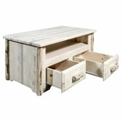 The Montana Woodworks Montana 2-Drawer Sitting Chest is a true rustic classic. This chest is sturdy enough to be used for extra seating and features an open shelf and two drawers. It’s handcrafted in Montana from solid, U.S.-grown, lodge pole pine wood and detailed with skip-peeled accents. This sitting chest is offered in your choice of available finishes.