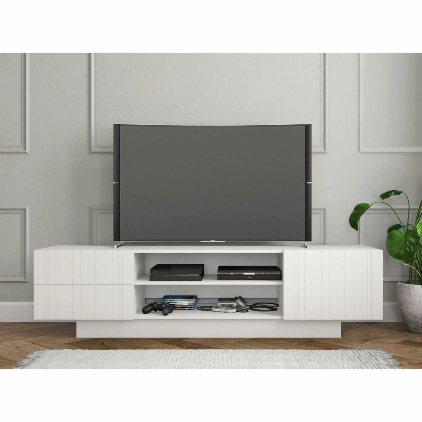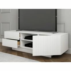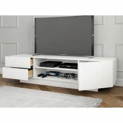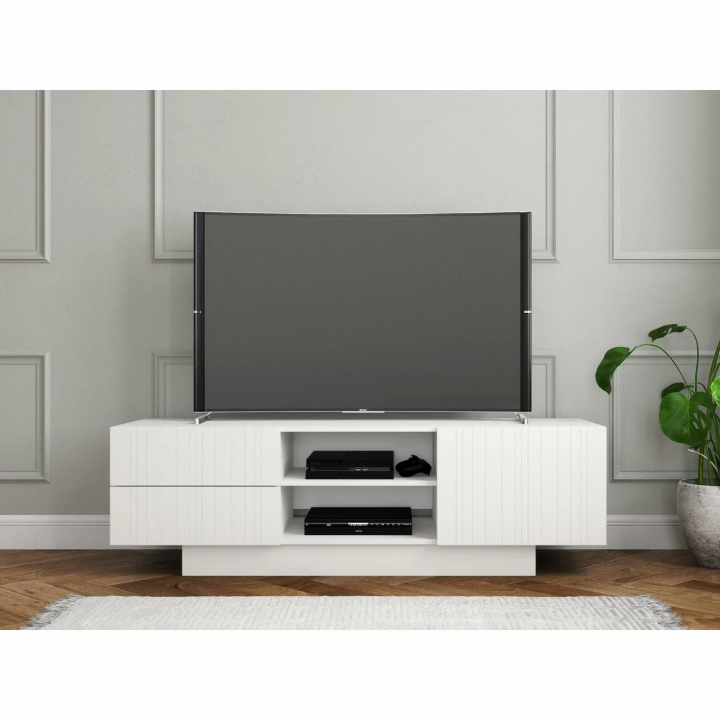 Decorated with a clean white finish and subtle linear accents, the Nexera Marble TV Stand brings a modern minimalist feel to any space. Complete with two shelves, two drawers, and one cabinet, the design offers ample space for storage and display. The sturdy engineered wood construction comes in size options, making it easy to find the perfect TV stand for your home.