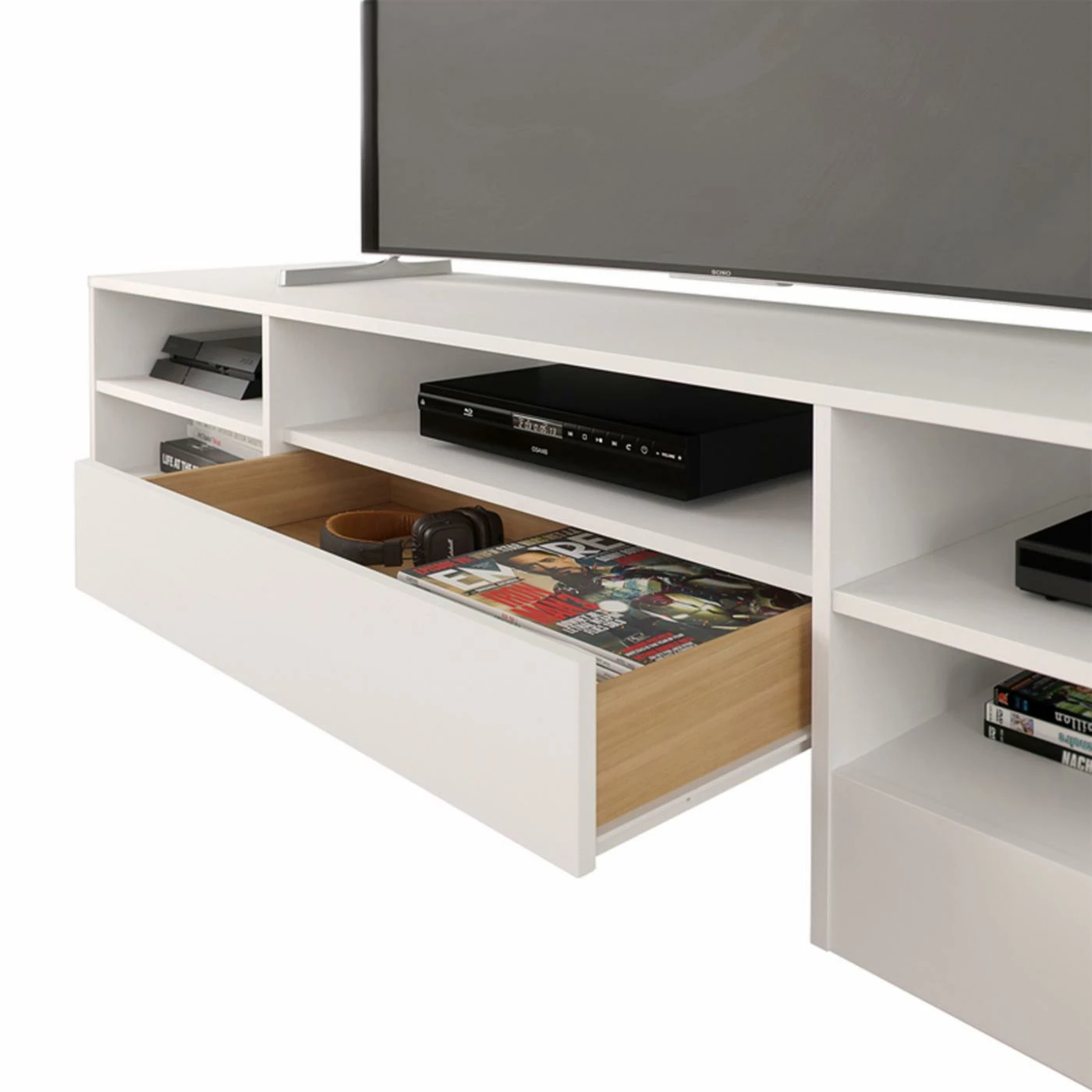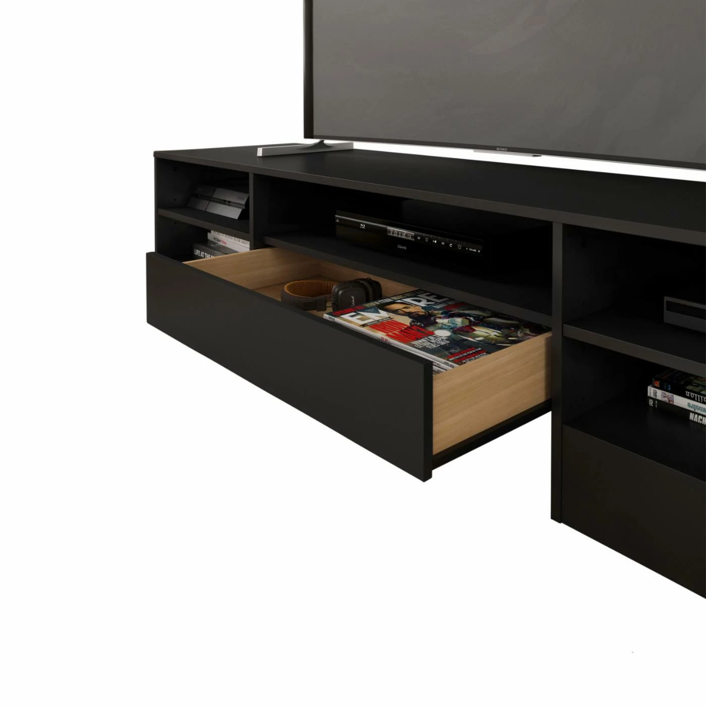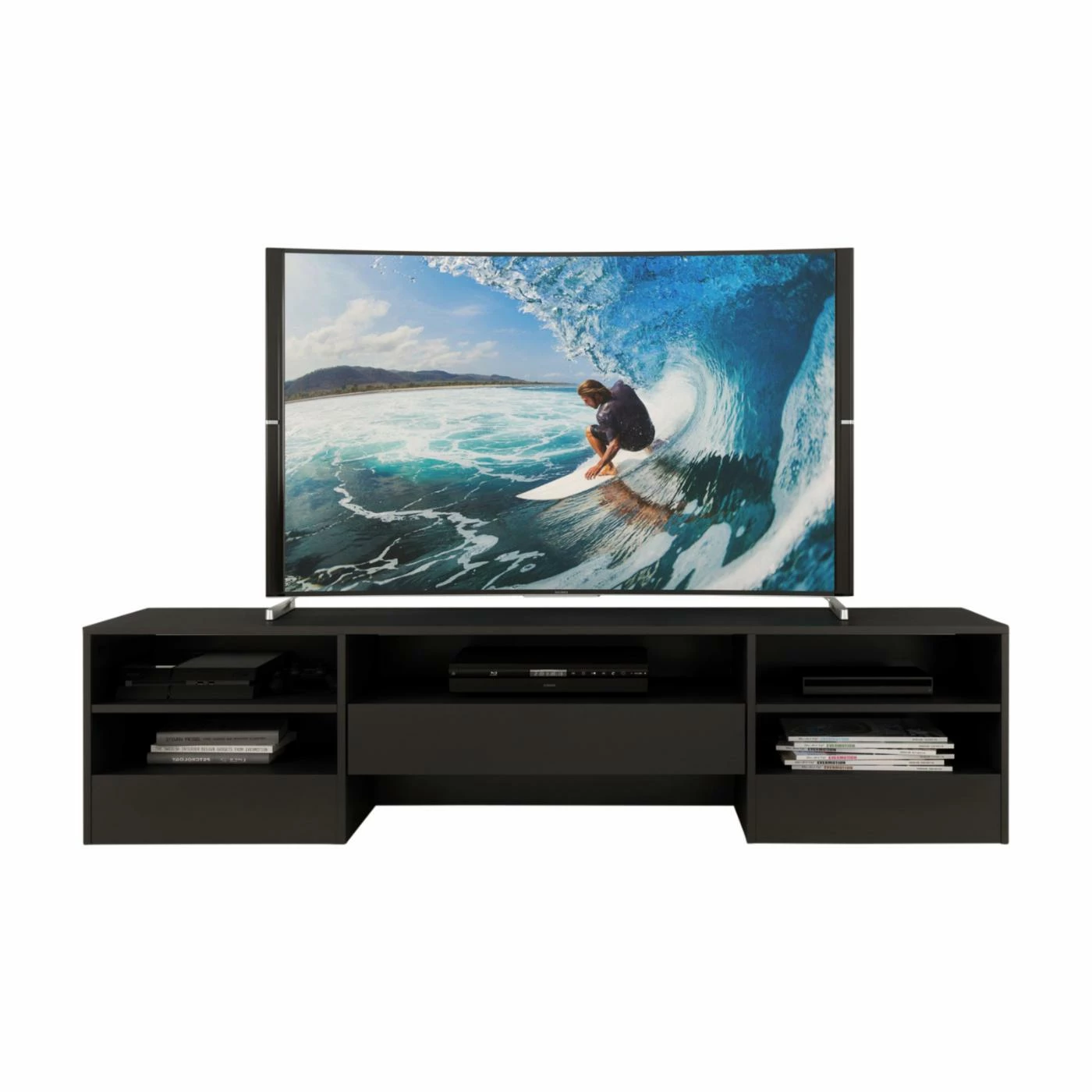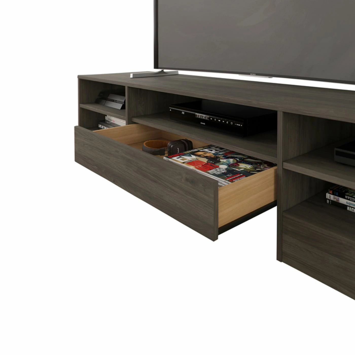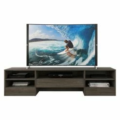 With a sleek and stylish design, the Nexera Rustik 72 in. TV Stand – Truffle is a style statement that just happens to provide storage solutions. Practical considerations include an open back panel for cable management and ventilation, an enclosed drawer space for storage, and an open shelf space for display. The clean lines and dark finish create a look that will ground any space in a modern aesthetic.