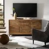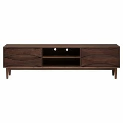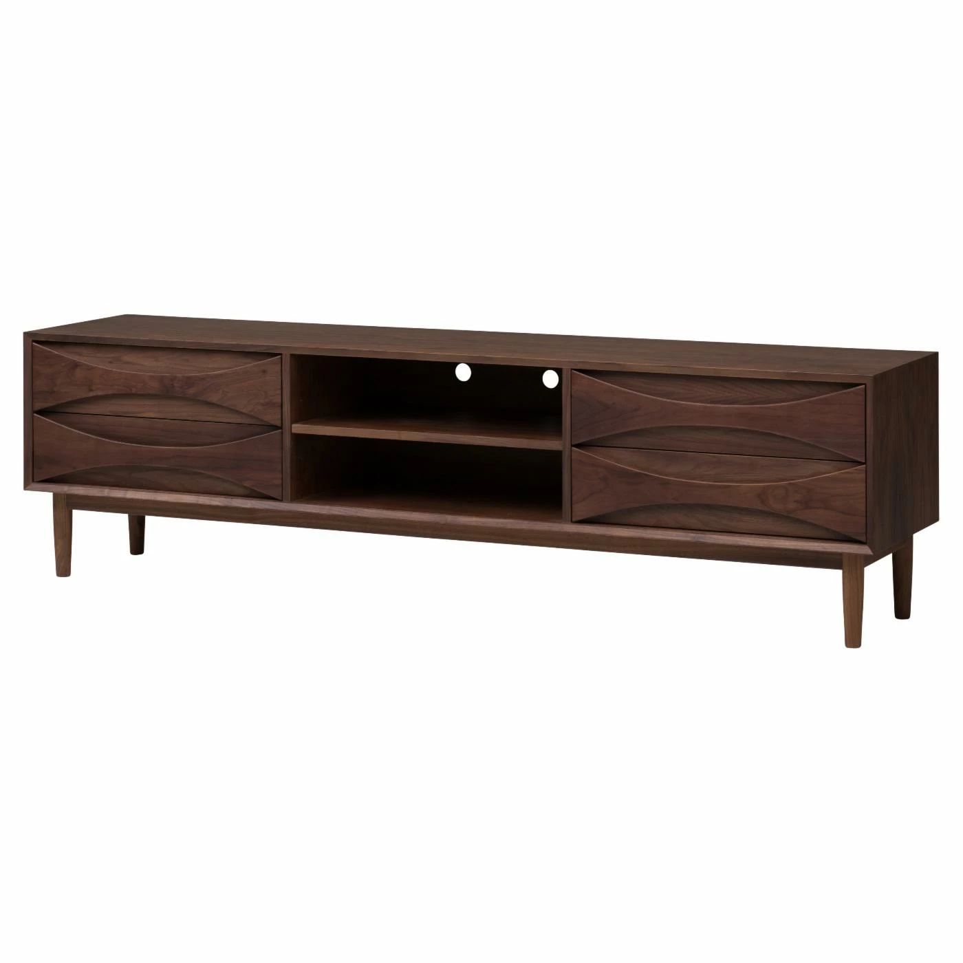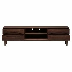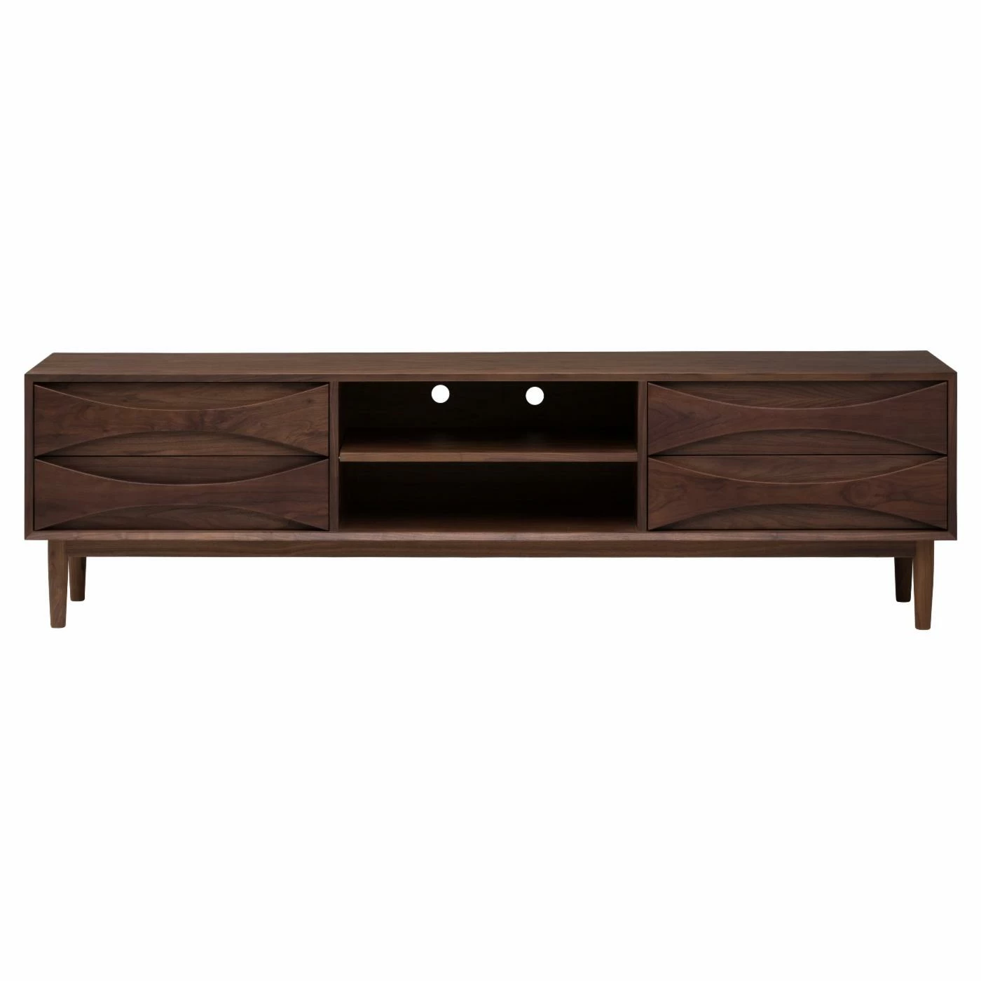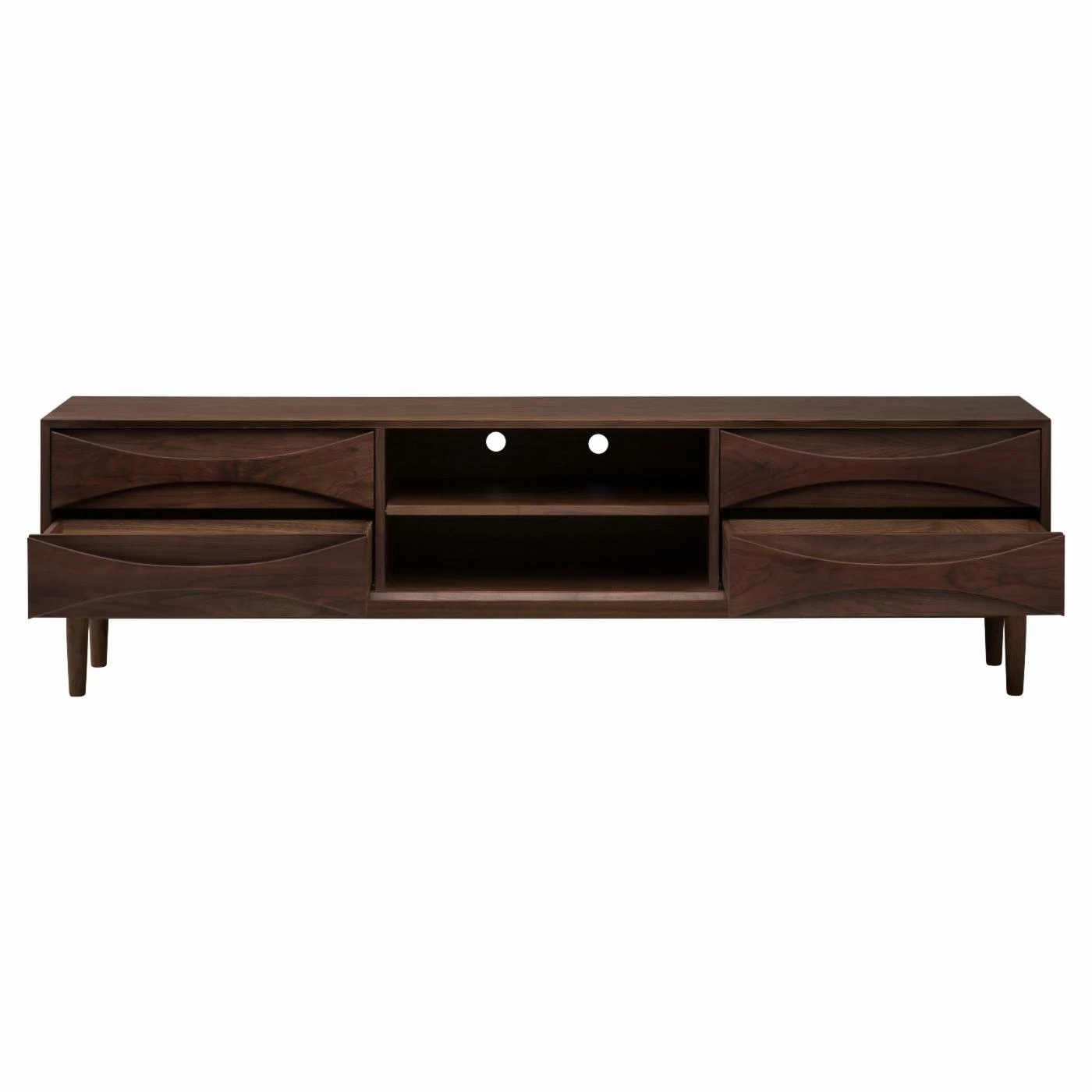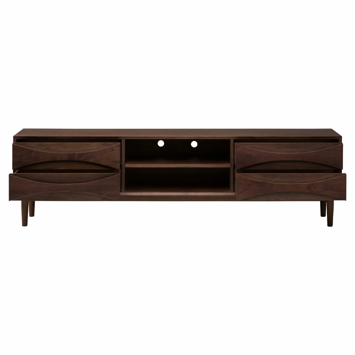 For an updated take on a Mid-century design, the Nuevo Adele Media Cabinet offers carved drawer fronts and tapering post legs. This media cabinet is generously scaled and fits up to a 65-inch wide TV screen on top. The open shelf with two cord management holes at the back make this cabinet perfect for housing media components. The four drawers boast a carved elliptical design. This media cabinet is made of wood in a versatile walnut finish.