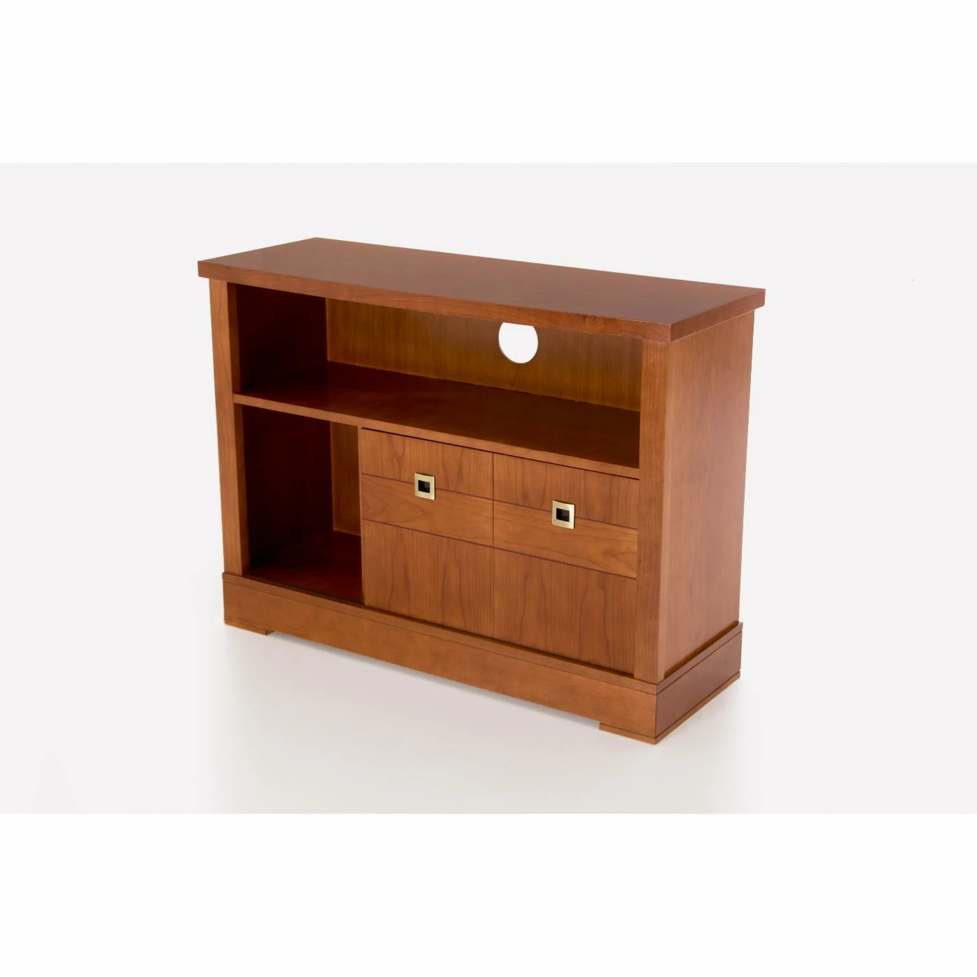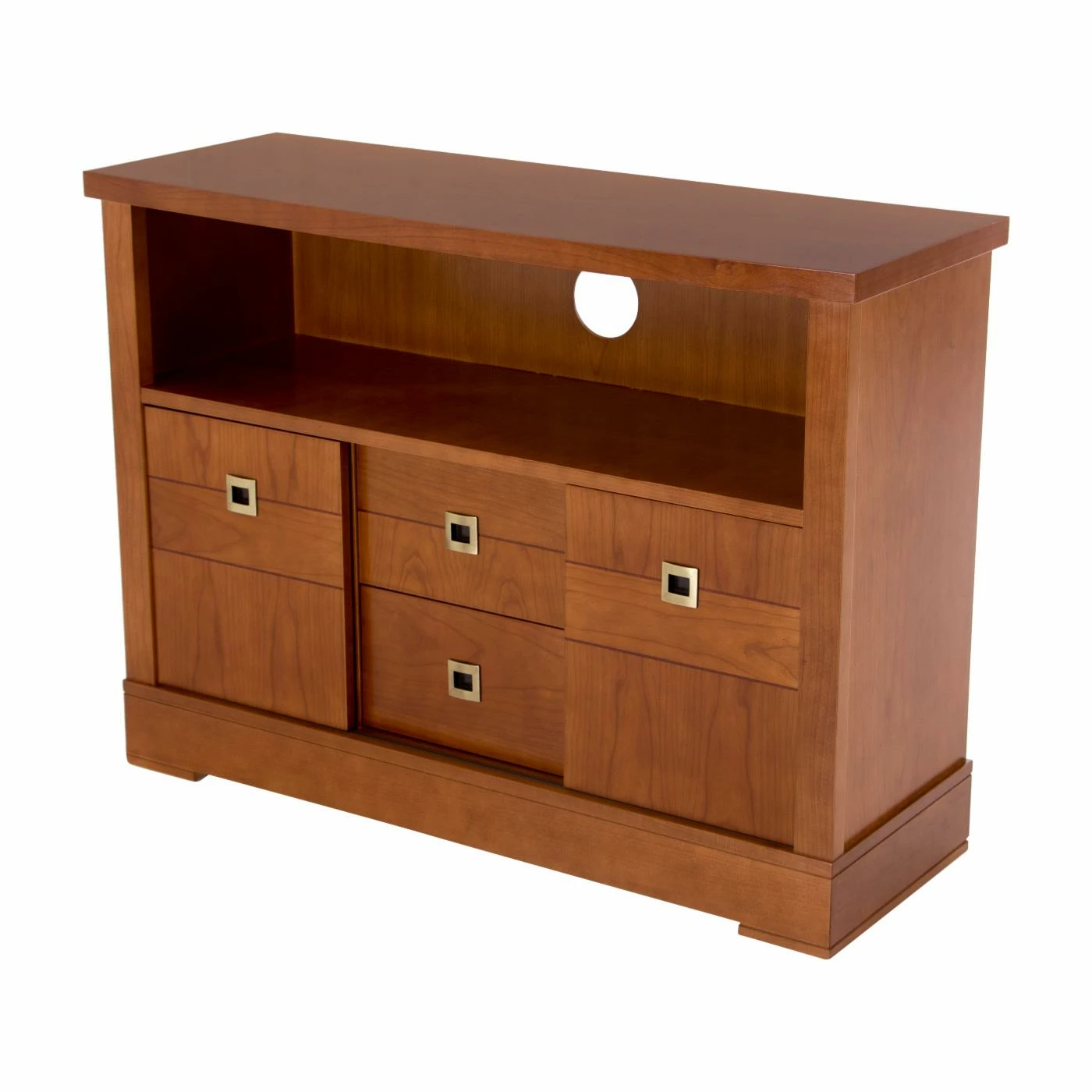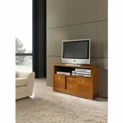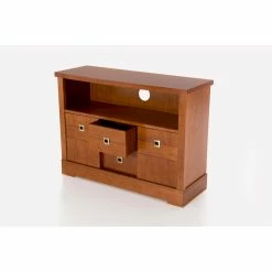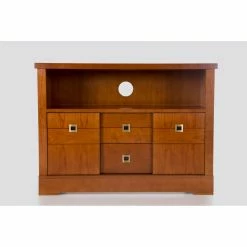 Offset your modern television a smart transitional complement with the Panamar Ellen Solid Wood TV Stand – Cherry. This TV stand comes built from long-lasting wood with a timeless cherry brown finish. The spacious top is ideal for TVs both large and small. Below, an open console shelf provides a perfect spot to install a stereo receiver, cable box, video game system, and more. Two drawers and two sliding-door cabinets are incorporated into the base, offering concealed storage. Brushed-nickel square metal handles outfit the piece.
