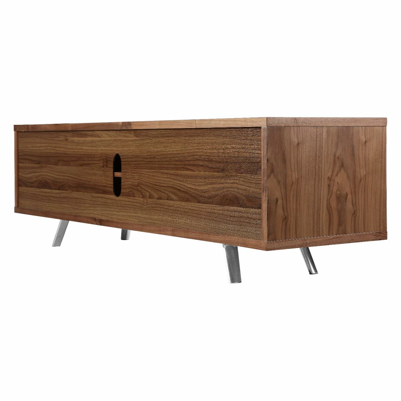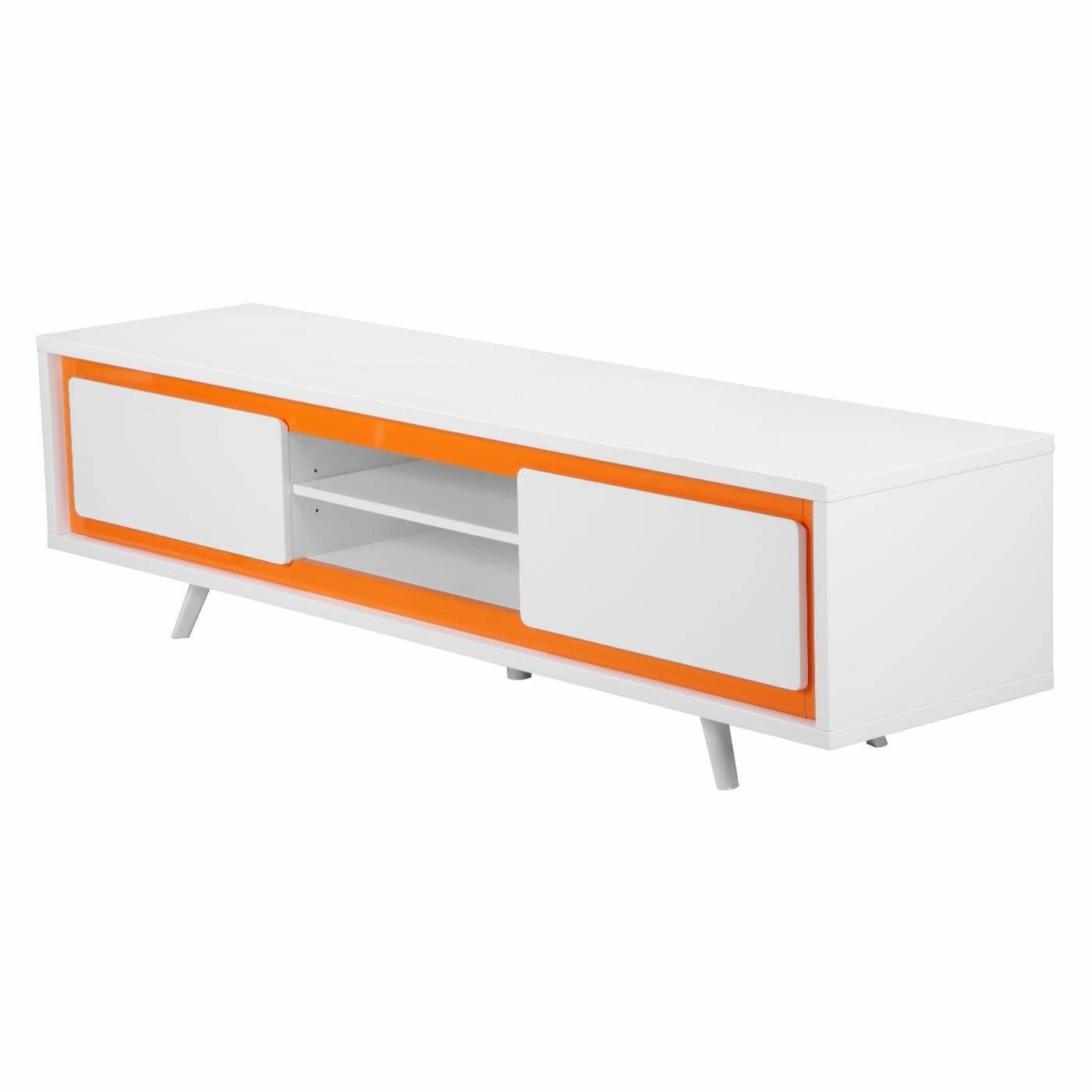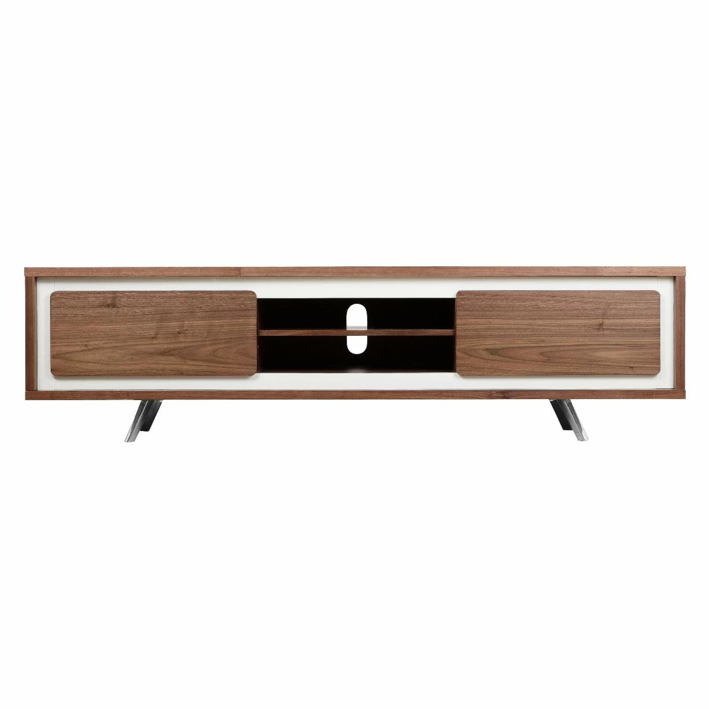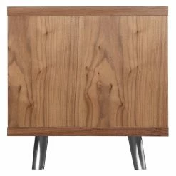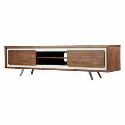 Enliven your interior with the retro mod stylings of the Pangea Home AVA TV Stand. This spunky, streamlined piece is made with steel, select woods, and veneers finished with a high-gloss lacquer that oozes a futuristic charm. You can customize the color from a range of options, including black, green, orange, and walnut. Two sizes, a 59-inch and a 71-inch, are available, and depending on your choice, you’ll get 1-2 pull-out drawers and 1-2 open shelf compartments, each allowing for easy organization and display of your media devices. A convenient cord hole in the back allows for hassle-free management of all your wires.