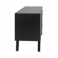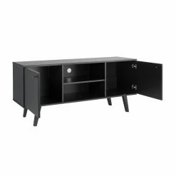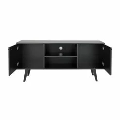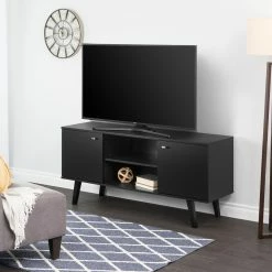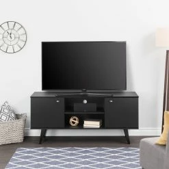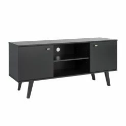 Get ready for a night in when you have the Prepac Milo 56 in. TV Console to support your electronics. This wide TV console table is a great way to store not only your television, but your video gaming systems. A convenient cut out in the back of the console is great for cord management, and two open shelves in the center of this table mean you won’t have to worry about remotes and controllers connecting with devices. On either side of the open shelving are two closed cabinets for storing games, movies, and anything else you’d prefer to stay behind a door. Details like brass knobs and tapered legs elevate this table to a classic retro sensibility. Some assembly required.